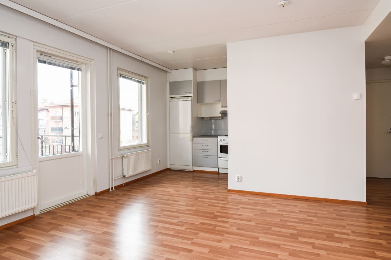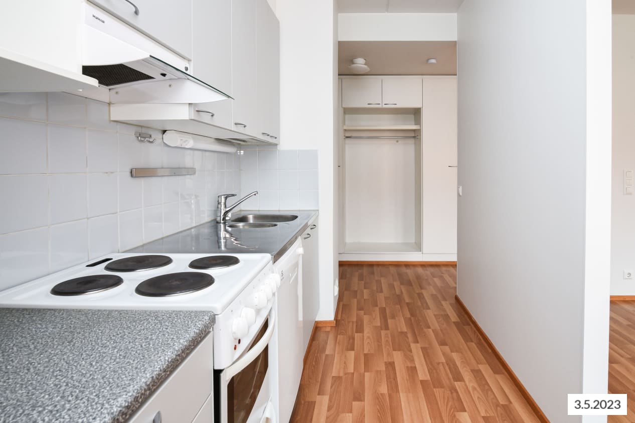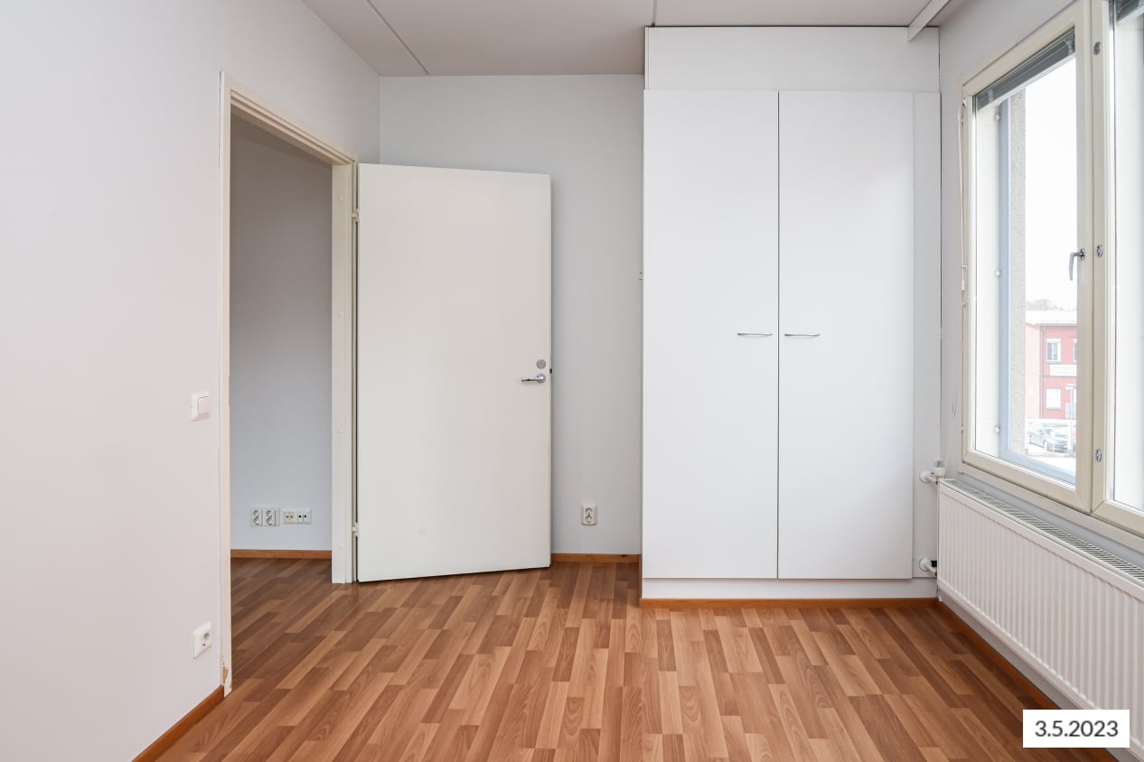 The compact one-bedroom home's highlights include a sauna with a window and a cosy layout. The living room and kitchenette form a spacious open area, while the bedroom is located in a quiet corner. The balcony opens from the living room towards the northeast, overlooking the playground.