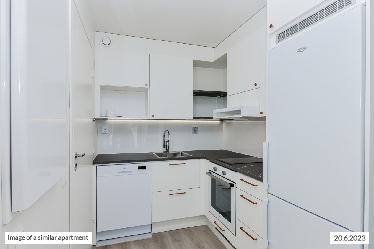 The timeless surface materials of this home provide a neutral backdrop for your personal decor style. The floors are done in pale oak-effect laminate and the walls are painted in a pale shade. The windows are fitted with white Venetian blinds. The classy kitchen has white cabinets with simple, copper-toned pulls. The backsplash is in pale laminate or stainless steel and the countertops are in grey laminate. The fully equipped kitchen has an induction cooktop, built-in oven, cooker hood, dishwasher and fridge-freezer. There is also space for a microwave. This kitchen is a joy to cook in!
