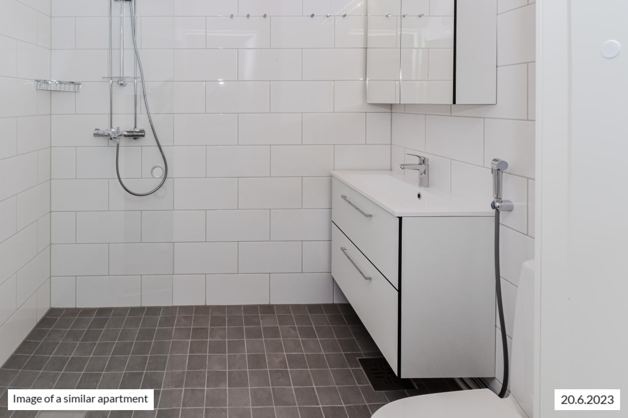 Guaranteed to uplift your everyday life, there is a sparkling new home spa with walls done in white and the floor in grey tiles. The efficiently laid out bathroom has space for your washing machine too.