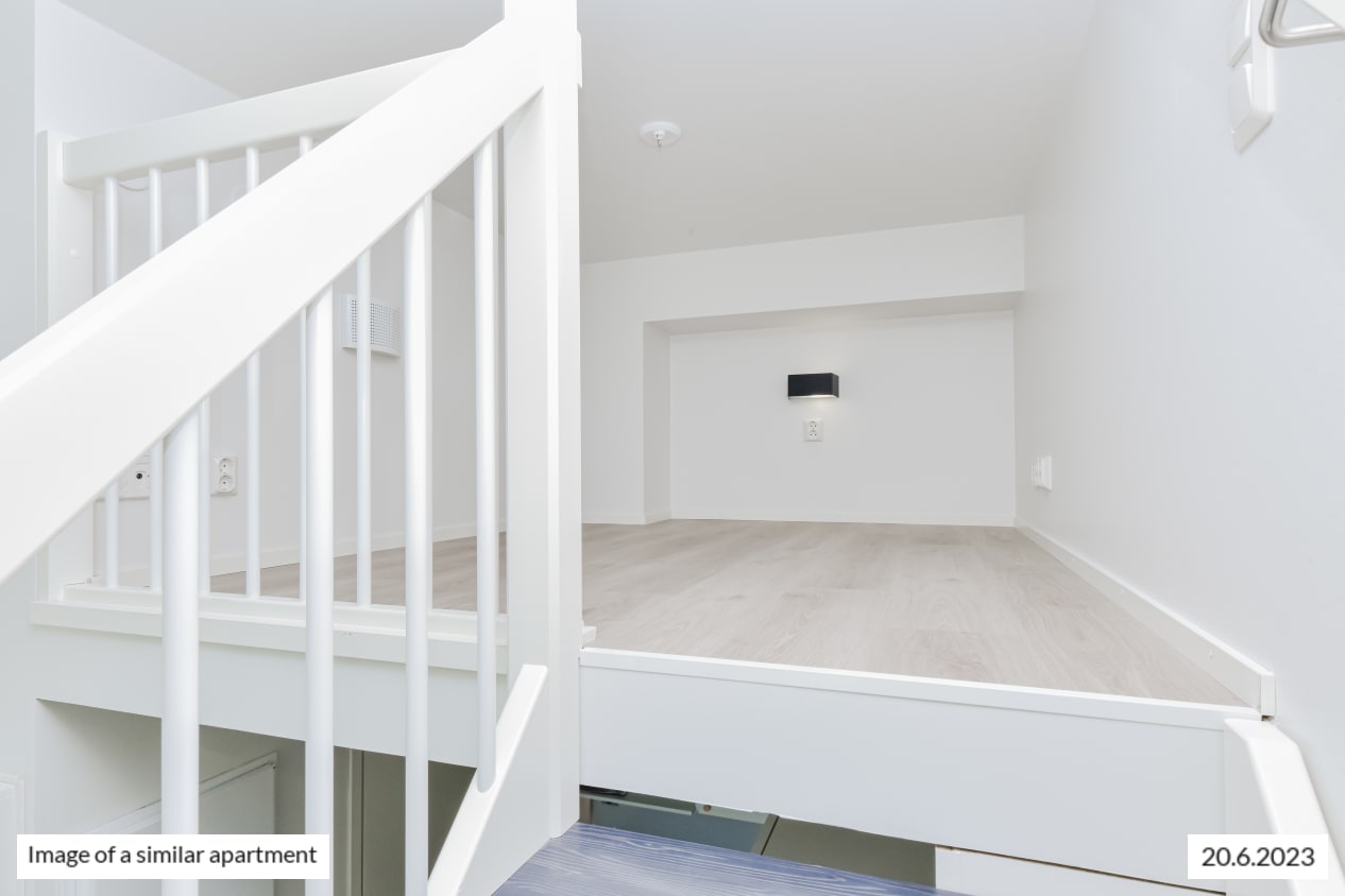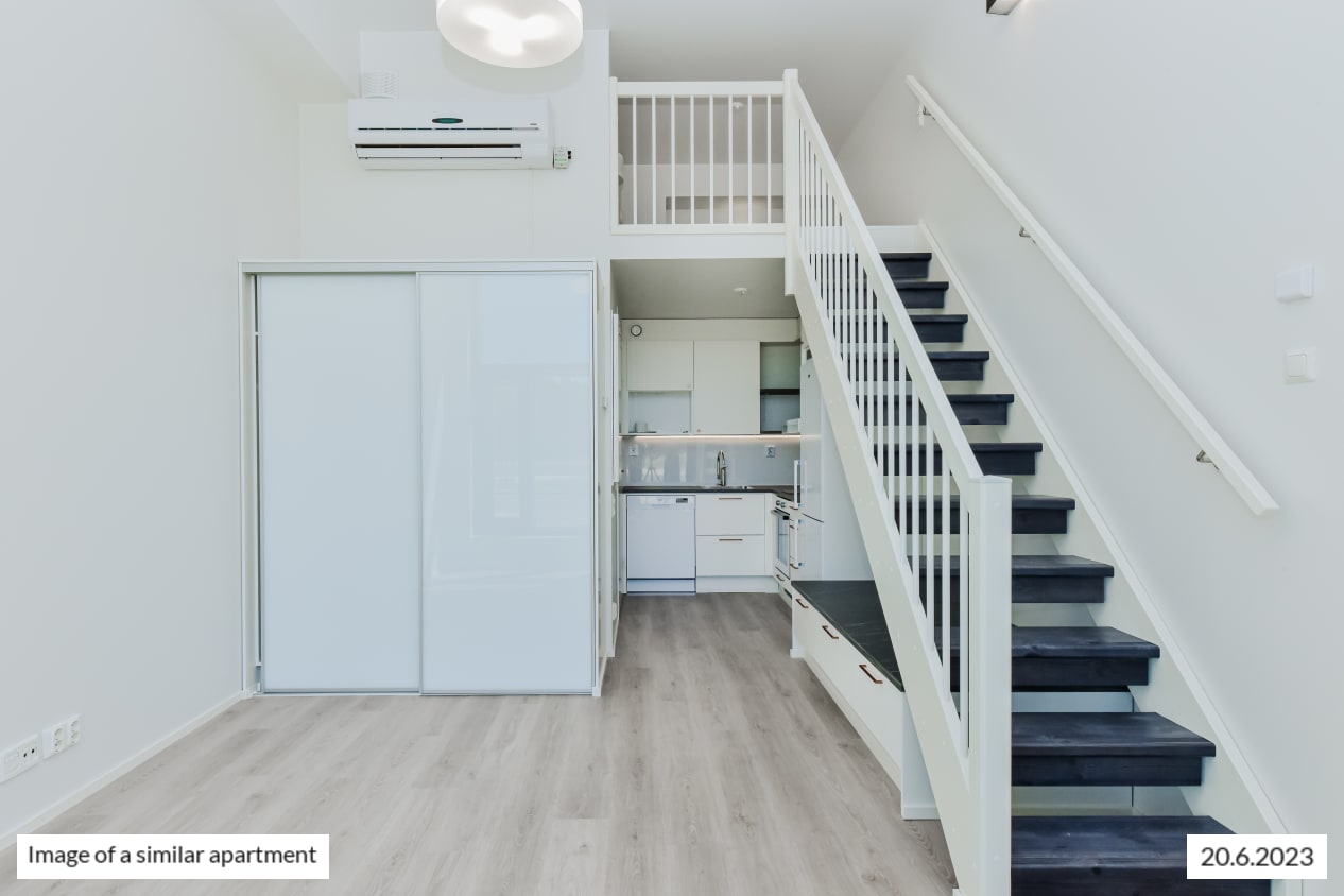 A home for those who appreciate an airy space! This light-filled loft-style studio works as a home as well as a business space. The lounging area has high ceilings reaching well over three metres. The functional kitchen is slightly separate from the living room. There is a loft above the kitchen that can be used for storage or perhaps as a sleeping area. The space under the loft stairs features a cosy bench also providing storage space. This charming little home offers views of the building grounds.