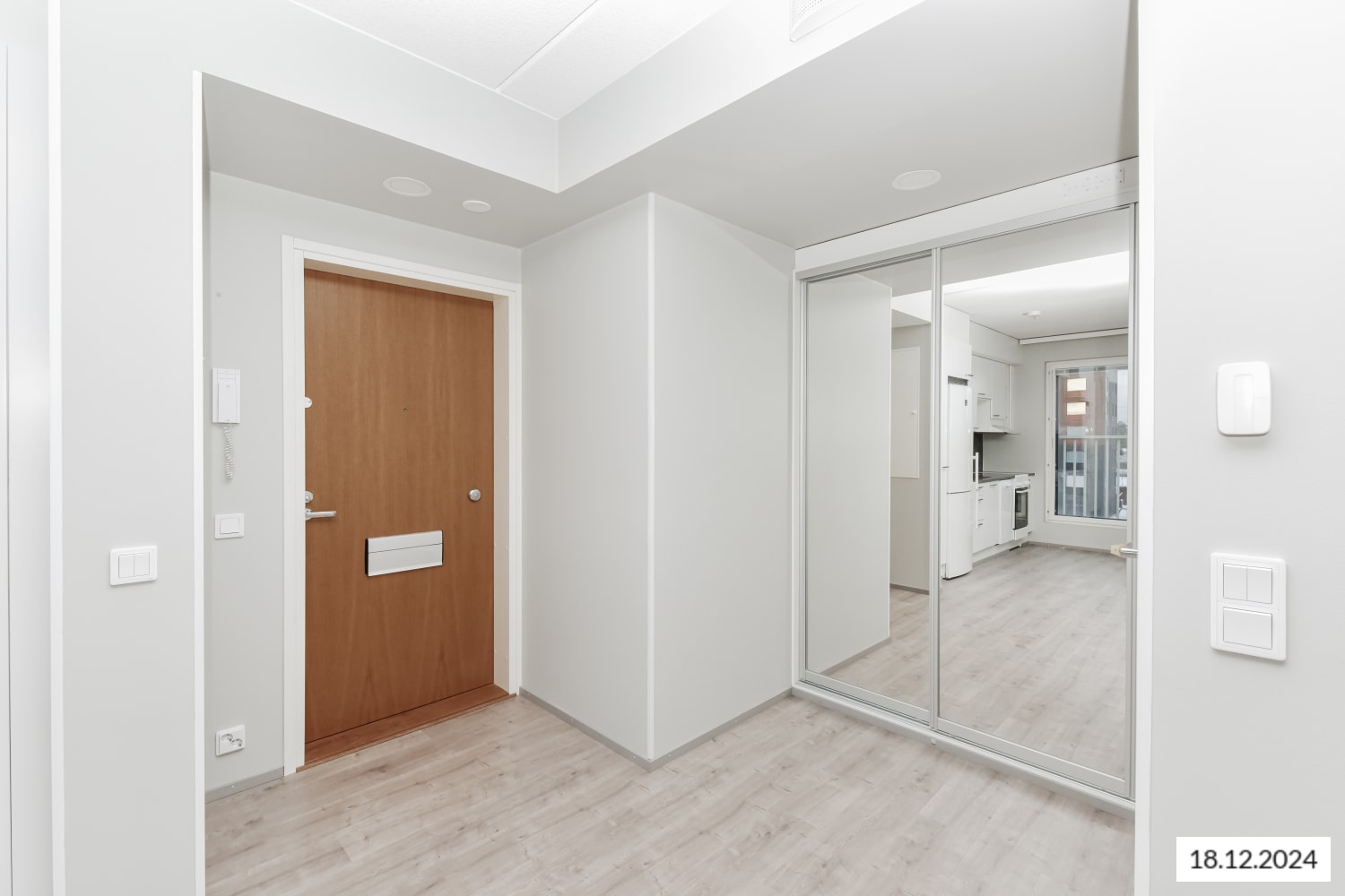 The floors are gray-toned oak laminate, and the walls are painted a soft gray to complement the flooring. The windows are fitted with white blinds, and the entryway has mirrored cabinets for added storage.