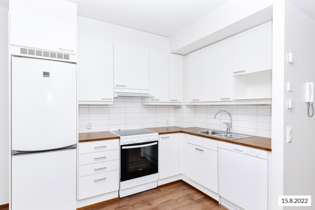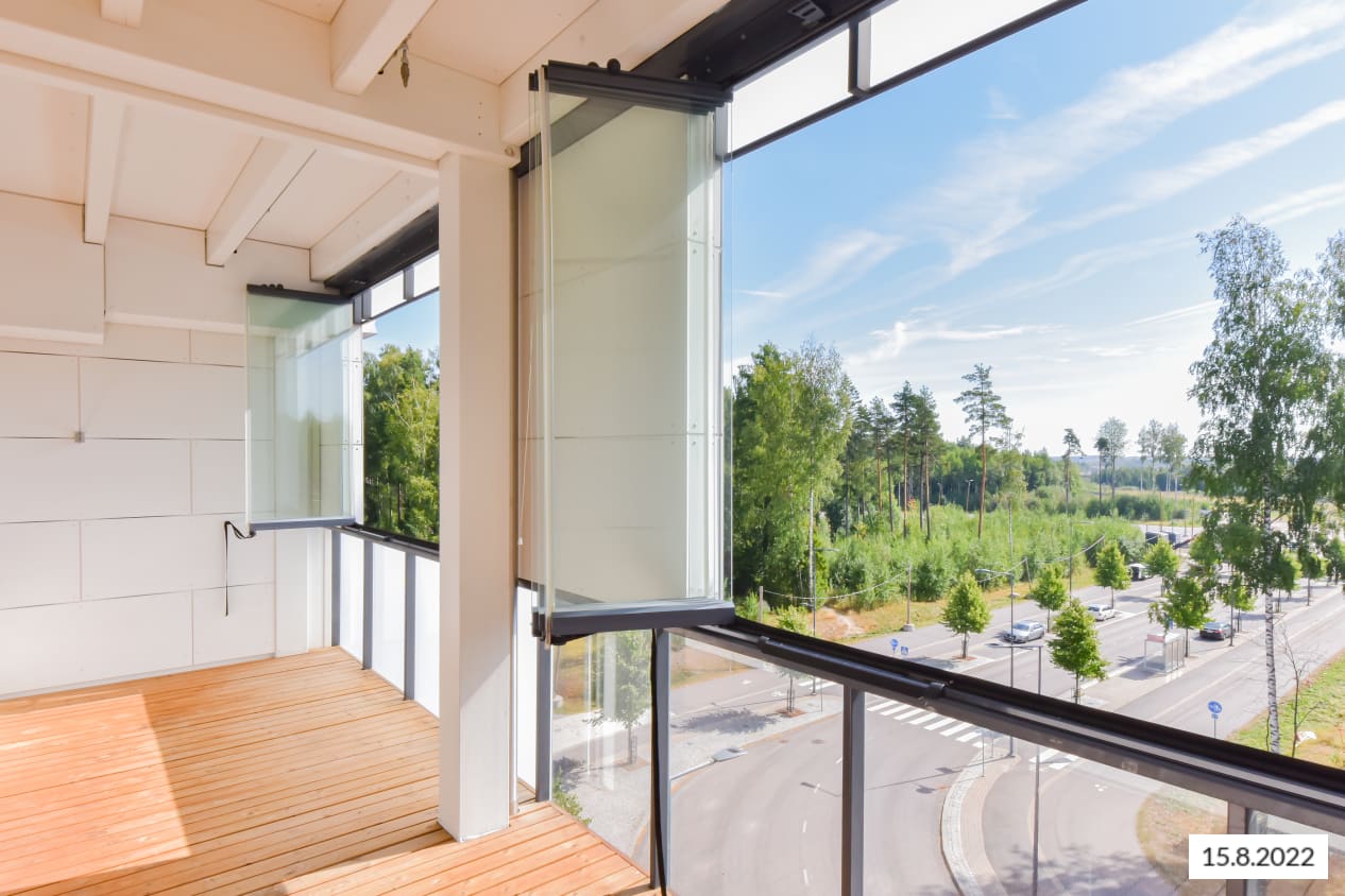 This modern wooden apartment building with a warm feel was built for the 2015 Housing Fair. The apartment surface materials are classy and the colour scheme light. The non-wet room floors are laid in easy-care laminate. Kitchen unit doors and appliances are fresh white in colour, and the worktops are in wood-effect laminate. The spacious bathrooms are tiled and have space and hookups for a washing machine. All apartments have a glassed-in balcony.