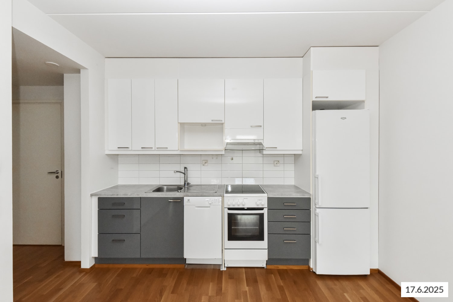 This cosy one-bedroom home is compact and convenient. The space formed by the kitchenette and living room can be easily arranged with furniture, and a dining table fits naturally against the wall opposite the bathroom. The glazed balcony with glass railings opens towards Laajaniitynaukio.