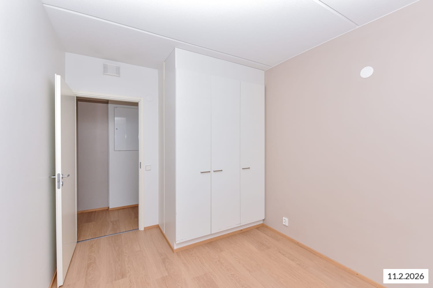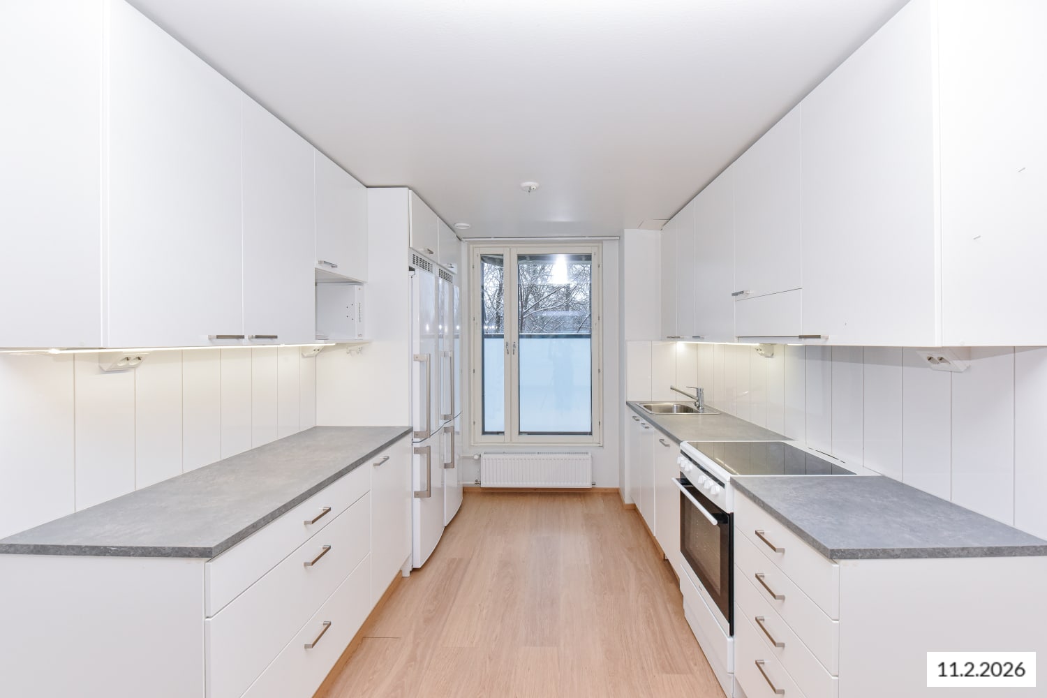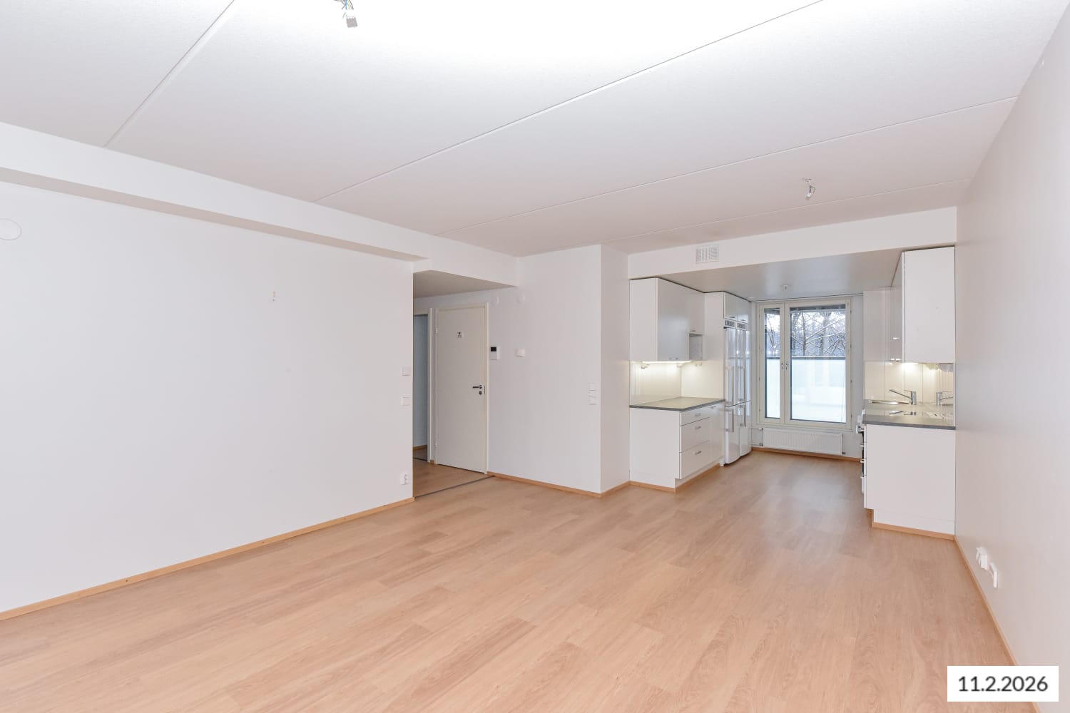 The flooring in the living areas is laminated with a bleached oak tone. The white-painted walls are complemented by a subtly grey accent wall. In the kitchen, the cabinet doors are white, and the handles are brushed chrome. The space between the upper and lower cabinets is tiled with glossy white tiles. The worktop is laminated in concrete grey. The kitchen is equipped with a ceramic hob, dishwasher, and freezer-refrigerator.