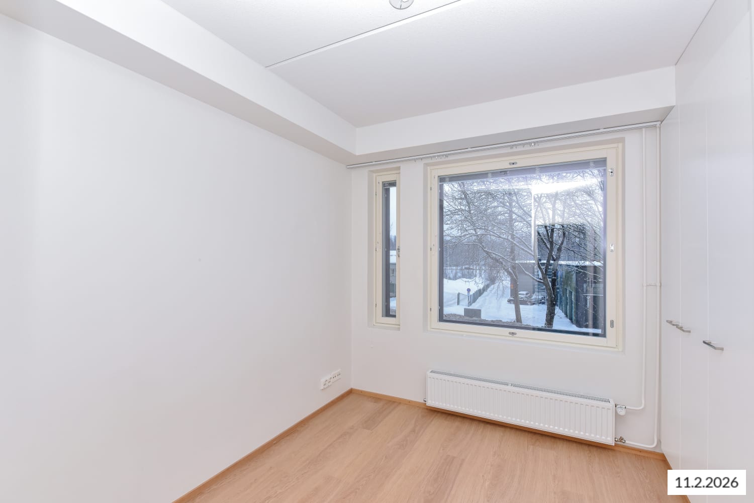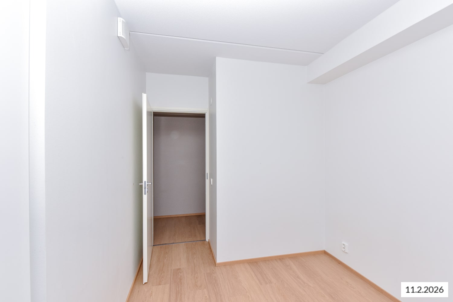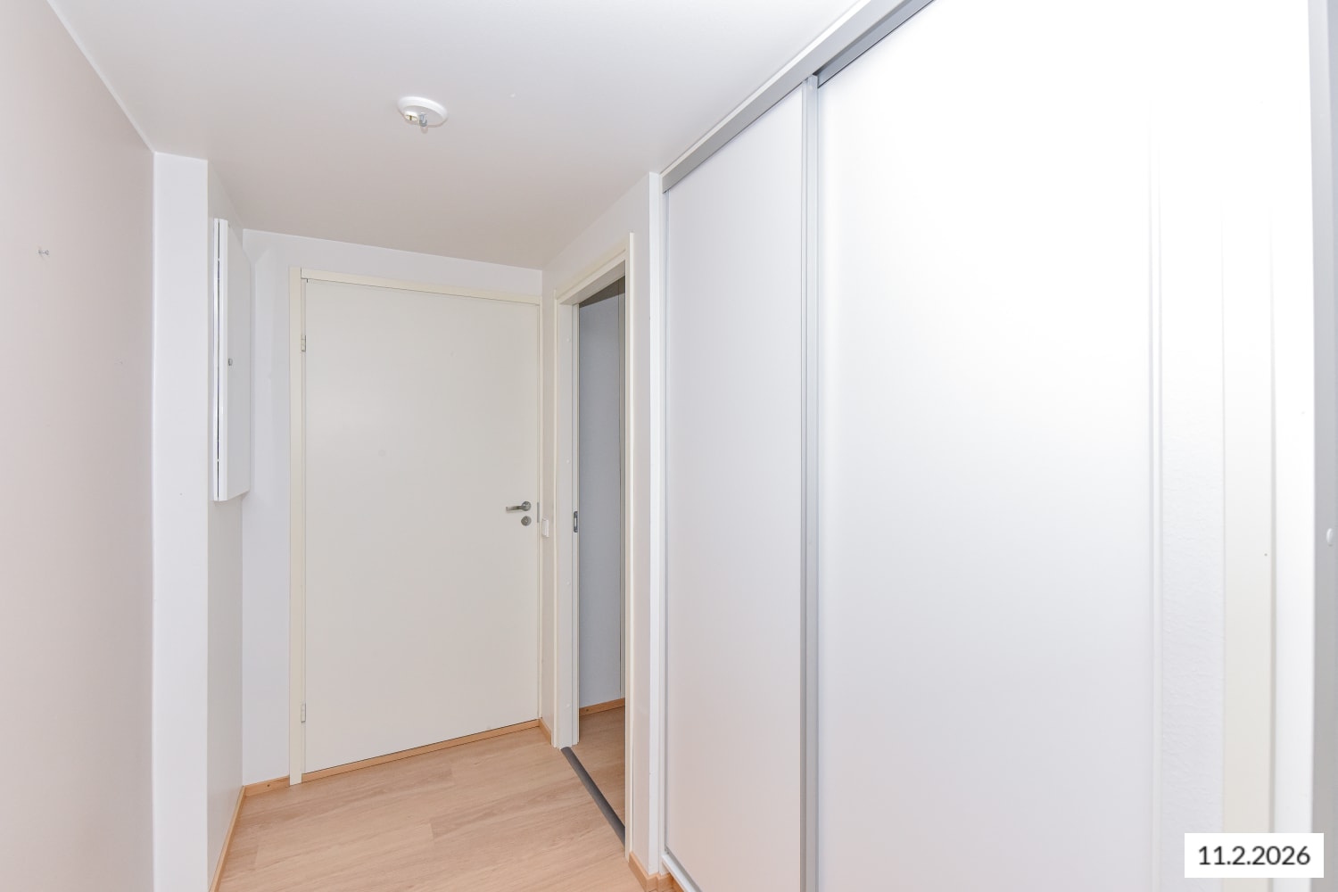 The flooring in the living areas is laminated with a bleached oak tone. The white-painted walls are complemented by a subtly grey accent wall. In the kitchen, the cabinet doors are white, and the handles are brushed chrome. The space between the upper and lower cabinets is tiled with glossy white tiles. The worktop is laminated in concrete grey. The kitchen is equipped with a ceramic hob, dishwasher, and freezer-refrigerator.