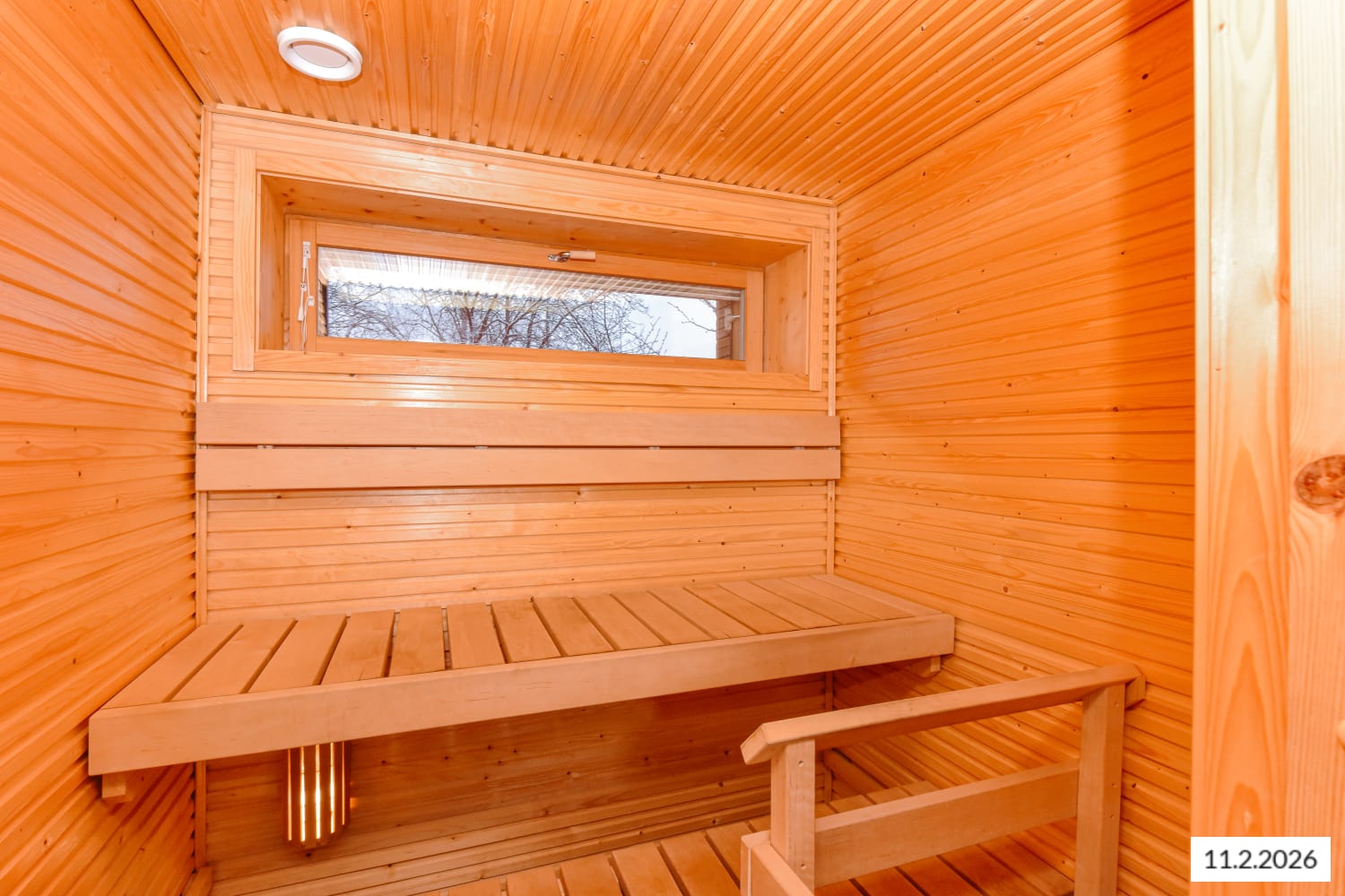 The open kitchen, dining area, and living room in this light-toned two-bedroom home create a spacious living area that can be easily furnished to reflect the resident's style. The sauna's wide window enhances the roominess and comfort. Your own garden terrace is perfect for a pot gardener's oasis or a leisurely coffee spot.