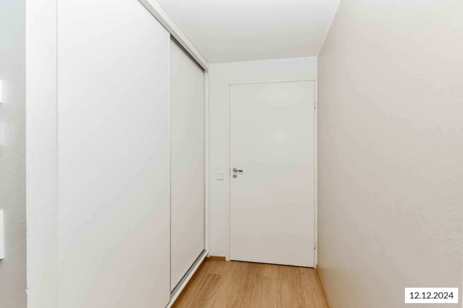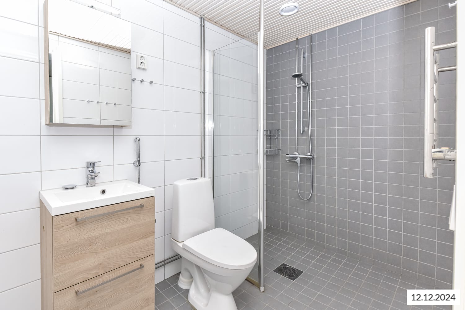 In the bathroom, the walls are mostly tiled in white. The accent wall and the floor are grey. The floor heating under the tiles pampers your feet. There is a provision for a washing machine and tumble dryer.