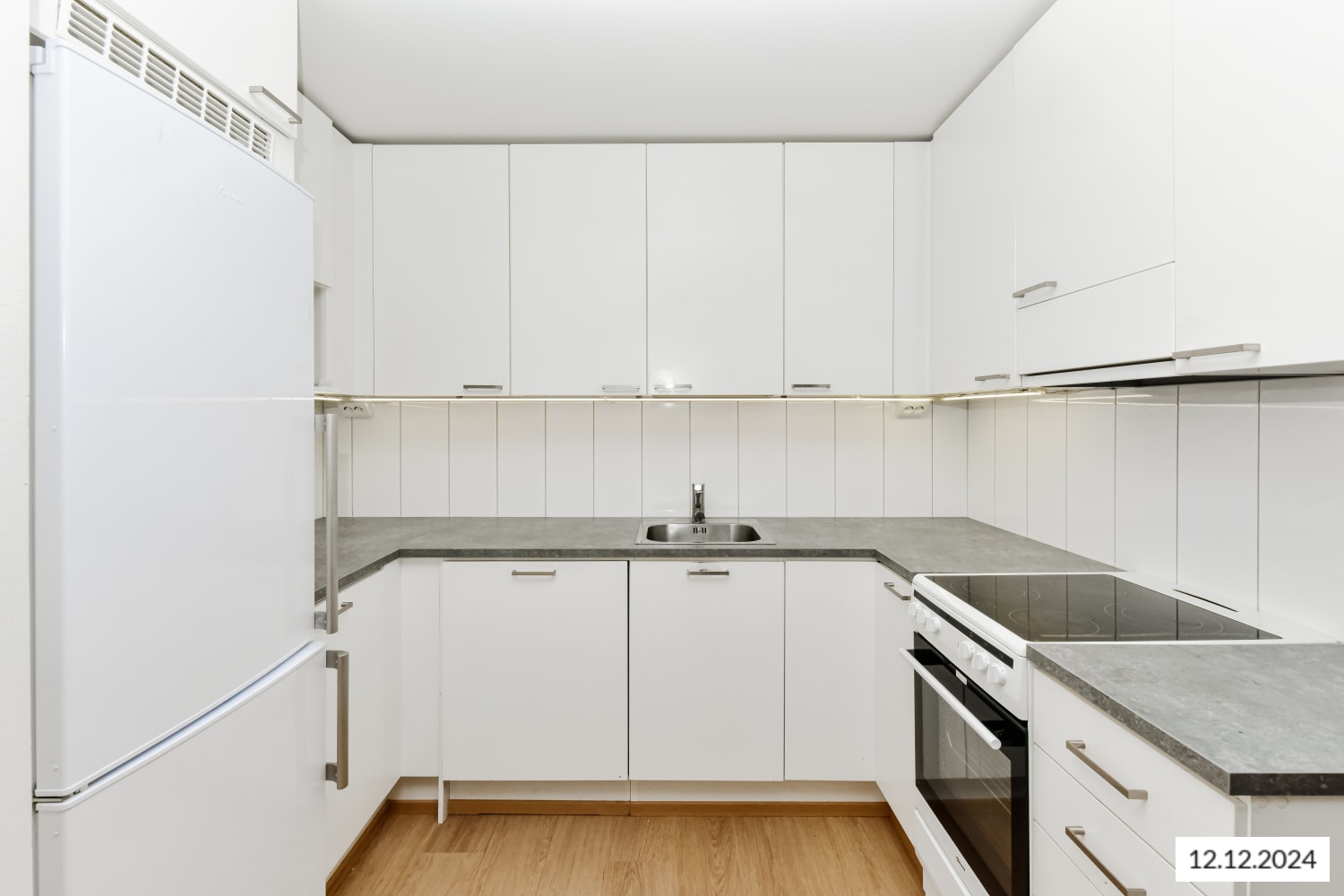 In the kitchen, the cabinet doors are white with brushed chrome handles. The space between the upper and lower cabinets is tiled with glossy white tiles. The worktop is laminated in concrete grey. The equipment includes a ceramic hob, dishwasher, and freezer-refrigerator.