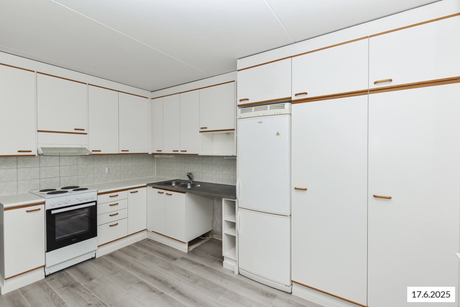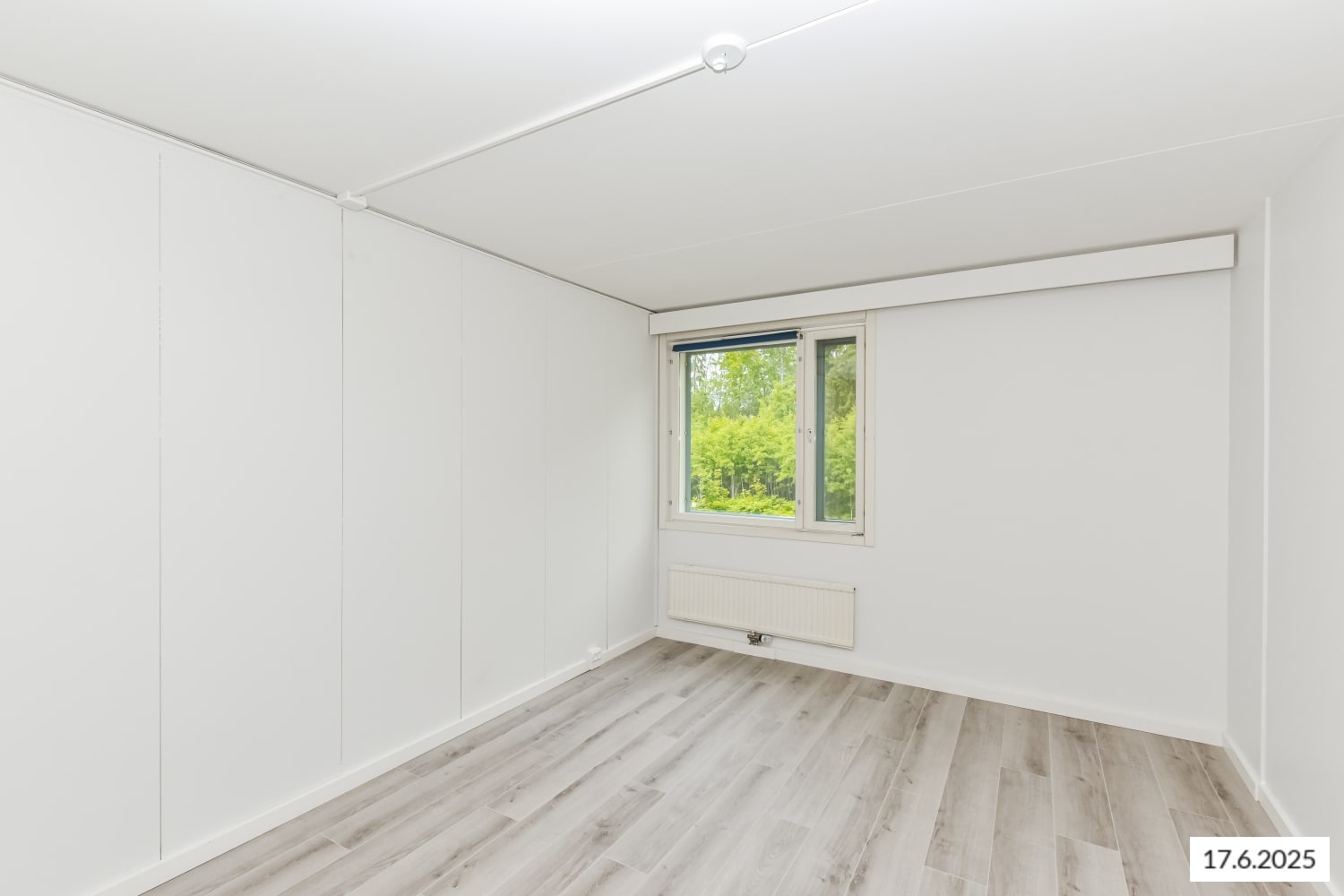 In this traditional through-apartment, there is a separate kitchen where you can fit a dining table by the window. The kitchen is equipped with a dishwasher, freezer-refrigerator, and stove.