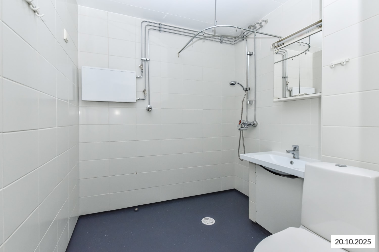 The living areas feature oak laminate flooring, and the walls are painted. In the bathroom, the bathtub has been replaced with a shower, the floor is tiled in dark grey, and the walls are covered with large white tiles.