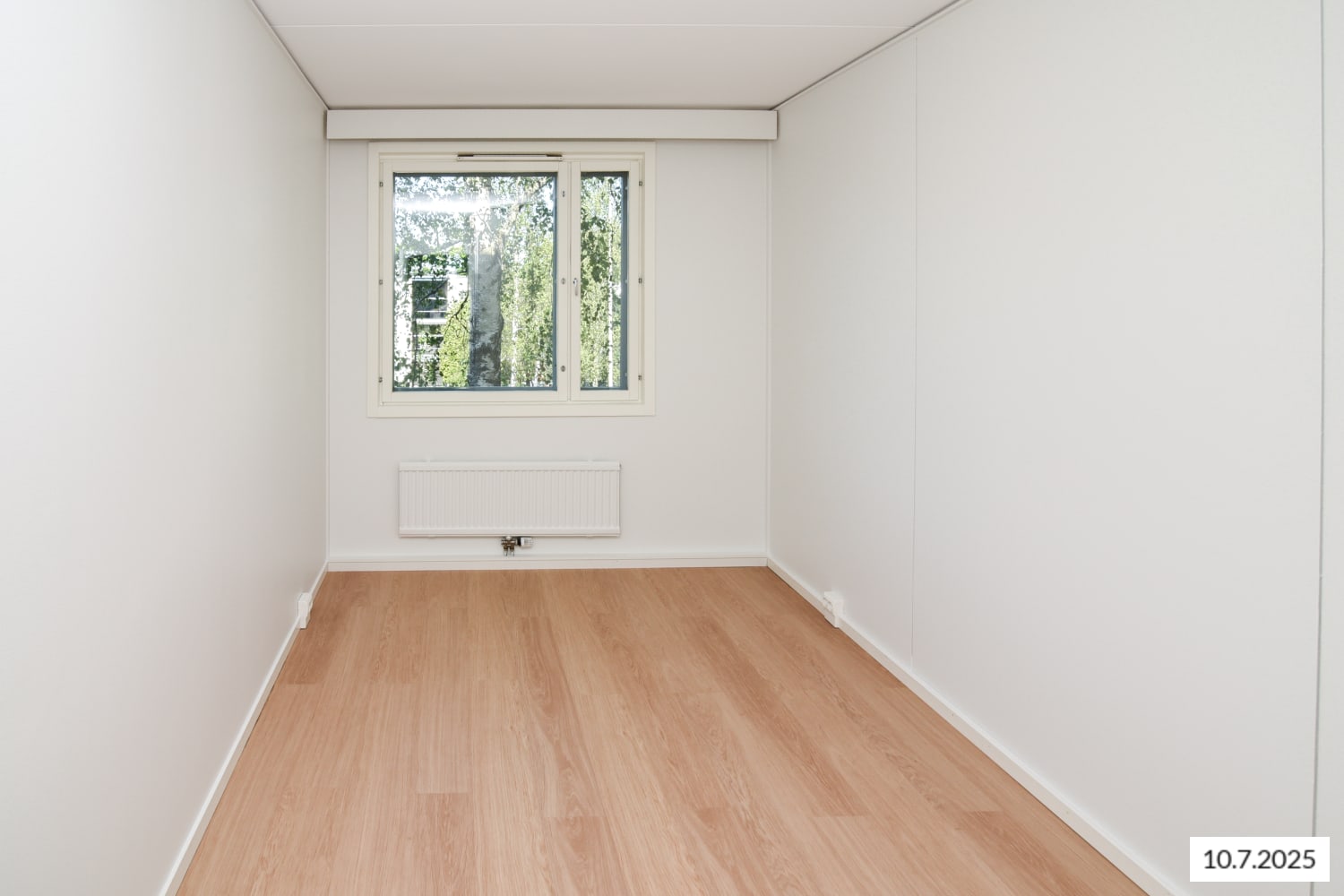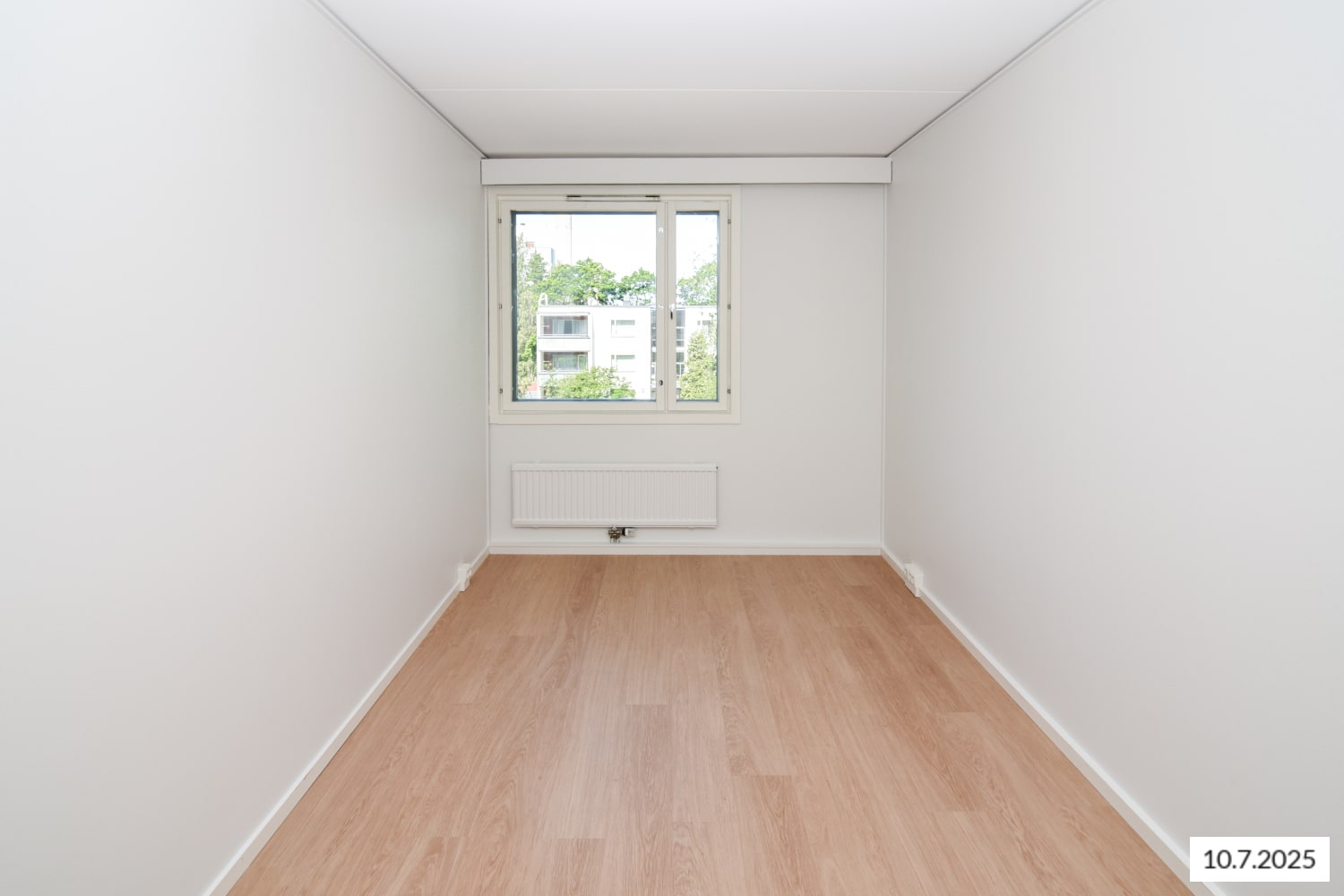 In a child-rich, sheltered courtyard, there is a suitable renovated home for a larger family, with a glazed balcony offering a view to Laajakorvenmäki to the south-east. The generously sized living room can easily be transformed into the gathering place for the whole family, and from the cosy kitchen, you can watch the happenings of the playground.