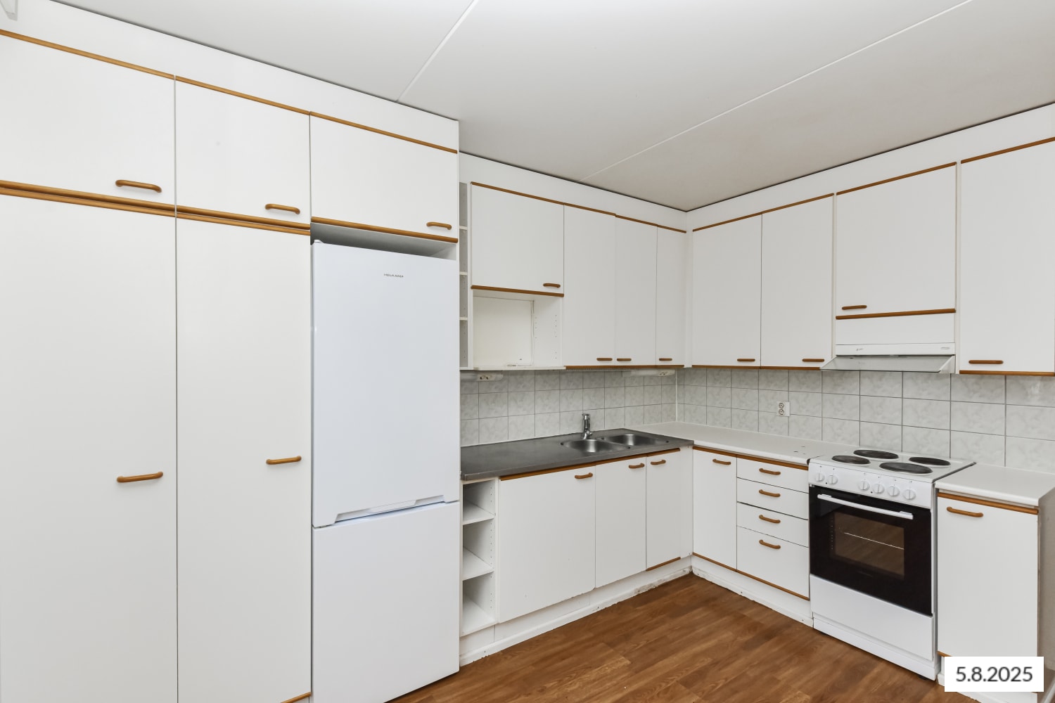 The living areas feature beautiful light laminate flooring. The bathroom has a durable resin floor and tiled walls (the bathtub has been replaced with a shower). The kitchen is equipped with a fridge-freezer and a four-burner electric stove. There is also the possibility to install a dishwasher.