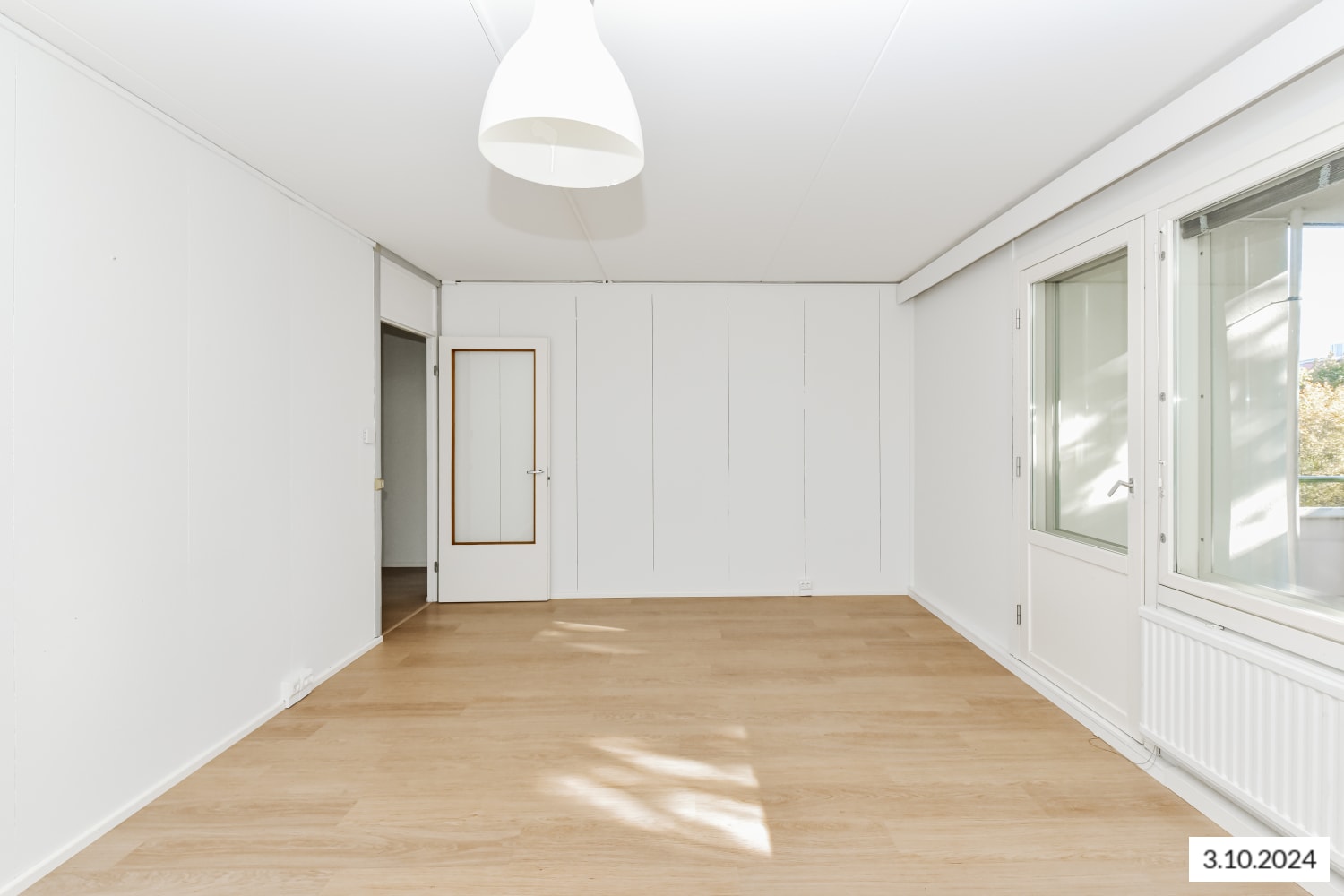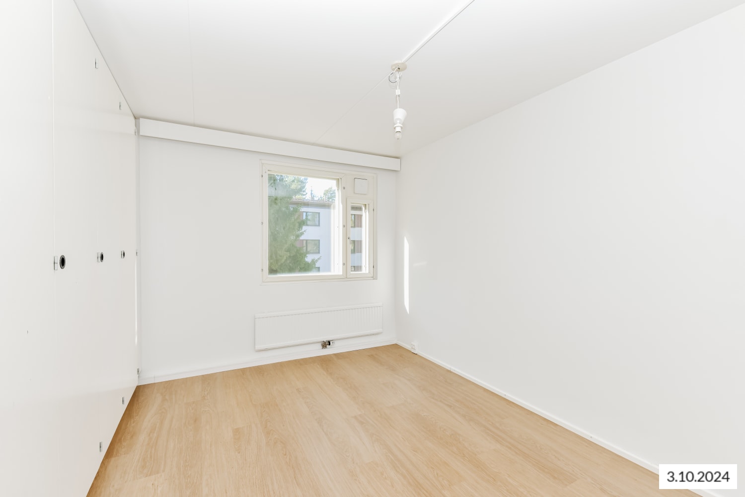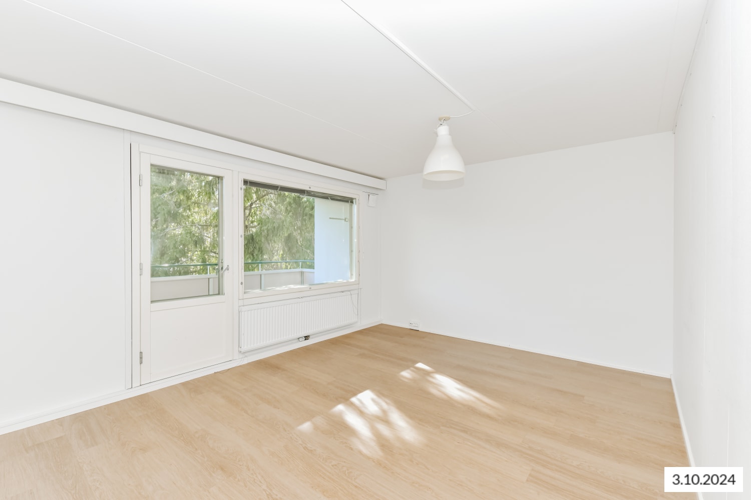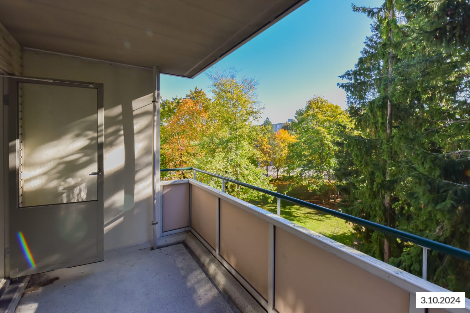 The apartments in this property, located near Laajavuori, are spacious and functional. This two-bedroom apartment has a very traditional and easy-to-furnish layout: the separate living room opens onto a bright balcony, and the kitchen has enough space for both the home cook and a dining table by the window. The floors are clean wood laminate, and the walls are painted. The bathroom has a concrete floor.