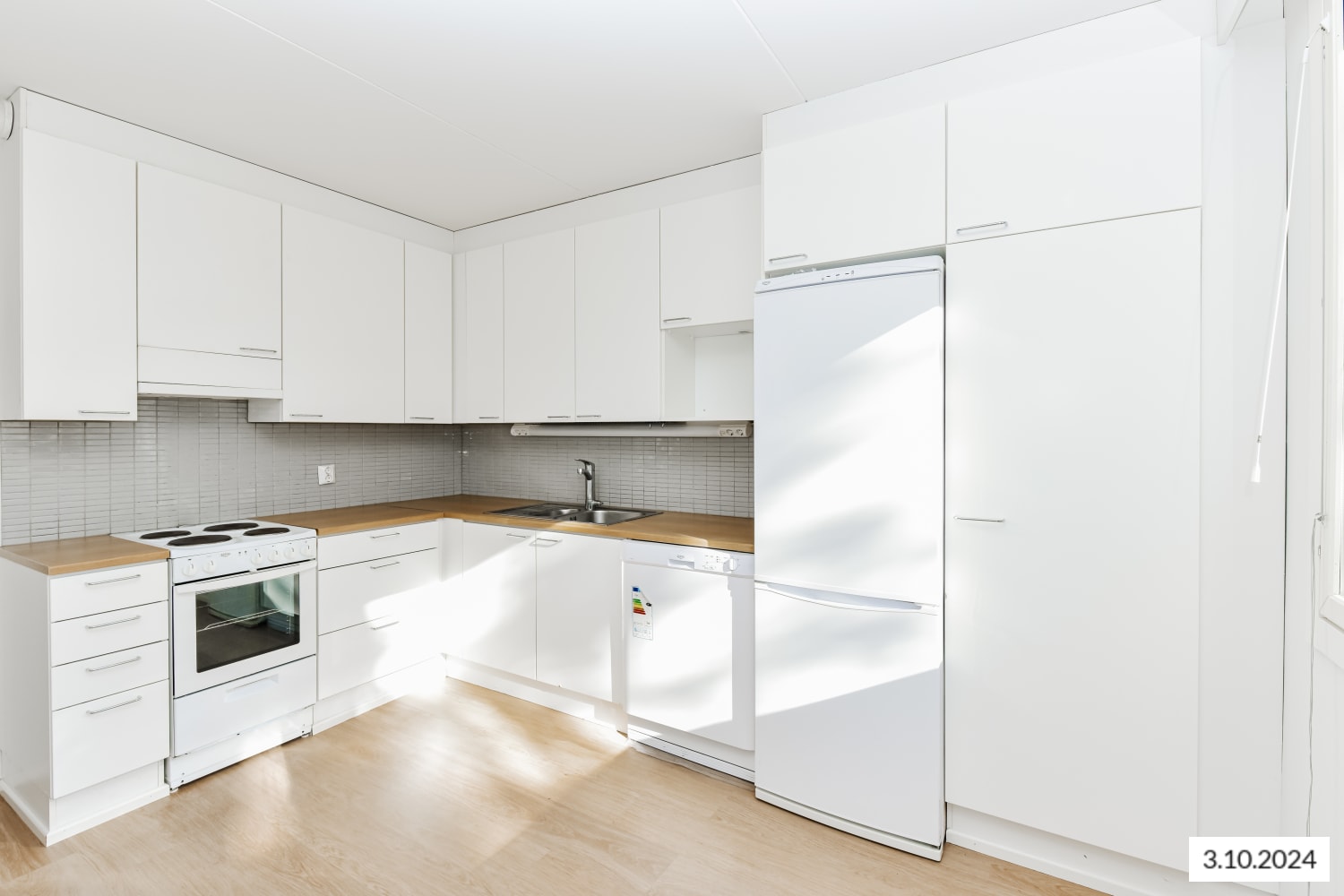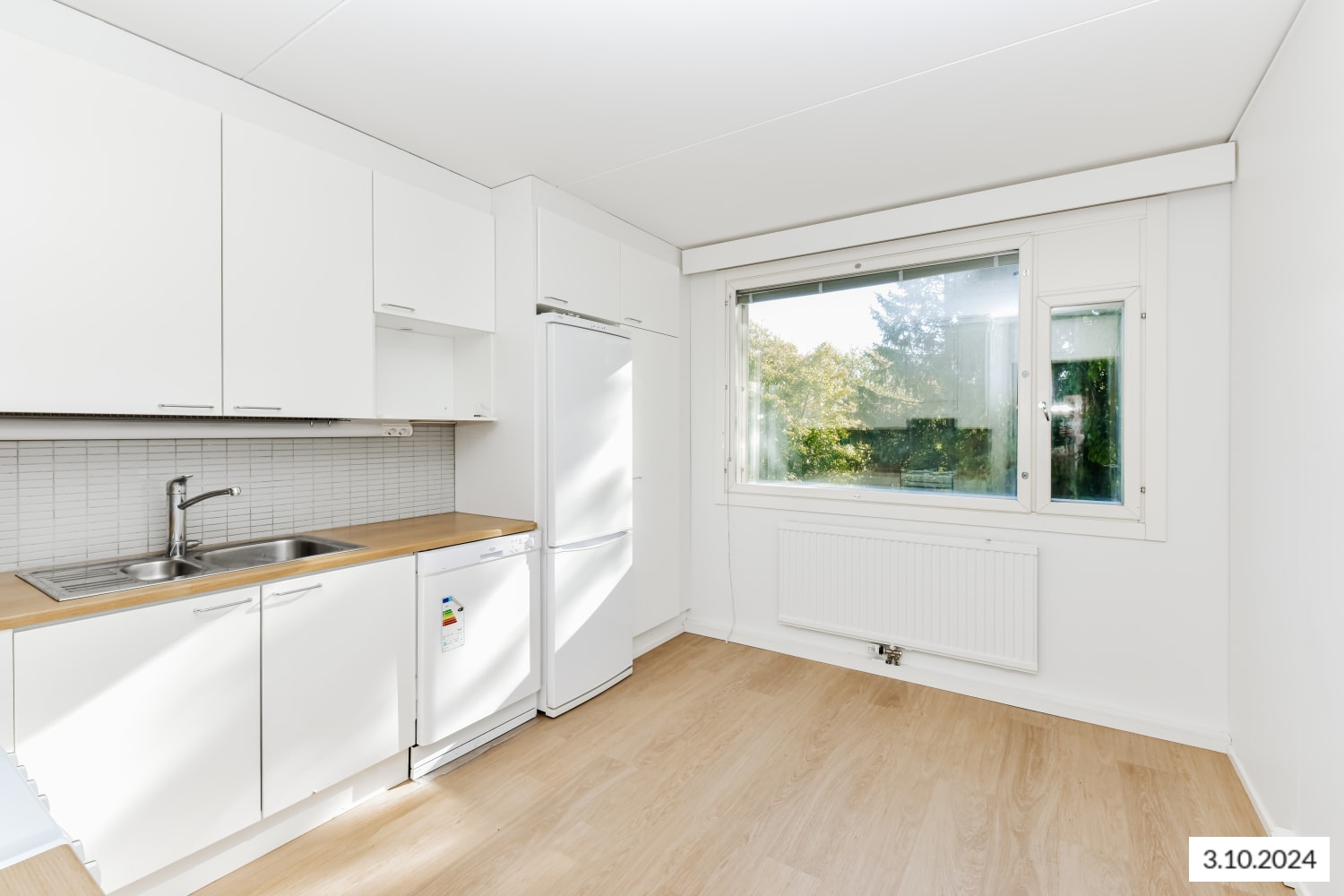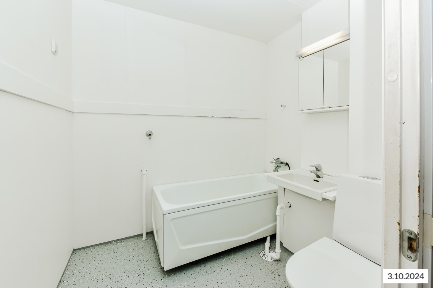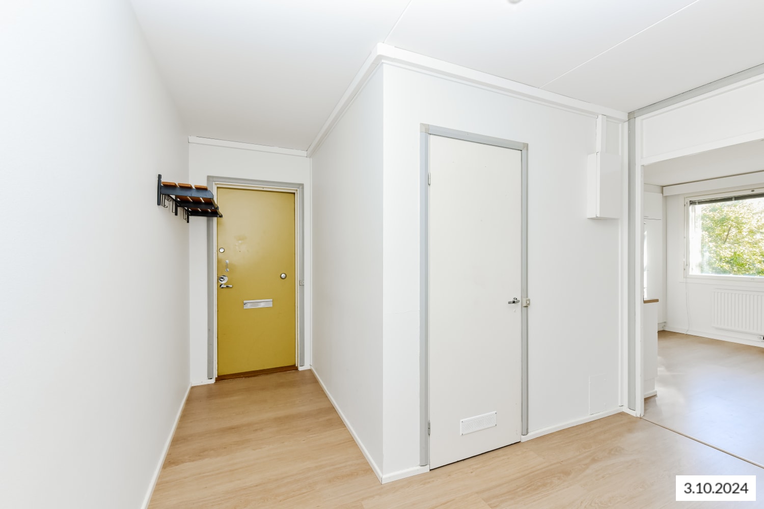 The apartments in this property, located near Laajavuori, are spacious and functional. This two-bedroom apartment has a very traditional and easy-to-furnish layout: the separate living room opens onto a bright balcony, and the kitchen has enough space for both the home cook and a dining table by the window. The floors are clean wood laminate, and the walls are painted. The bathroom has a concrete floor.