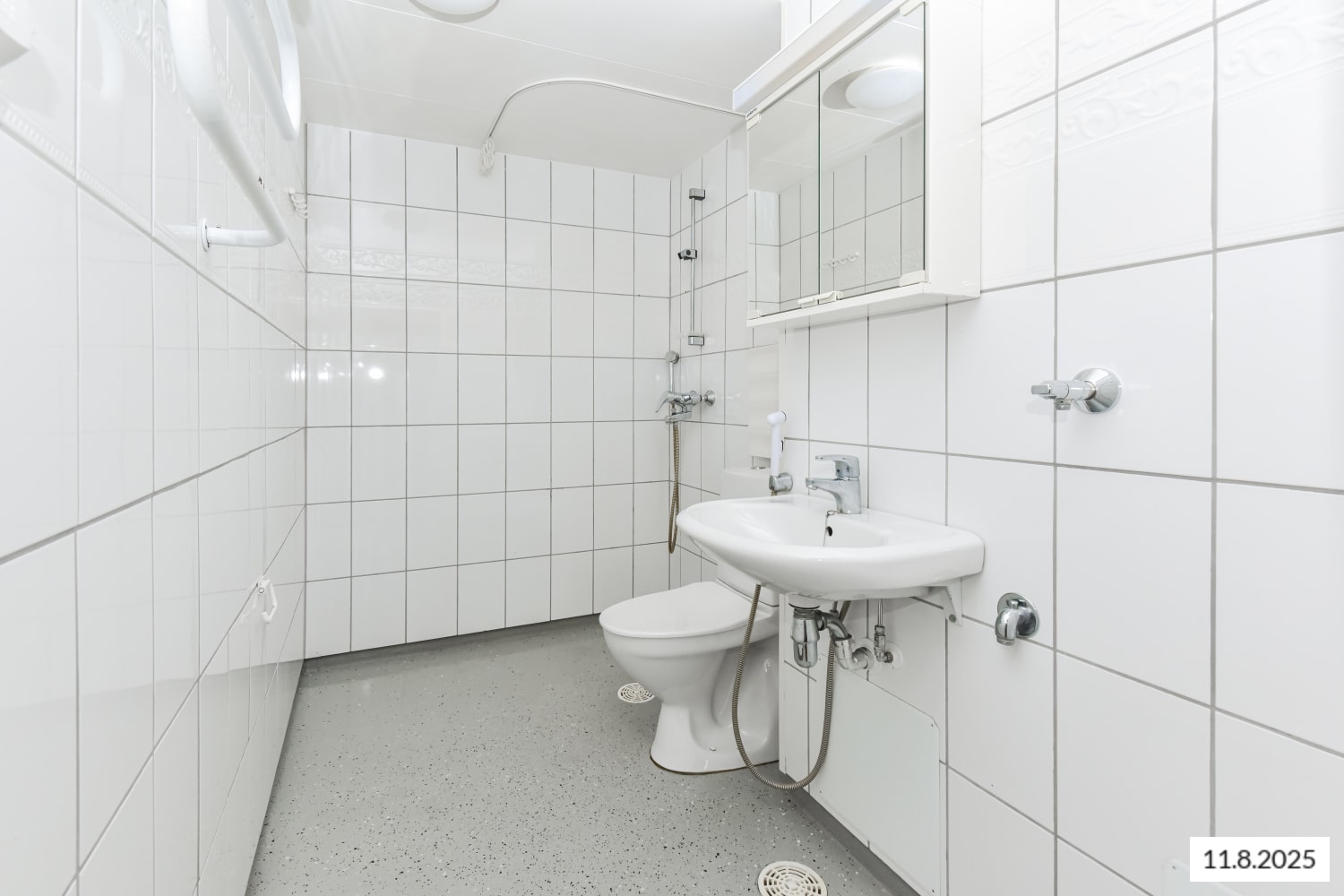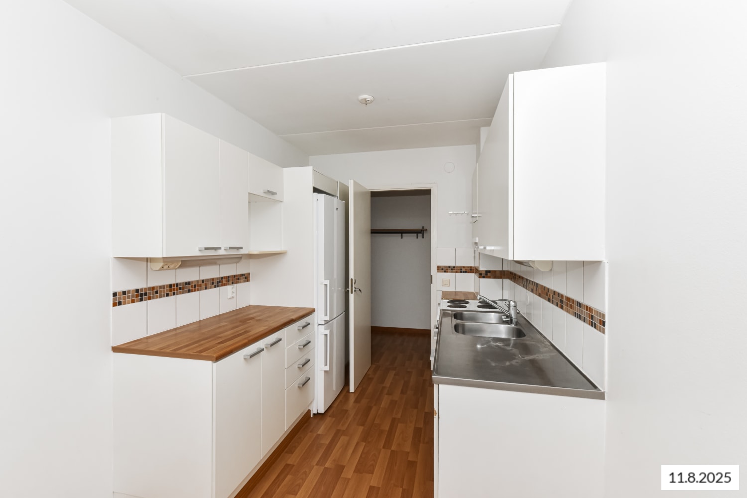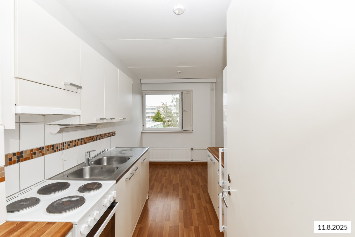 The separate kitchen can accommodate a dining table comfortably by the window. It is equipped with a stove and a freezer-refrigerator, with space available for your dishwasher.