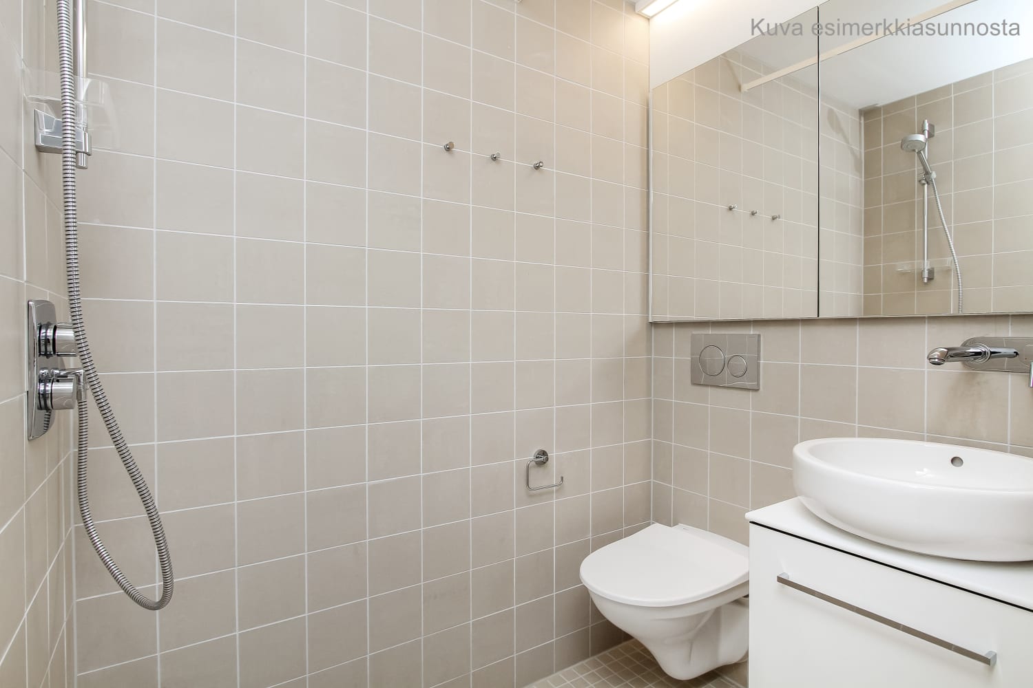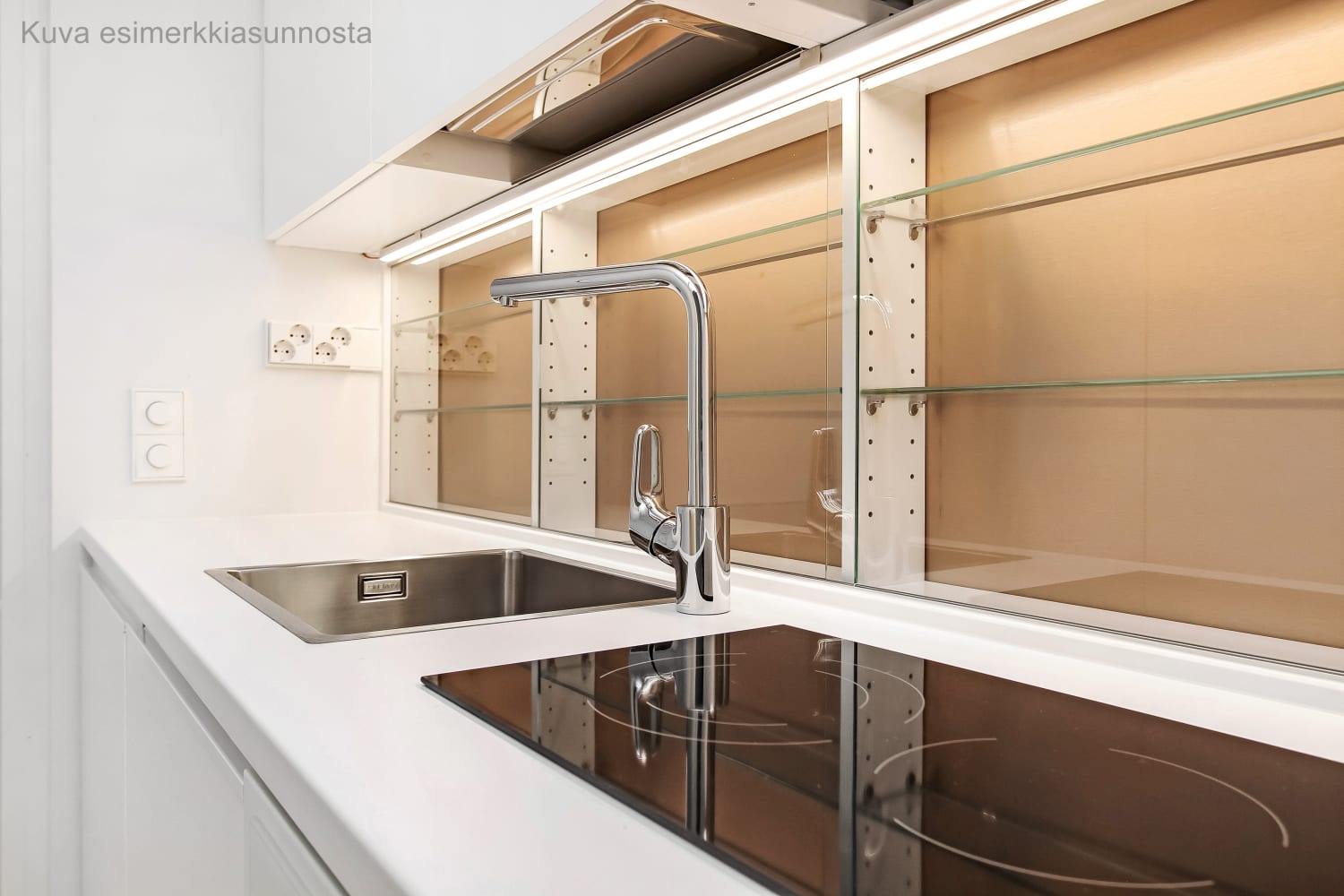 Apartment floors are laid in pale plank laminate. The dimmable luminous ceilings increase the sense of space in the entrance and kitchen areas. Kitchen units and laminate worktops are in fresh white. There is a beautiful glass cabinet with copper-toned laminate as the backdrop in the space between the top and bottom units. The kitchen is equipped with a hob, combi microwave oven, extractor fan and fridge. The stairs to the sleeping loft are solid birch and feature lighting on the steps. There is a pull-out table and plenty of out-of-sight storage space under the stairs. The bathroom is tiled in pale beige and equipped with a wall-to-wall mirrored cabinet, laundry cabinet and vanity unit.
