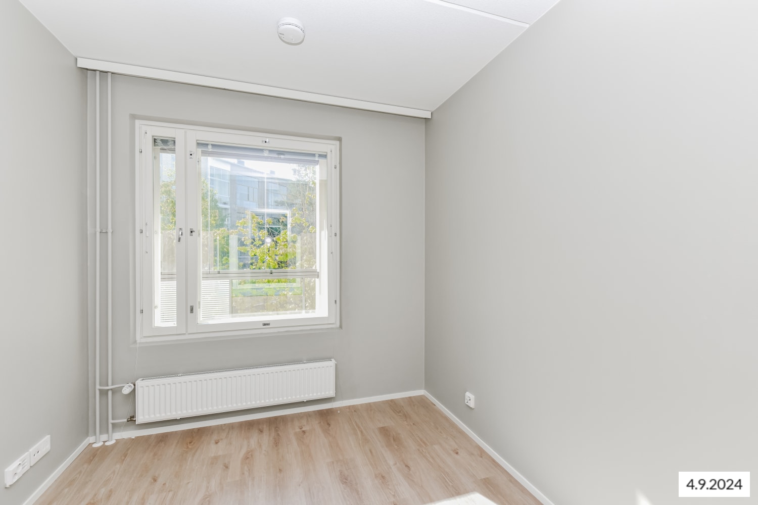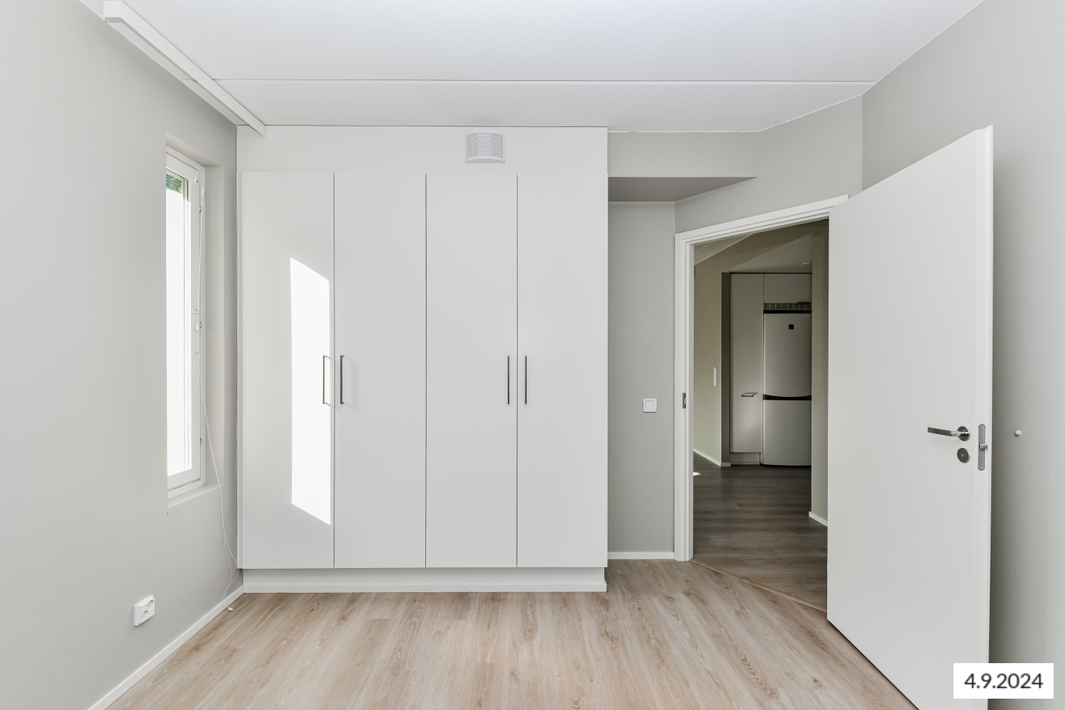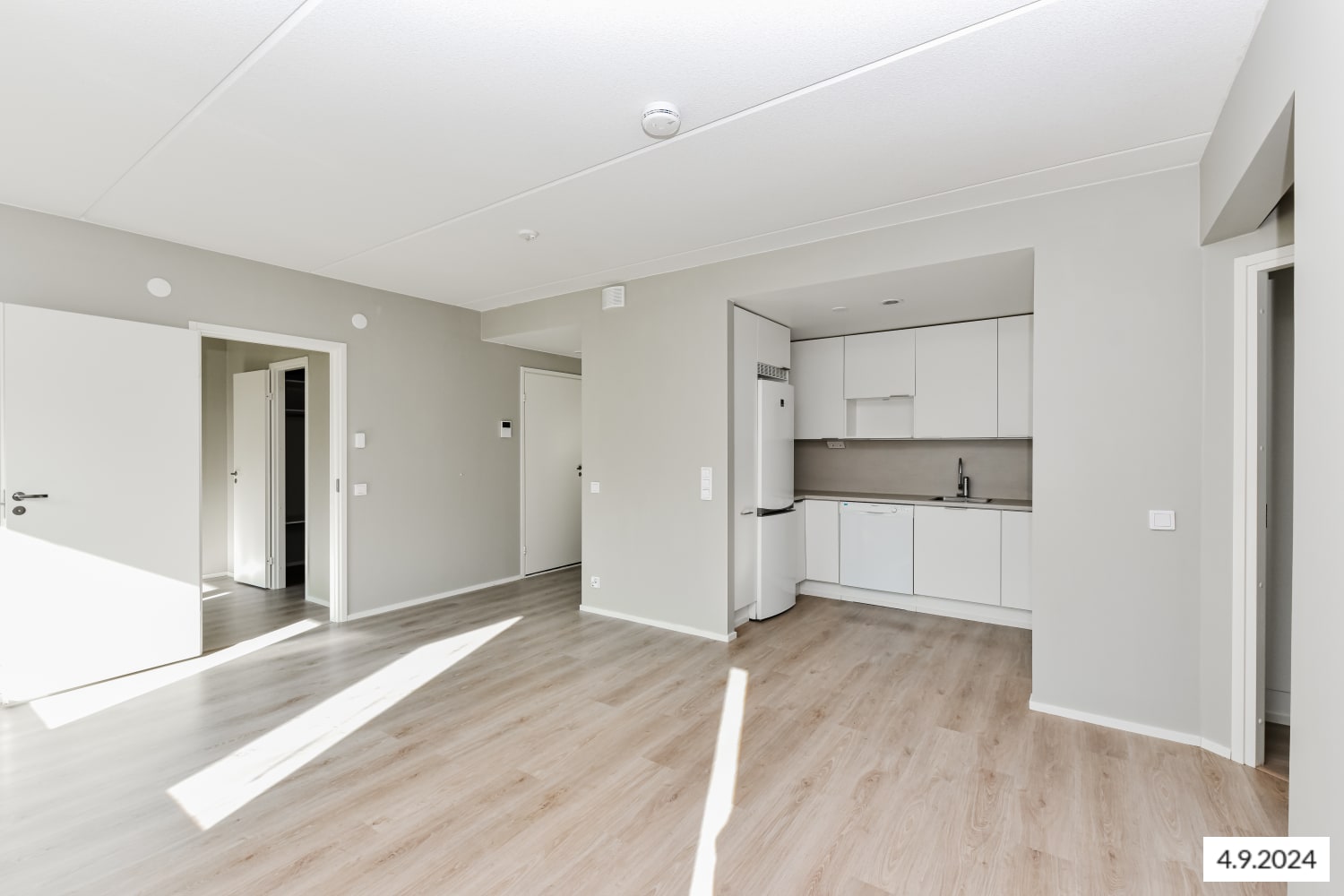 The floors in the living areas are light oak laminate, and the walls are painted a warm light gray. The closets in the entryway and bedrooms are white, and the windows are fitted with blinds. The kitchen cabinets are a fresh white, with gray laminate countertops and backsplash. The kitchen is equipped with a fridge-freezer, dishwasher, ceramic cooktop, range hood, and a reserved space for a microwave. The appliances are white.