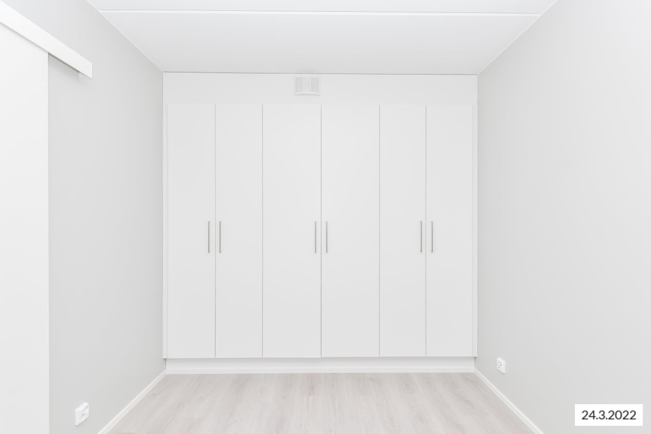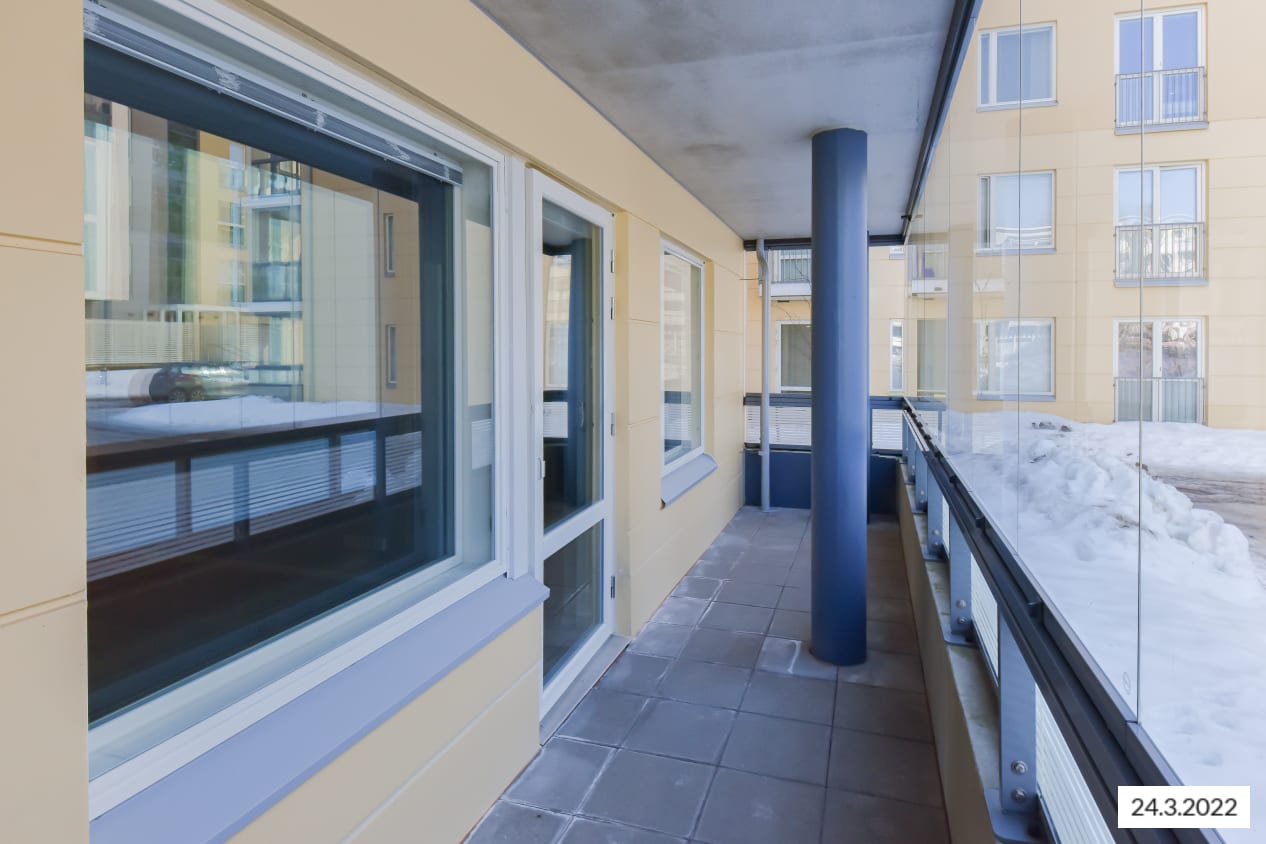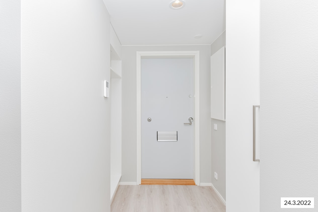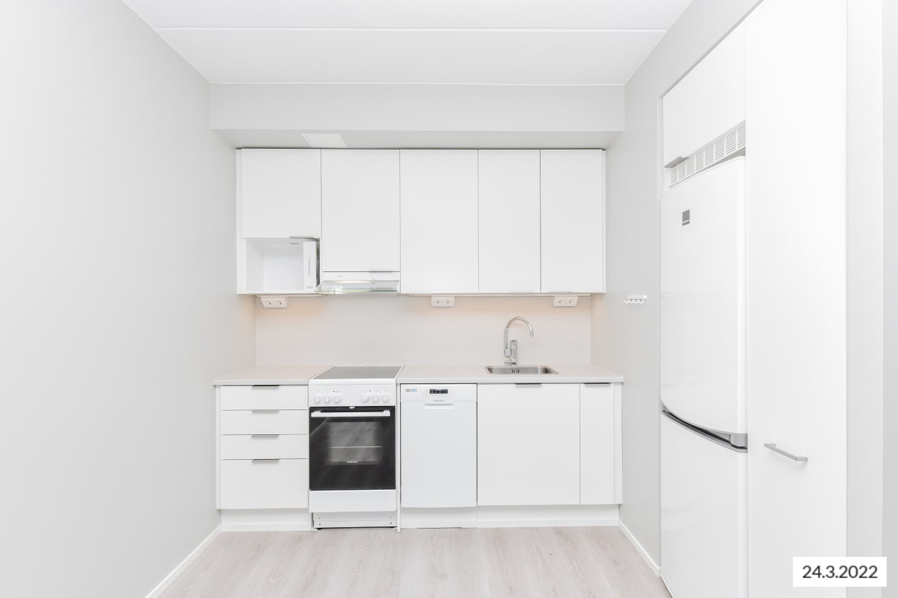 The bright surfaces of this cosy one-bedroom home suit various interior styles. The living room connects to an open kitchen, with ample space for a dining table. The bedroom is separated from the living room by a space-saving sliding door. You can create your own summer paradise on the glazed terrace. The home features oak laminate flooring and walls painted in light grey. The hallway and bedroom closets are white and the windows have blinds.
