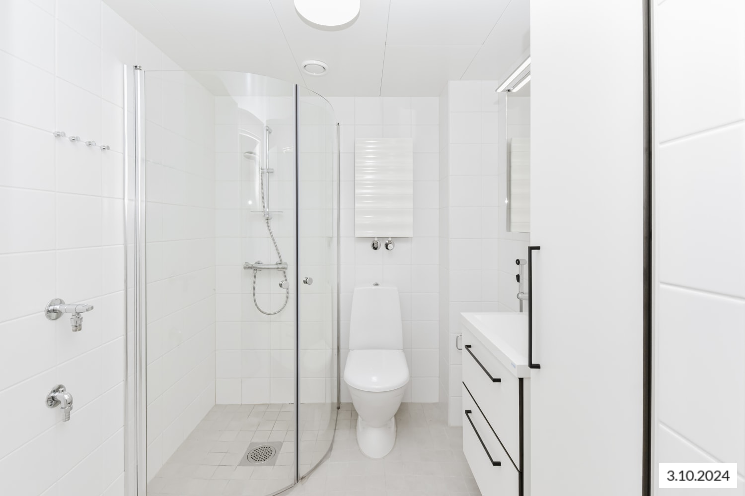 In the bathroom, the furnishings are from the domestic Kide range, made of white solid laminate. The walls are tiled in white, and the floor tiles are a muted white shade. There is a designated space for a washing machine.
