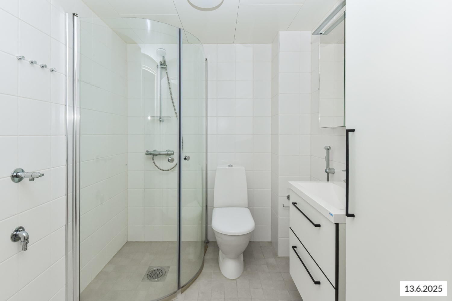 The bathroom units are from the domestic Kide range, made from highly durable white solid laminate. The walls are white tiles and the floor tiles are a muted white tone. There is a designated space for a washing machine.