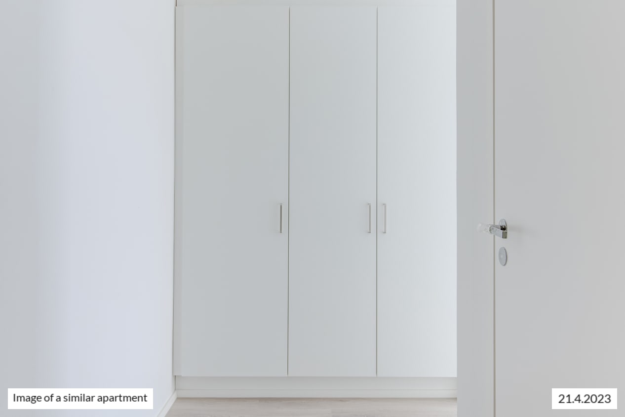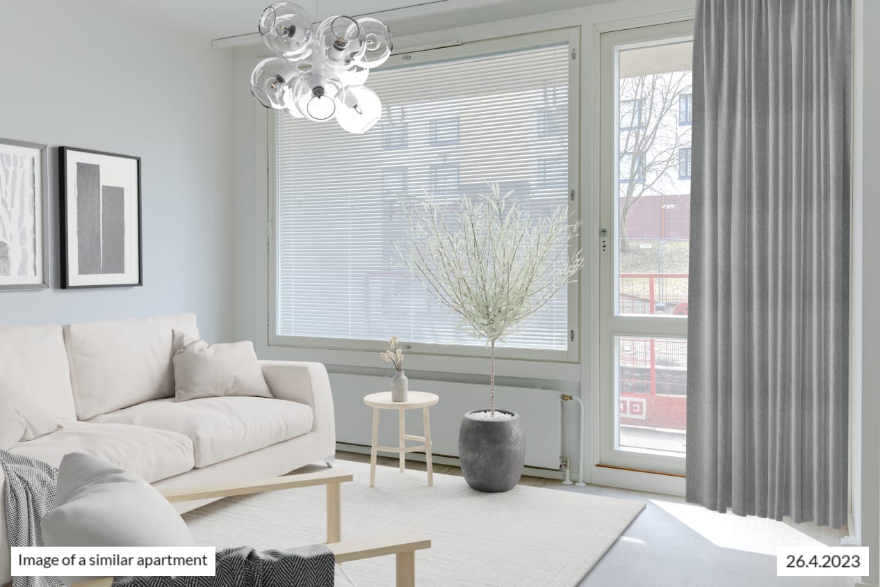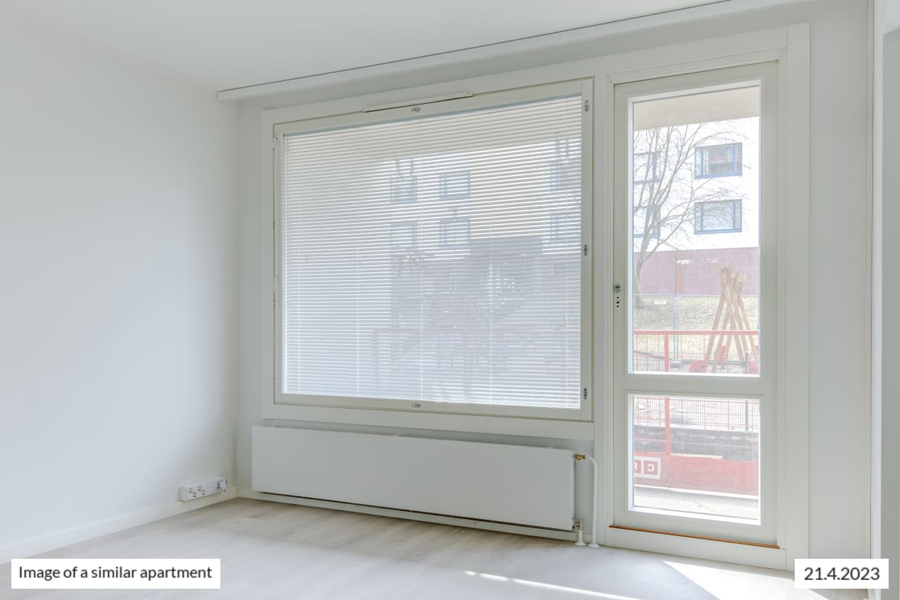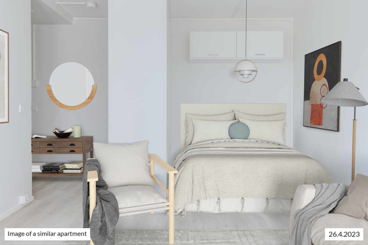 This spacious dream of a studio has it all: separate kitchen, an alcove behind a room divider closet, and glassed-in balcony overlooking the courtyard. The kitchen has room for a small dining table. The spacious living area is easy to furnish to suit your lifestyle. How about summertime breakfast on your balcony, listening to the homely sounds from the courtyard?