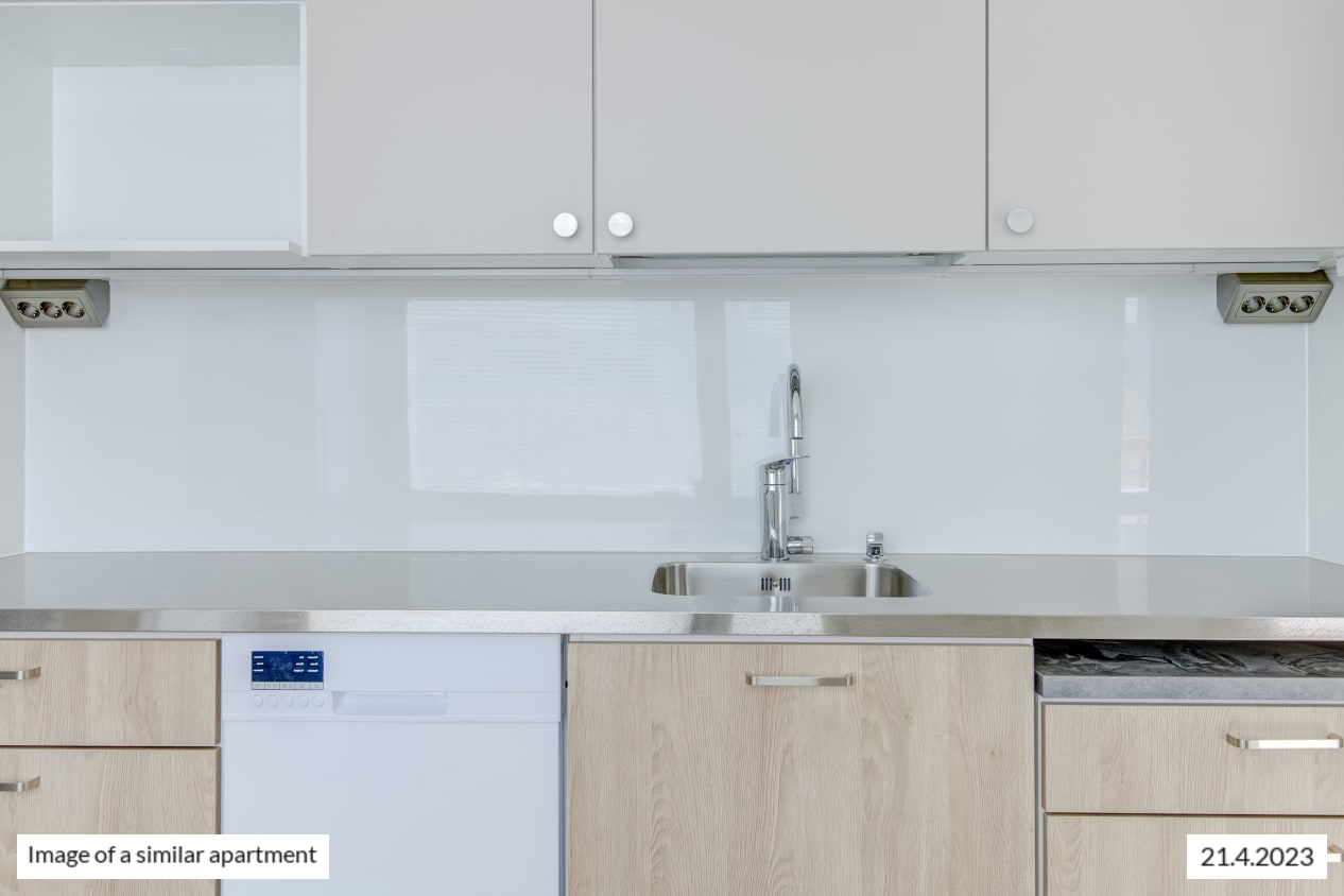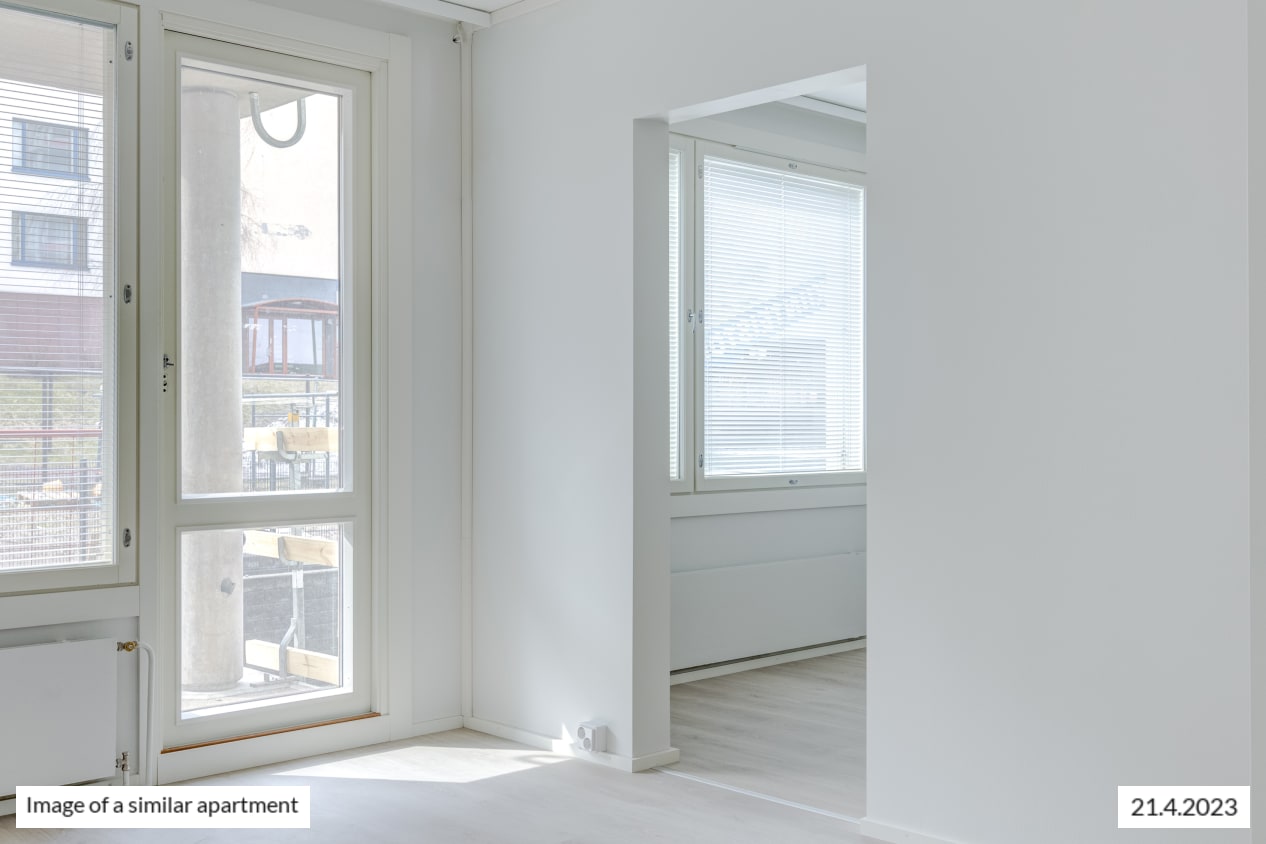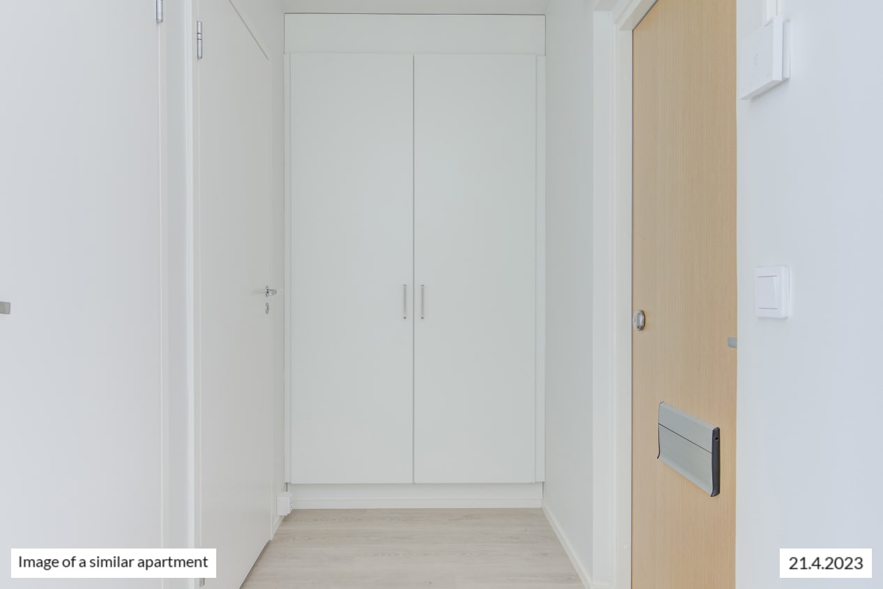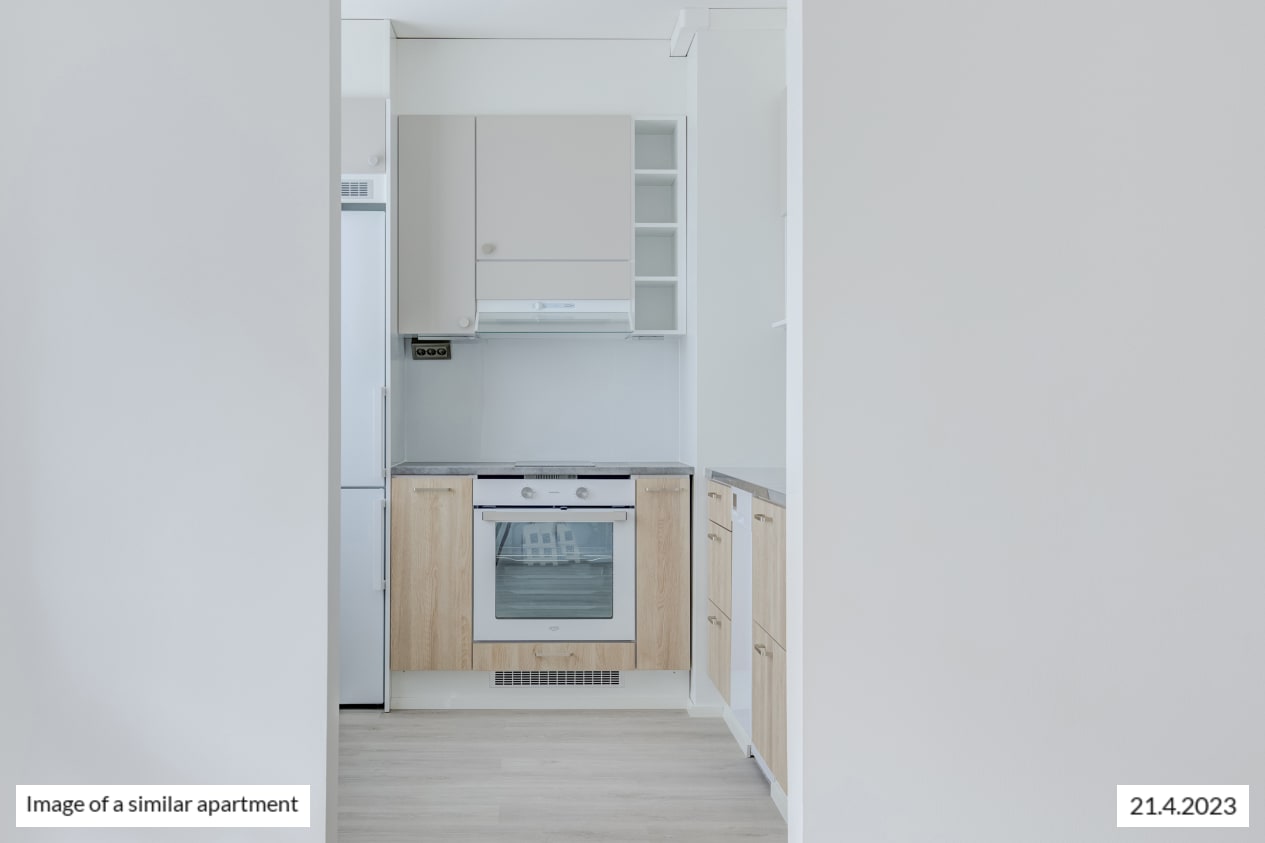 This spacious dream of a studio has it all: separate kitchen, an alcove behind a room divider closet, and glassed-in balcony overlooking the courtyard. The kitchen has room for a small dining table. The spacious living area is easy to furnish to suit your lifestyle. How about summertime breakfast on your balcony, listening to the homely sounds from the courtyard?