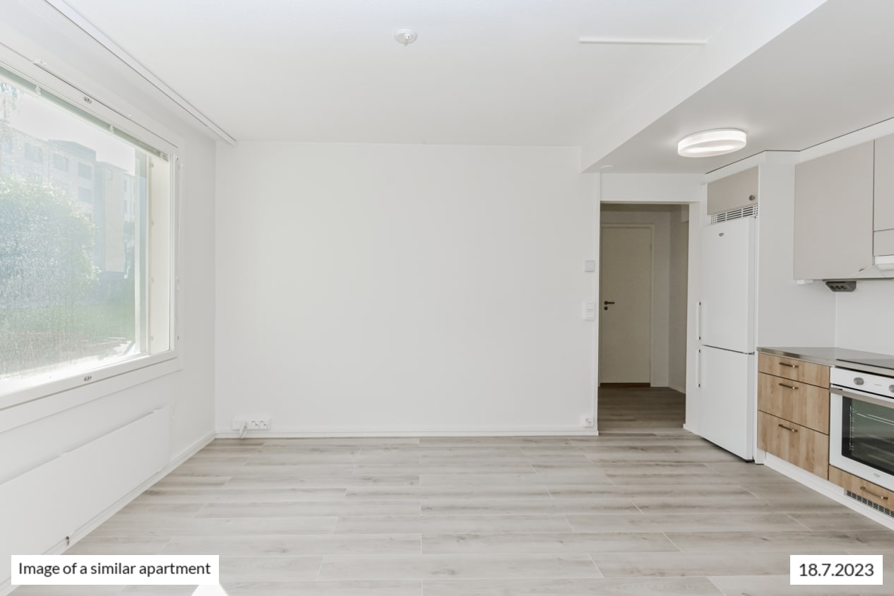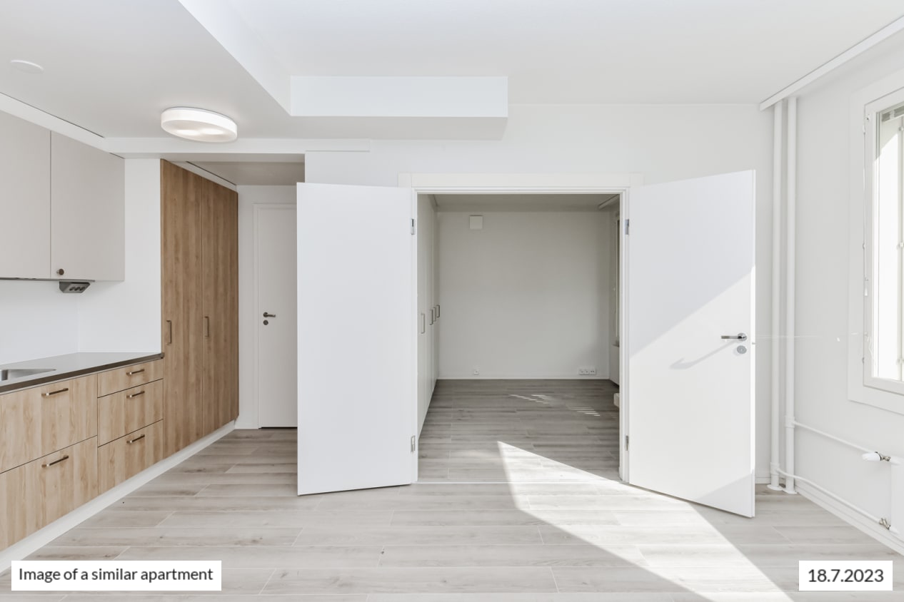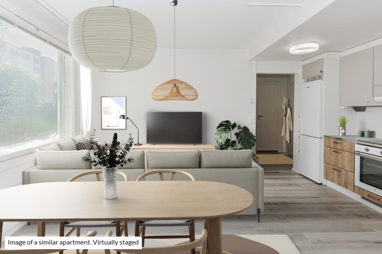 The kitchen is conveniently slightly separate from the living room, yet the spaces flow together nicely. And how about summertime breakfast on your balcony, listening to the homely sounds from the courtyard?