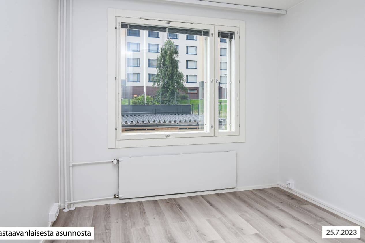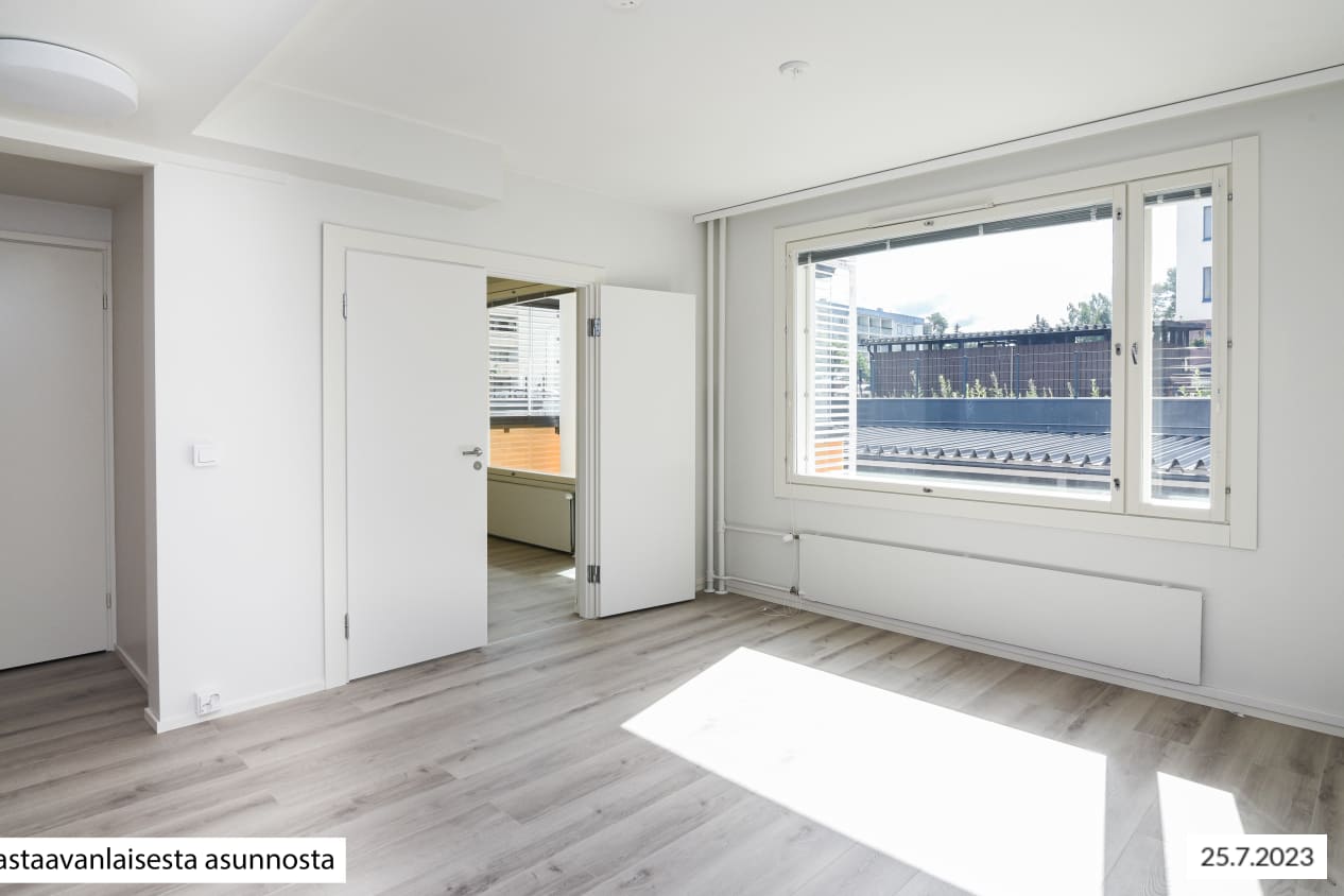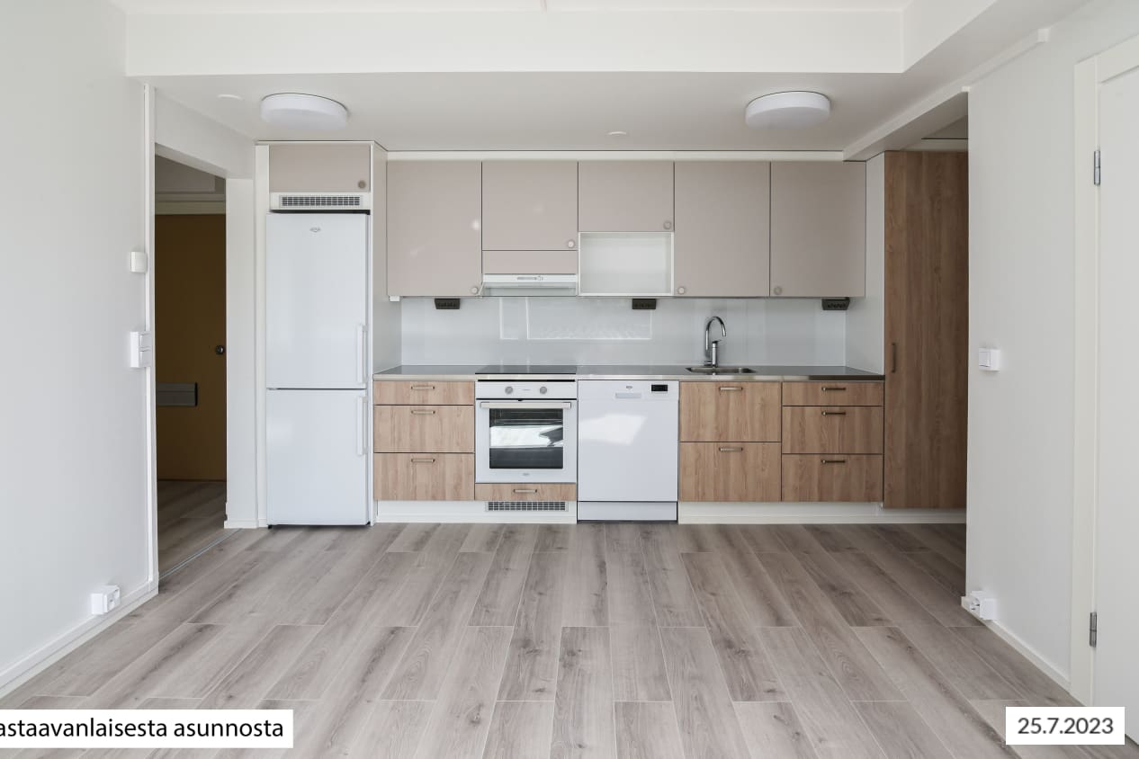 The apartment walls are painted in an off-white shade, the floors are in pale grey oak-effect laminate. The windows are fitted with Venetian blinds and feature double curtain tracks. The modern kitchens are equipped with an induction cooktop with 2 or 4 burners. All appliances are white: a 45- or 60-cm dishwasher, cooker hood, oven and fridge-freezer. There is space for a microwave in the kitchen units. The upper cabinets are beige and lowers are light oak. The countertops are done in grey, slightly textured laminate, the recessed sinks in stainless steel and the backsplash in pale-coloured composite panel. The spacious bathrooms feature low-maintenance Kide bathroom furniture, which is made in Finland. The bathroom floors are done in grey and the walls in larger white tile. The ceiling has alder wood panelling in a warm shade. The corner shower enclosure has folding doors. In addition, all homes have hook-ups and space for a washing machine: in the kitchen for studios, in the bathroom for all other homes. The wet rooms have electric underfloor heating. The bathroom door threshold has a vertical height of slightly over 5 cm and the bathroom floor is also similarly higher than the other floors of the home; the home is therefore not fully accessible. The buildings have an air extraction system with cooker hood boosting. The property is heated mainly with geothermal energy. Heat distribution takes place though hot-water radiator heating. Residents share access to a sauna section, laundry and drying room. There are five storage rooms for outdoor equipment and also three baby carriage storage rooms next to the stairwell entrances. Seven separate spaces, one of them the civil defence shelter, are allocated to storage. There are also toilets on the basement floor. The building’s waste containers are located in the yard. There are 42 parking spaces and more than 200 places for bicycles.