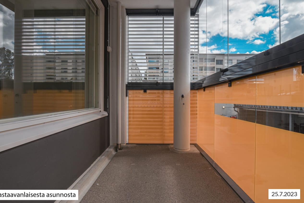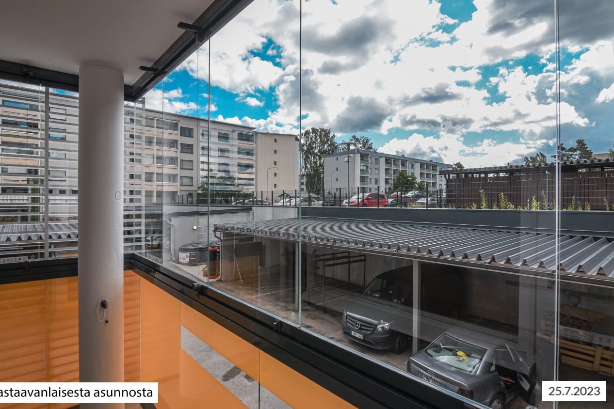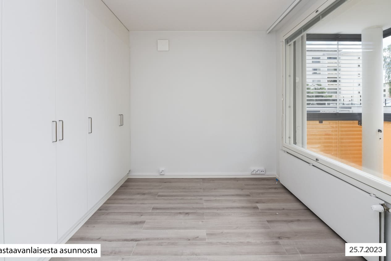 The apartment walls are painted in an off-white shade, the floors are in pale grey oak-effect laminate. The windows are fitted with Venetian blinds and feature double curtain tracks. The modern kitchens are equipped with an induction cooktop with 2 or 4 burners. All appliances are white: a 45- or 60-cm dishwasher, cooker hood, oven and fridge-freezer. There is space for a microwave in the kitchen units. The upper cabinets are beige and lowers are light oak. The countertops are done in grey, slightly textured laminate, the recessed sinks in stainless steel and the backsplash in pale-coloured composite panel. The spacious bathrooms feature low-maintenance Kide bathroom furniture, which is made in Finland. The bathroom floors are done in grey and the walls in larger white tile. The ceiling has alder wood panelling in a warm shade. The corner shower enclosure has folding doors. In addition, all homes have hook-ups and space for a washing machine: in the kitchen for studios, in the bathroom for all other homes. The wet rooms have electric underfloor heating. The bathroom door threshold has a vertical height of slightly over 5 cm and the bathroom floor is also similarly higher than the other floors of the home; the home is therefore not fully accessible. The buildings have an air extraction system with cooker hood boosting. The property is heated mainly with geothermal energy. Heat distribution takes place though hot-water radiator heating. Residents share access to a sauna section, laundry and drying room. There are five storage rooms for outdoor equipment and also three baby carriage storage rooms next to the stairwell entrances. Seven separate spaces, one of them the civil defence shelter, are allocated to storage. There are also toilets on the basement floor. The building’s waste containers are located in the yard. There are 42 parking spaces and more than 200 places for bicycles.