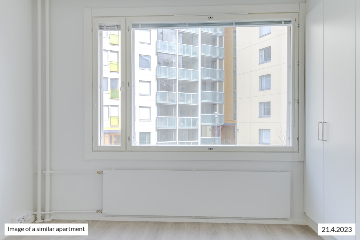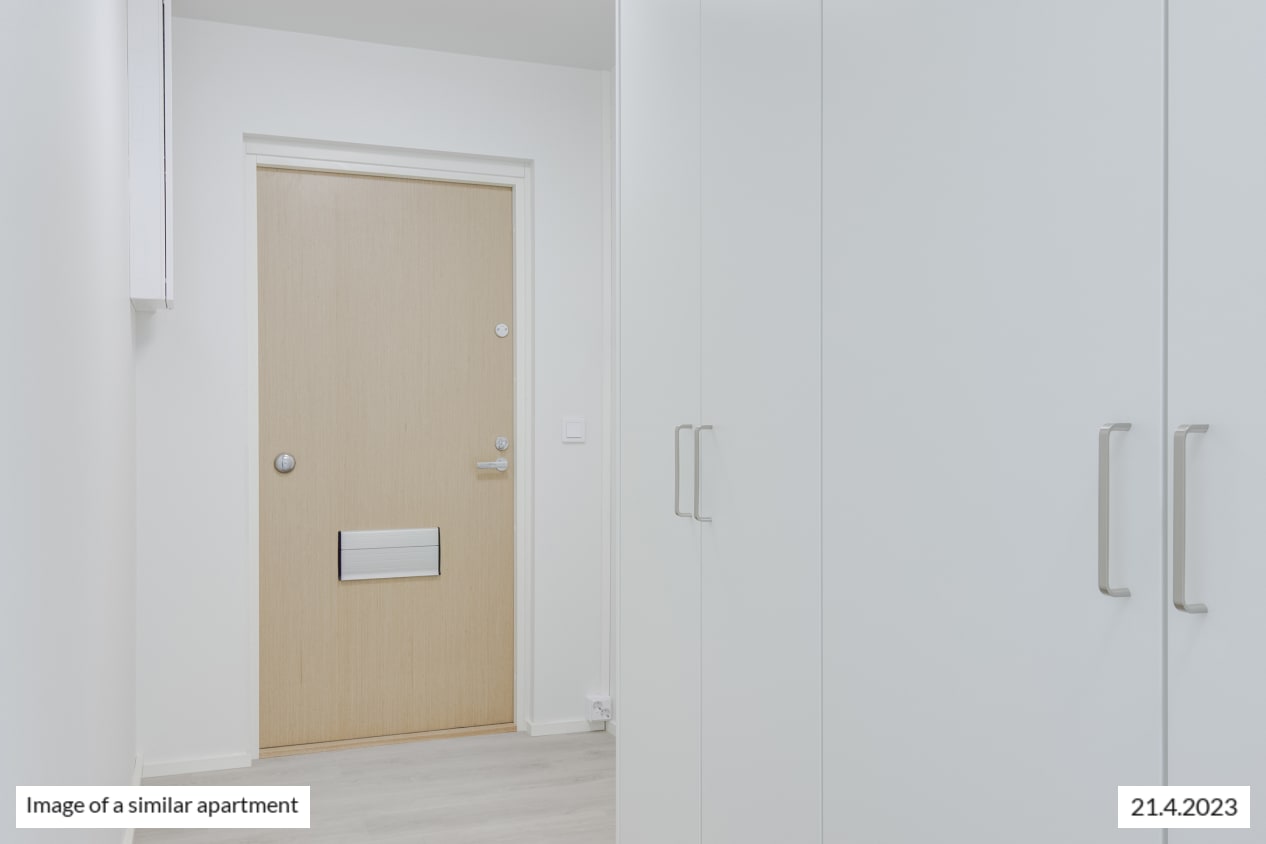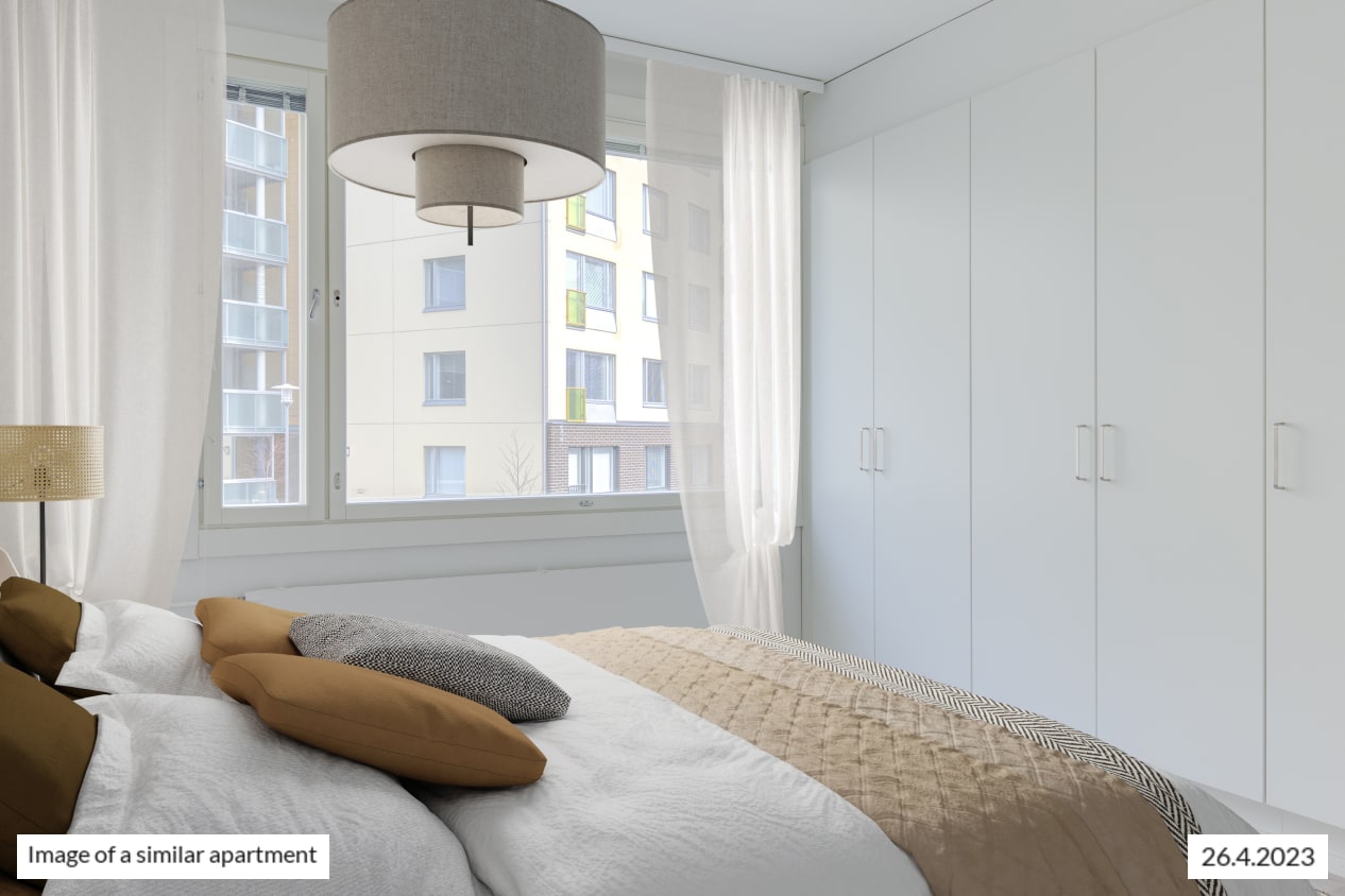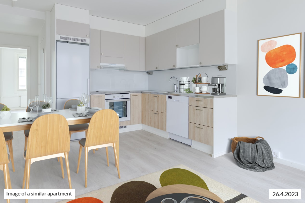 This smartly laid out two-bedroom home offers views of the building courtyard. The functional kitchen flows seamlessly into the living room. It is easy to separate the living space into lounging area and dining area and to extend the space to the glassed-in balcony in the summer. How about summertime breakfast on your balcony, listening to the homely sounds from the courtyard?