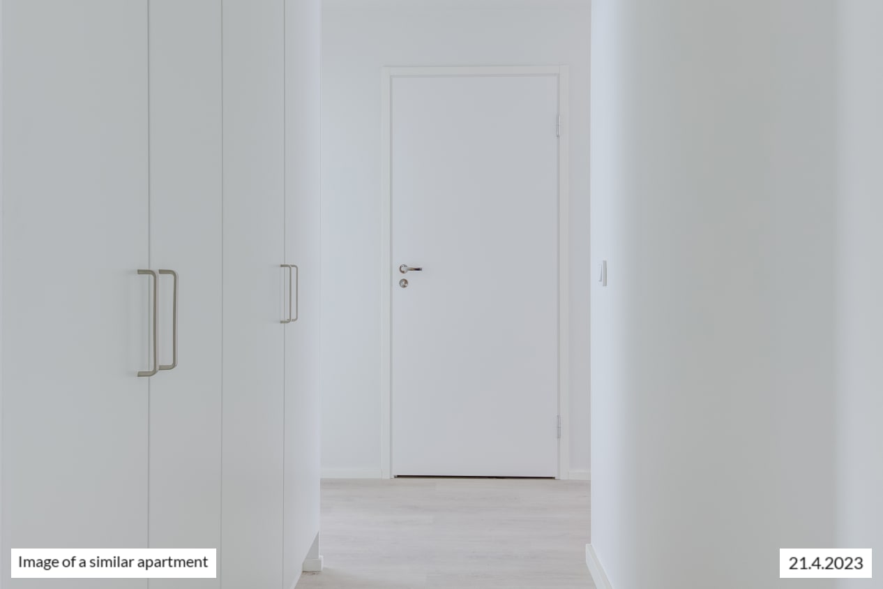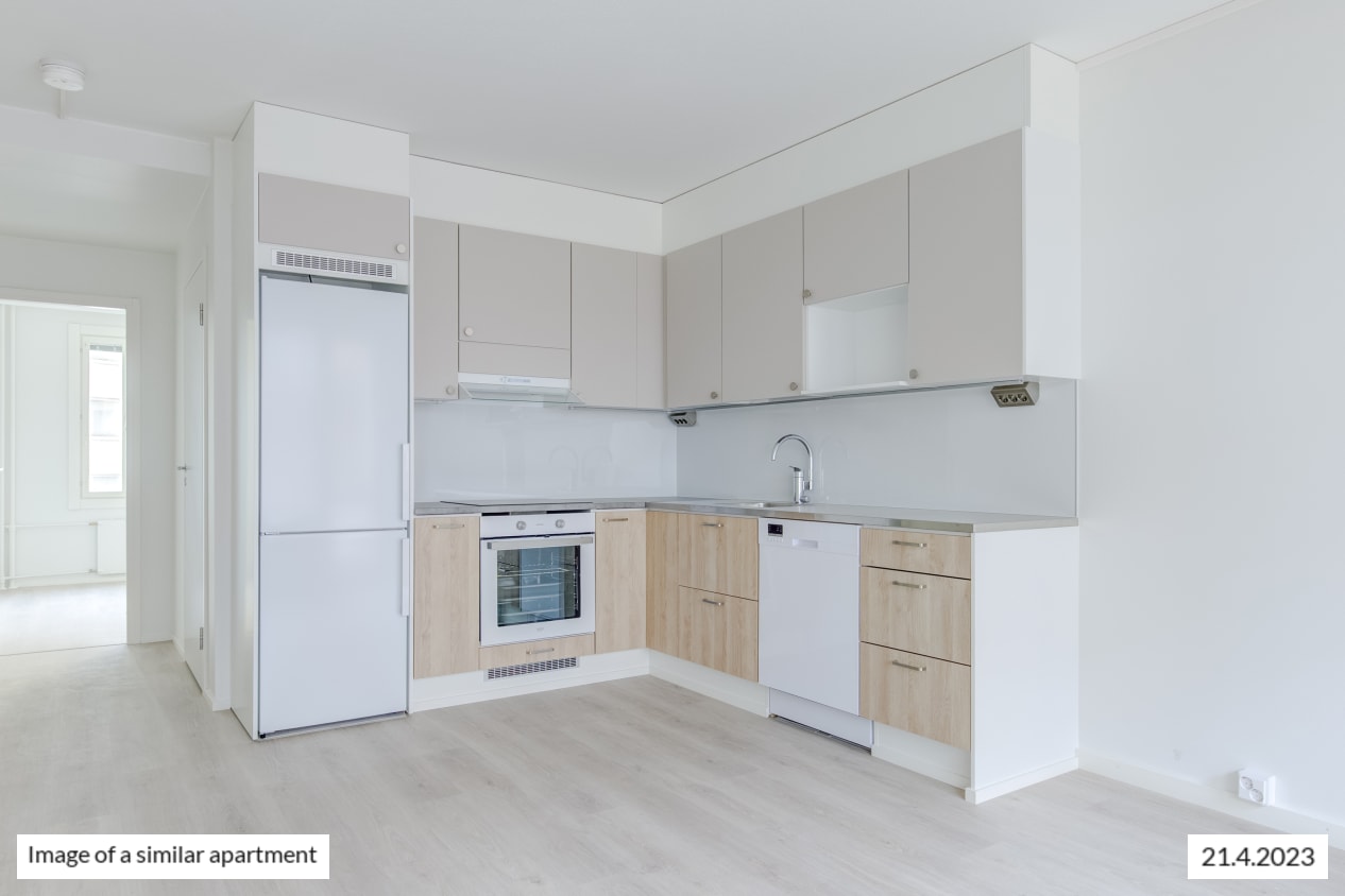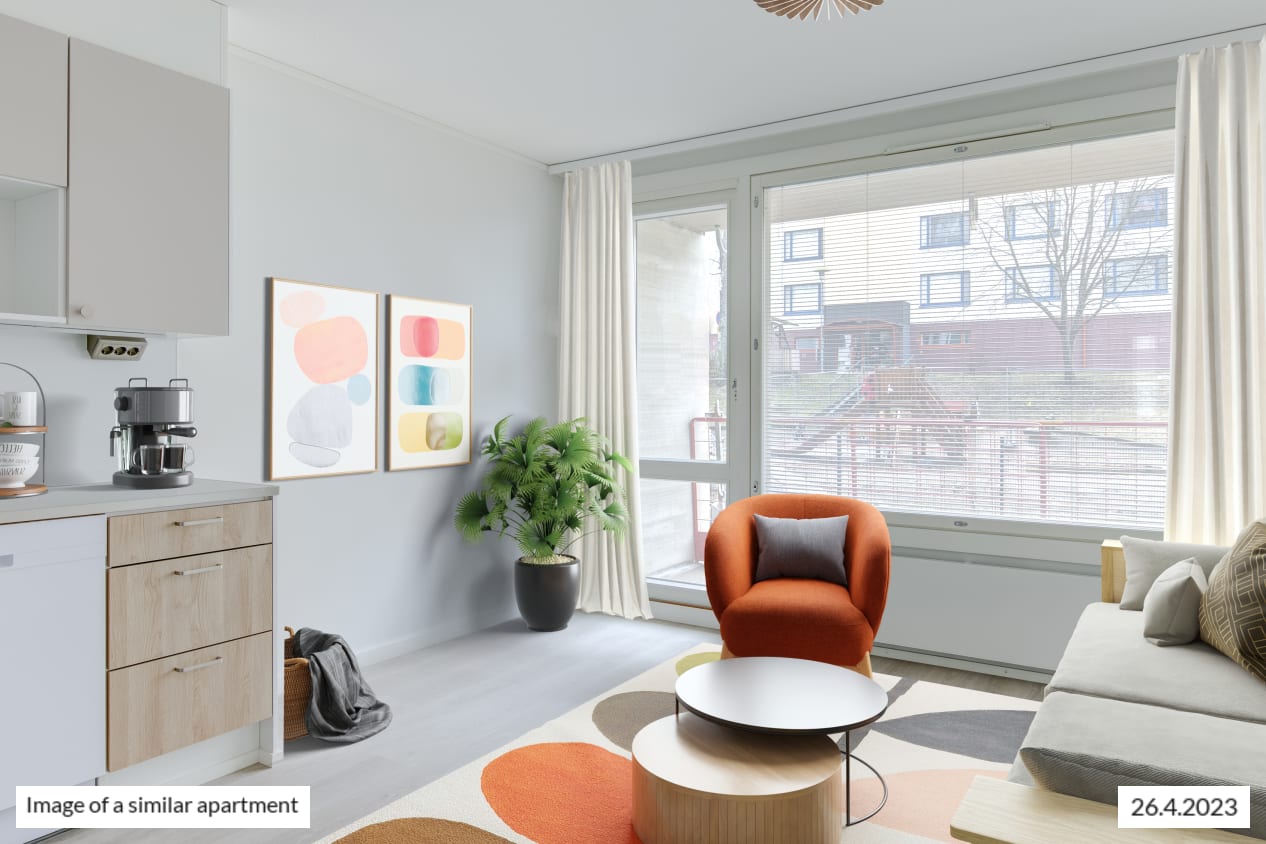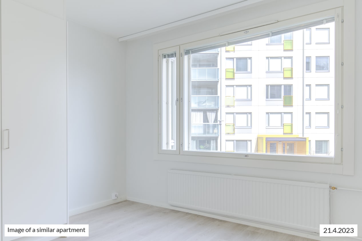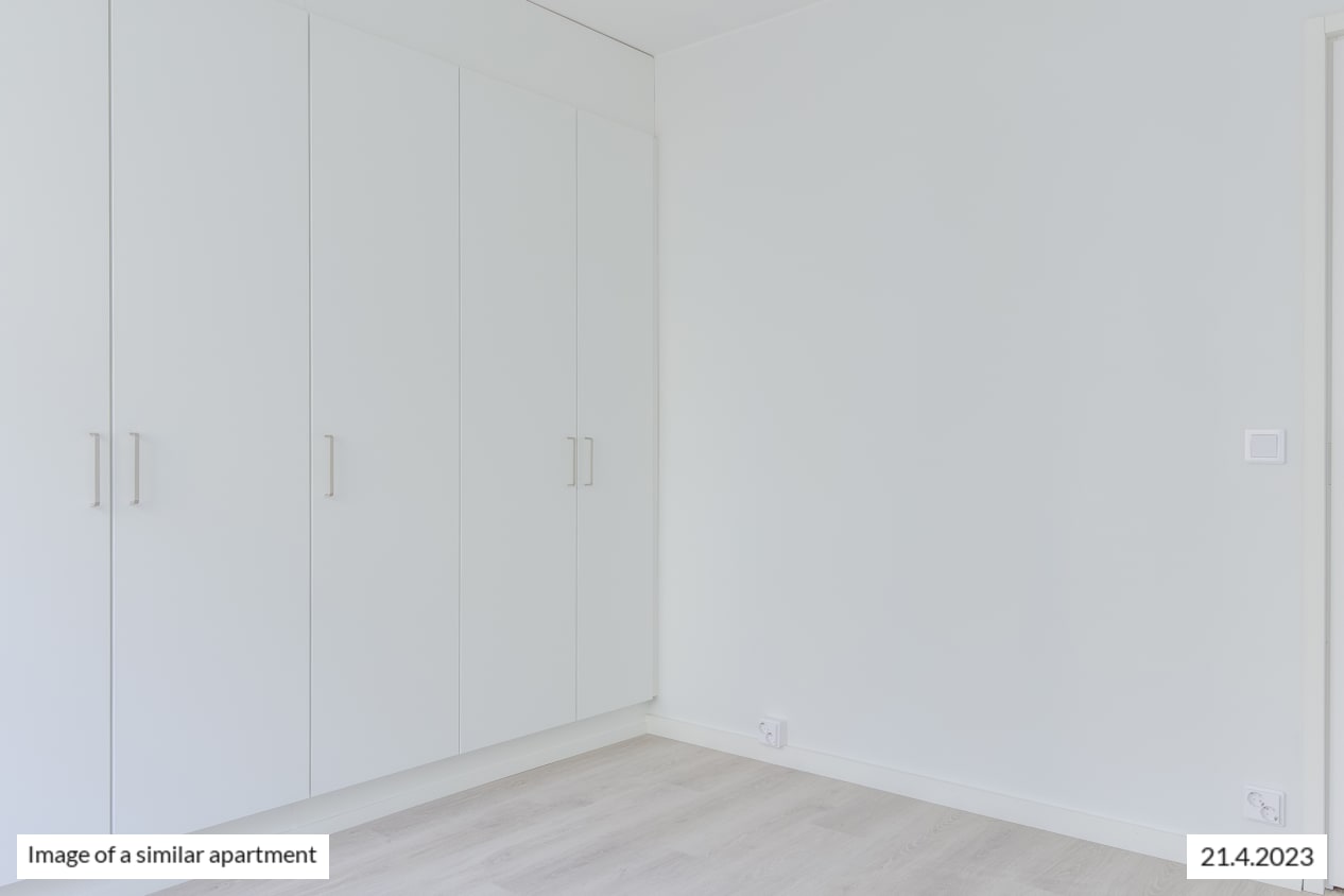 This smartly laid out two-bedroom home offers views of the building courtyard. The functional kitchen flows seamlessly into the living room. It is easy to separate the living space into lounging area and dining area and to extend the space to the glassed-in balcony in the summer. How about summertime breakfast on your balcony, listening to the homely sounds from the courtyard?