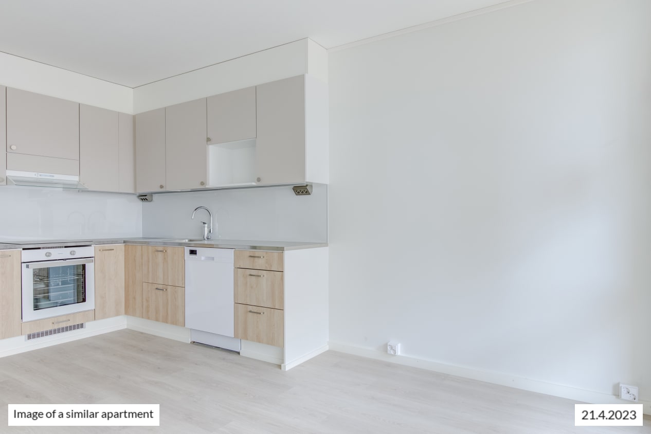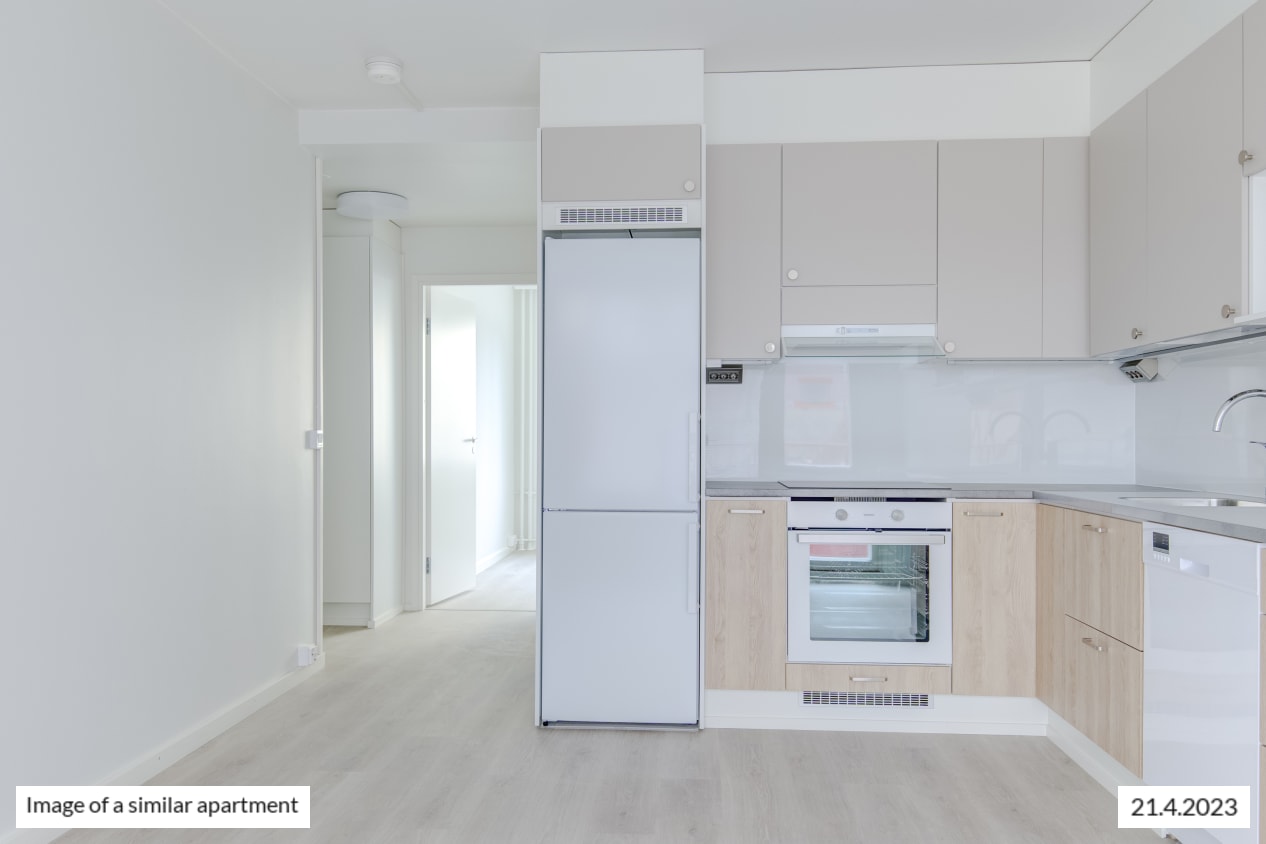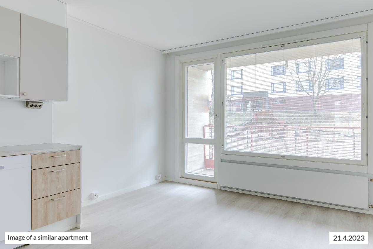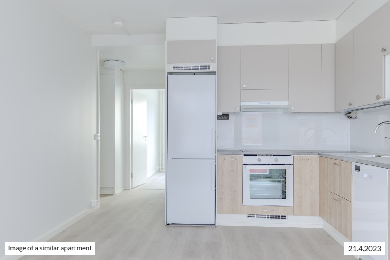 This smartly laid out two-bedroom home offers views of the building courtyard. The functional kitchen flows seamlessly into the living room. It is easy to separate the living space into lounging area and dining area and to extend the space to the glassed-in balcony in the summer. How about summertime breakfast on your balcony, listening to the homely sounds from the courtyard?