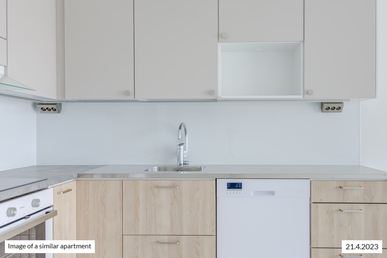 The pale surface materials of this home provide a neutral backdrop for your personal decor style. The floors are done in pale oak-effect laminate and the walls are painted in a pale shade. The windows are fitted with white Venetian blinds. The kitchens are fitted with beige and oak-coloured cabinets, the backsplash is done in pale composite panel and the countertops in grey textured laminate or stainless steel. The fully equipped kitchen has a ceramic cooktop with oven, cooker hood with lighting, dishwasher and fridge-freezer. There is also space for a microwave. This kitchen is a great place to cook for friends and family!