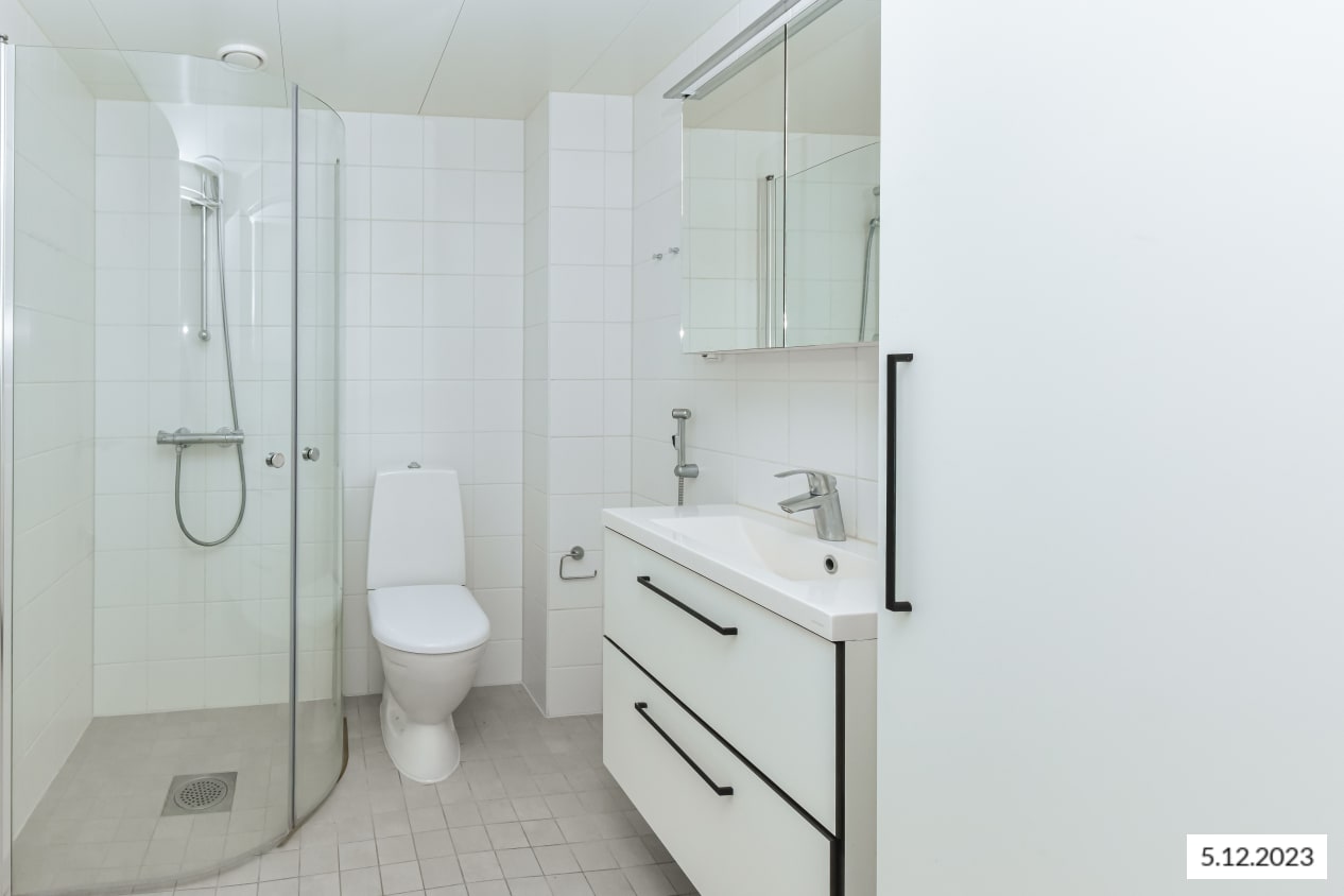 The bathroom features furniture from the Finnish Kide collection. Their material is very durable and attractive white solid laminate. The walls are tiled white, and the floor tiles are a broken white shade. There is provision for a washing machine.