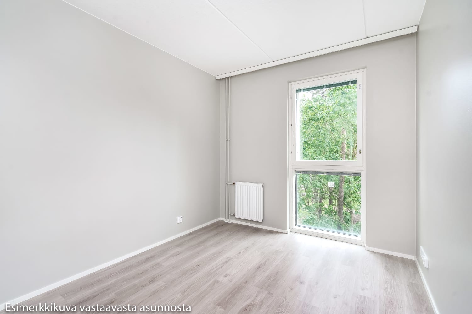 The floors in the living areas are light oak laminate. The walls are painted in a warm shade of light grey. The hallway and bedroom closets are white, and the windows have venetian blinds. The kitchen furniture is crisp white. The space between the upper and lower cabinets and the worktop are grey laminate. The kitchen is equipped with a freezer-refrigerator, dishwasher, ceramic hob, and extractor hood, with a provision for a microwave. The appliances are white.