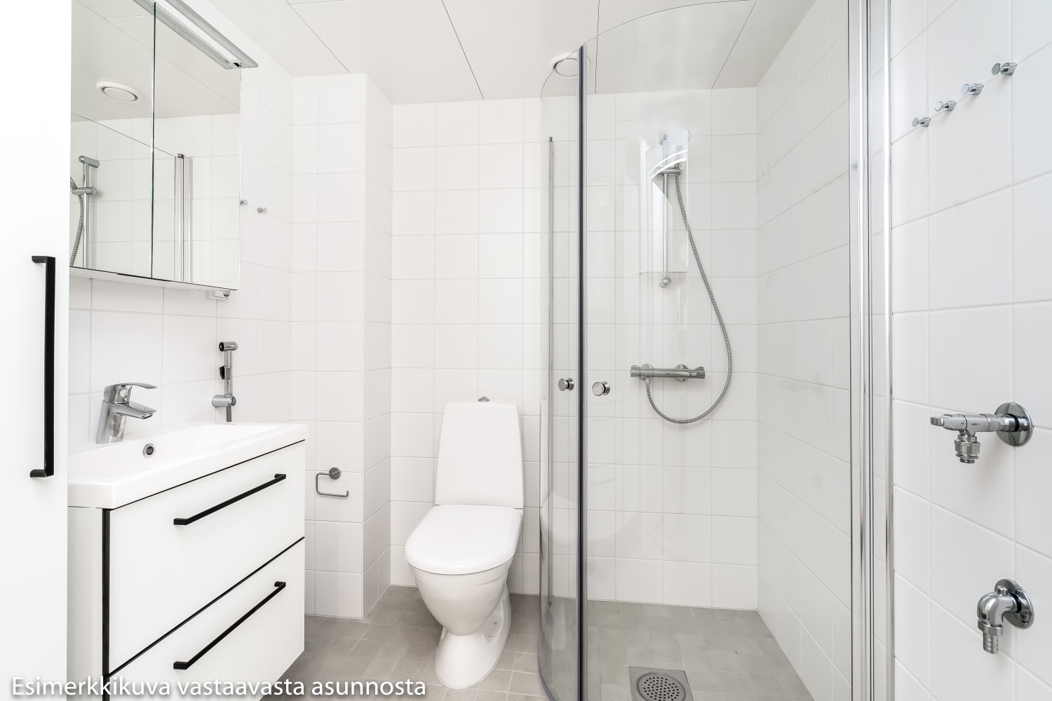 In the bathroom, the furniture is from the Finnish Kide collection. Their material is highly durable and beautifully white solid laminate. The walls are tiled in white, and the floor tile is a broken white shade. There is a provision for a washing machine.