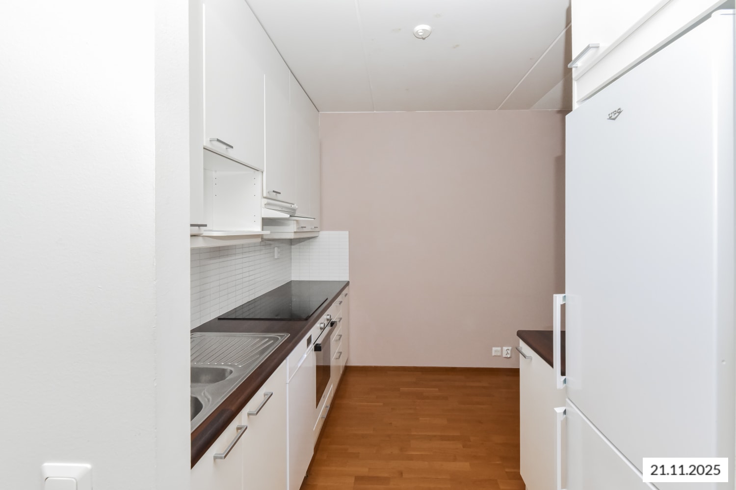 The kitchenette is equipped with sleek white cabinets and laminate countertops that mimic wenge wood. In addition to a fridge-freezer and dishwasher, the kitchenette includes an inset cooktop, a separate oven, and space for a microwave.