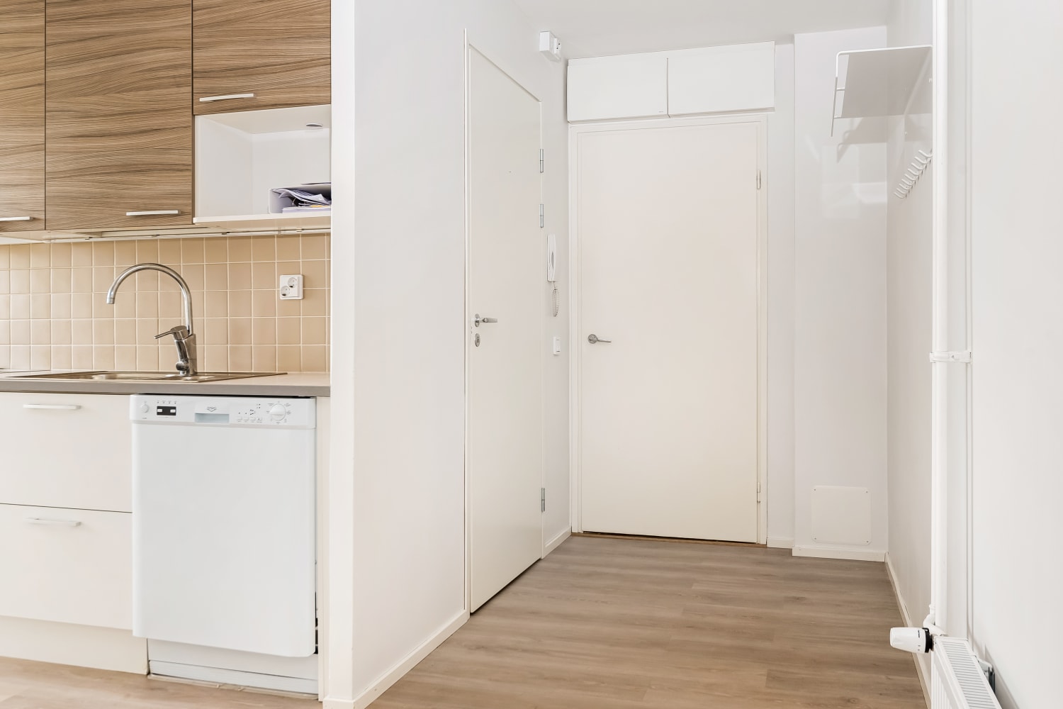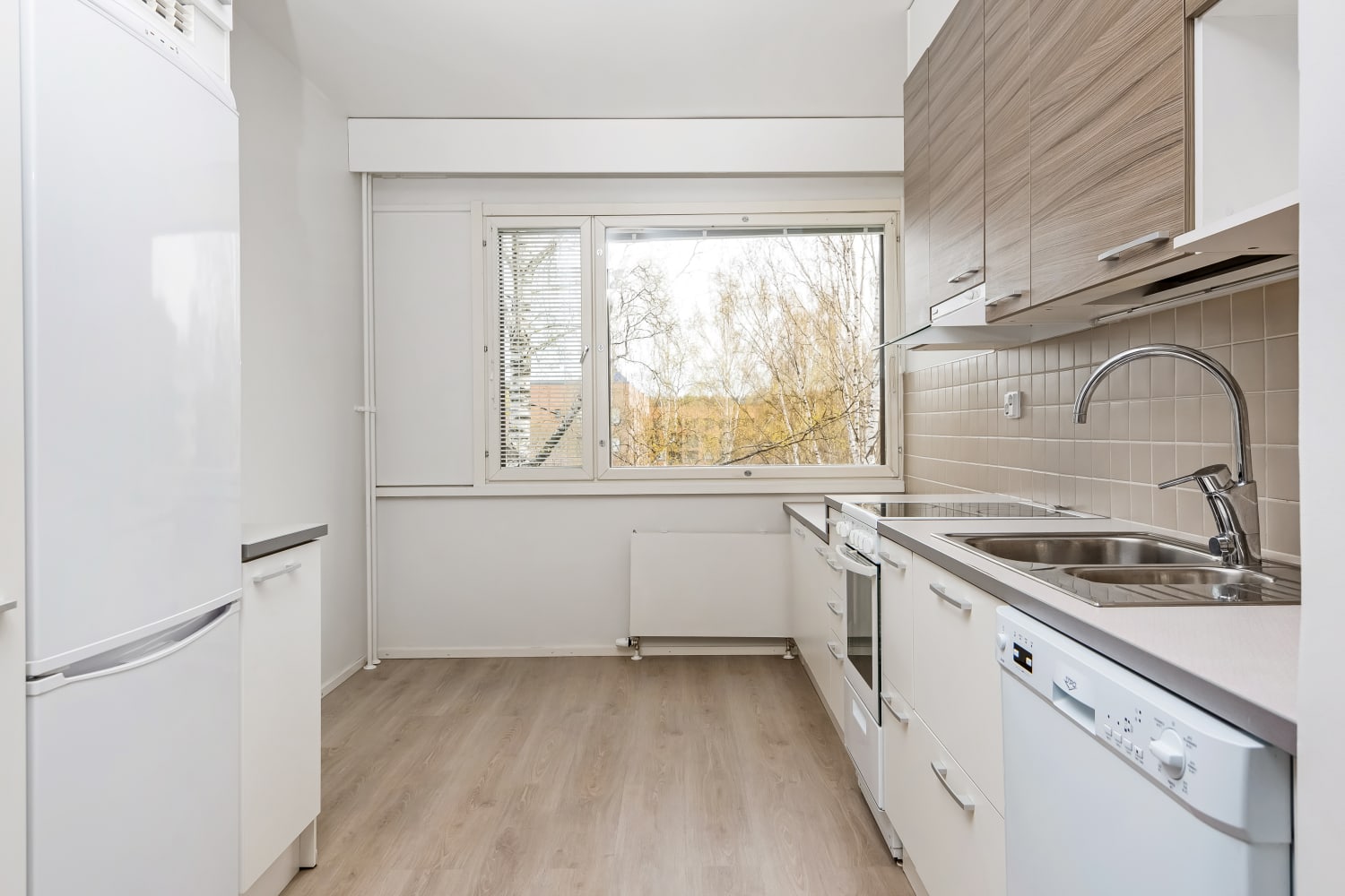 The apartment features light gray oak-effect laminate flooring. In the kitchen, the upper cabinets are gray wood-effect, while the lower and tall cabinets are a fresh white. The backsplash is tiled in gray, and the sink is set into a white and gray laminate countertop. The kitchen includes a ceramic stove, dishwasher, fridge-freezer, and a microwave reservation. The bright bathroom, with a window, features green wall tiles and gray floor tiles, complemented by white fixtures. There’s also space for a washing machine and dryer.