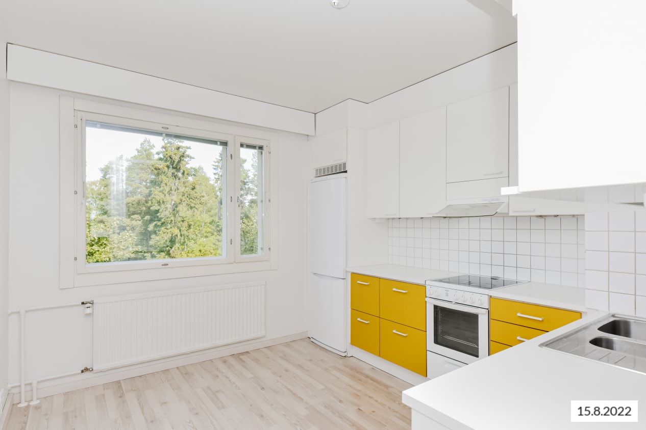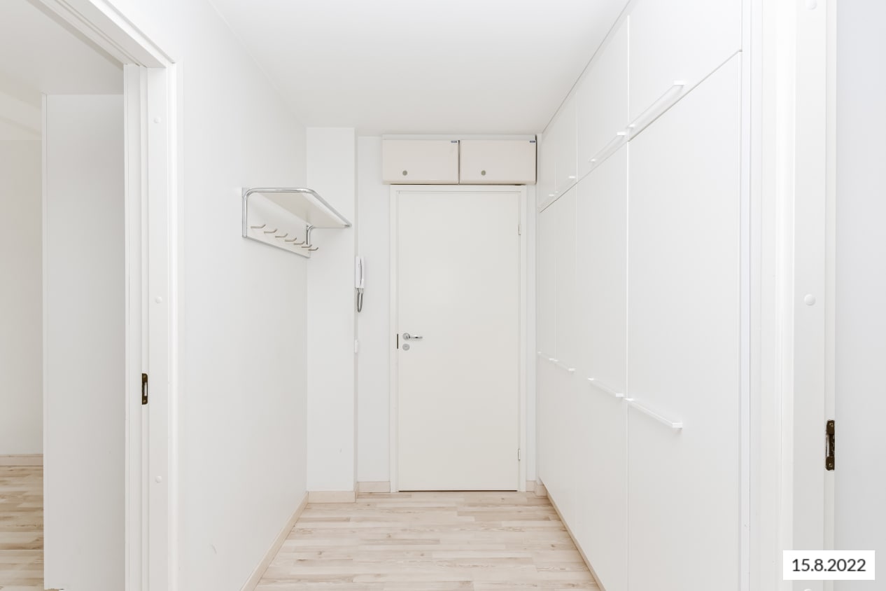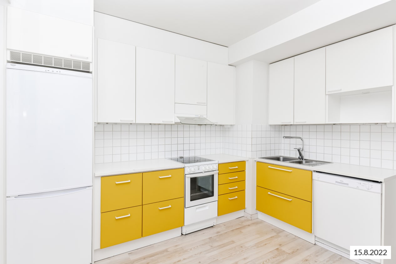 Two-bedroom home with a clean layout was given a fresh new look when renovated in 2015. The non-wet room floors are in durable pale ash laminate. The kitchen wall units are in white and the bottom units in beautiful yellow laminate. The splashback is laid in glossy white tiles, and the sink is recessed into the white laminate worktop. The kitchen units are complemented by white kitchen appliances: fridge-freezer, ceramic cooker and dishwasher. There is space for a microwave in the kitchen units.