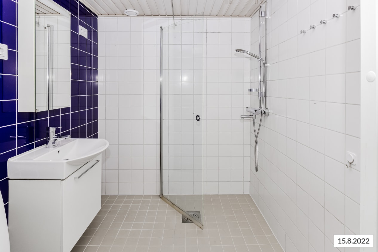 The bathroom is fully tiled. The calm white overall look of the bathroom is provided with an uplifting accent colour in cobalt blue. The beige floor has underfloor comfort heating and the shower cubicle features a handy folding glass wall. The bathroom has space and connections for a washing machine and dryer.