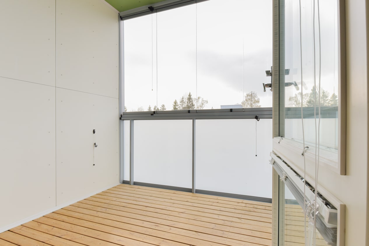 The layout of this bright little home is straightforward and functional. The kitchen area blends into the living spaces, leading to a glazed balcony that overlooks the yard. To accommodate storage for hobby equipment and other items, the apartment features approximately 2.5 square meters of storage space. There is no personal storage space in the basement or attic for belongings.