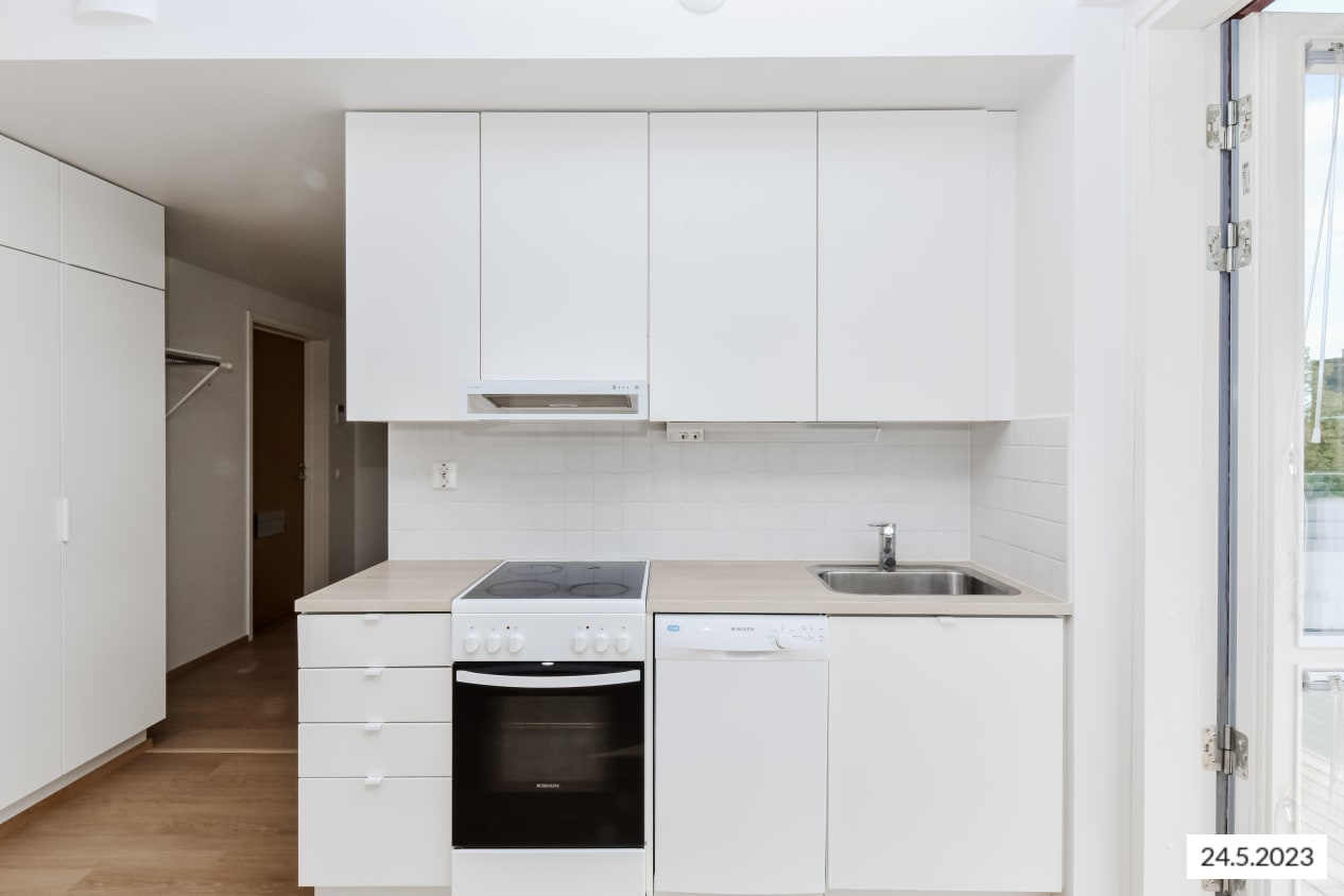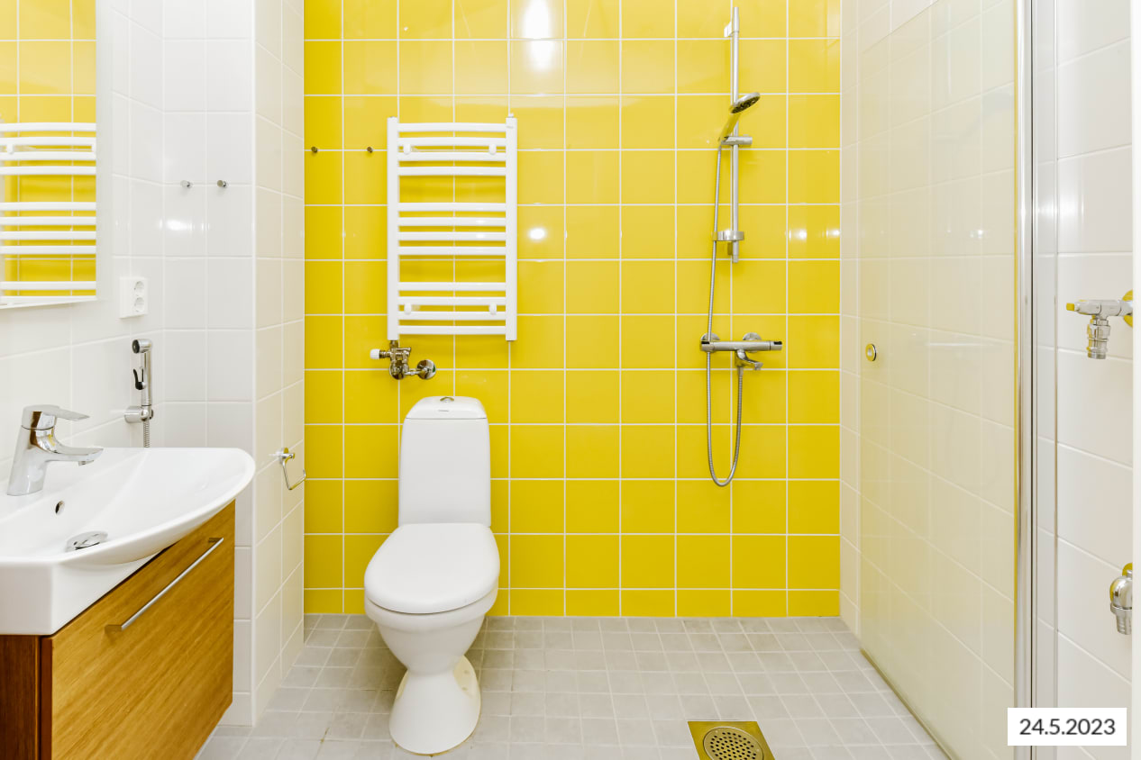 The floors in the living areas are made of oak laminate. The kitchen cupboard doors are crisp white and the space between the upper and lower cupboards is tiled with white tiles. The worktop is made of oak laminate in a matching colour to the floor. Fittings include a ceramic hob, dishwasher and refrigerators. The floors in the fully tiled bathrooms are a calm grey and the pale walls are enlivened by a pale yellow accent wall. There is space for a washing machine and tumble dryer.