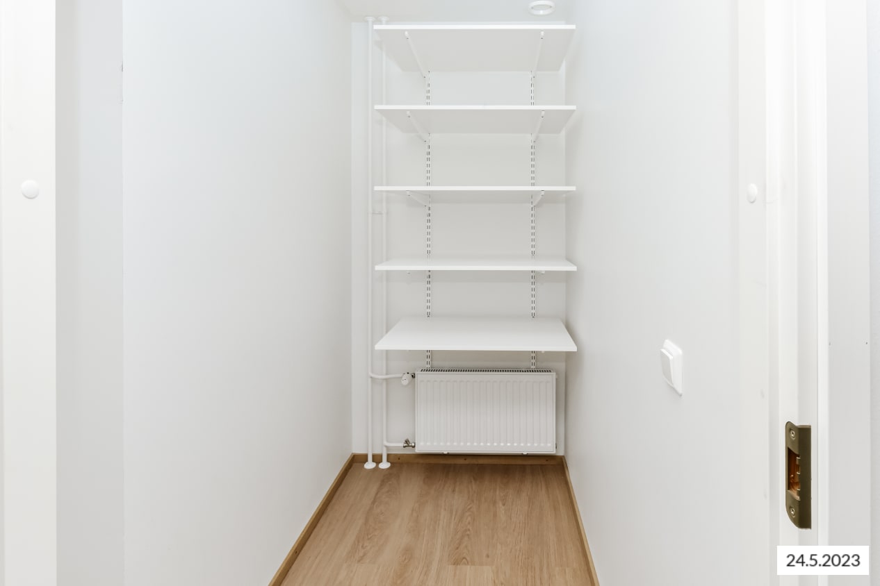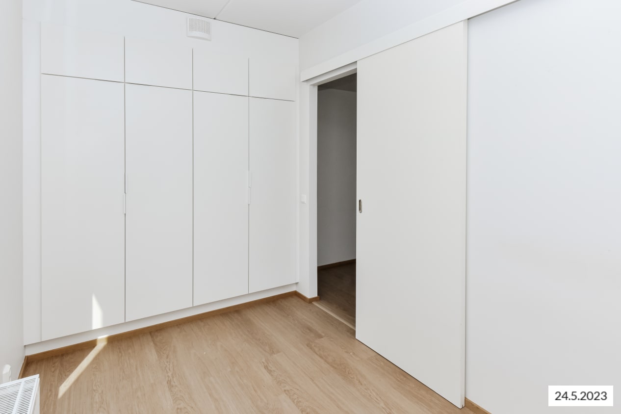 The kitchen area and living room of this beautiful one-bedroom form a clear and spacious living area. The living room opens onto a French balcony facing east. The bedroom is separated from the living room by space-saving sliding doors and is easily accessible from both sides of the bed. Inside, there is a storage room of about 2.5 m2 for hobby equipment and other items. There is no additional storage unit in the basement or attic.