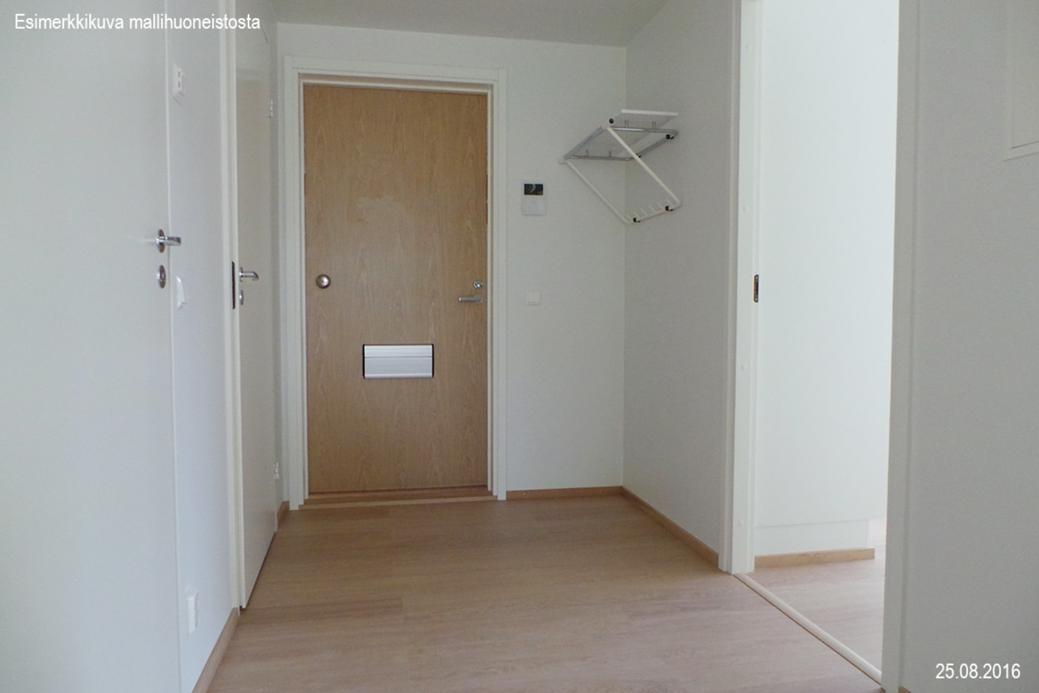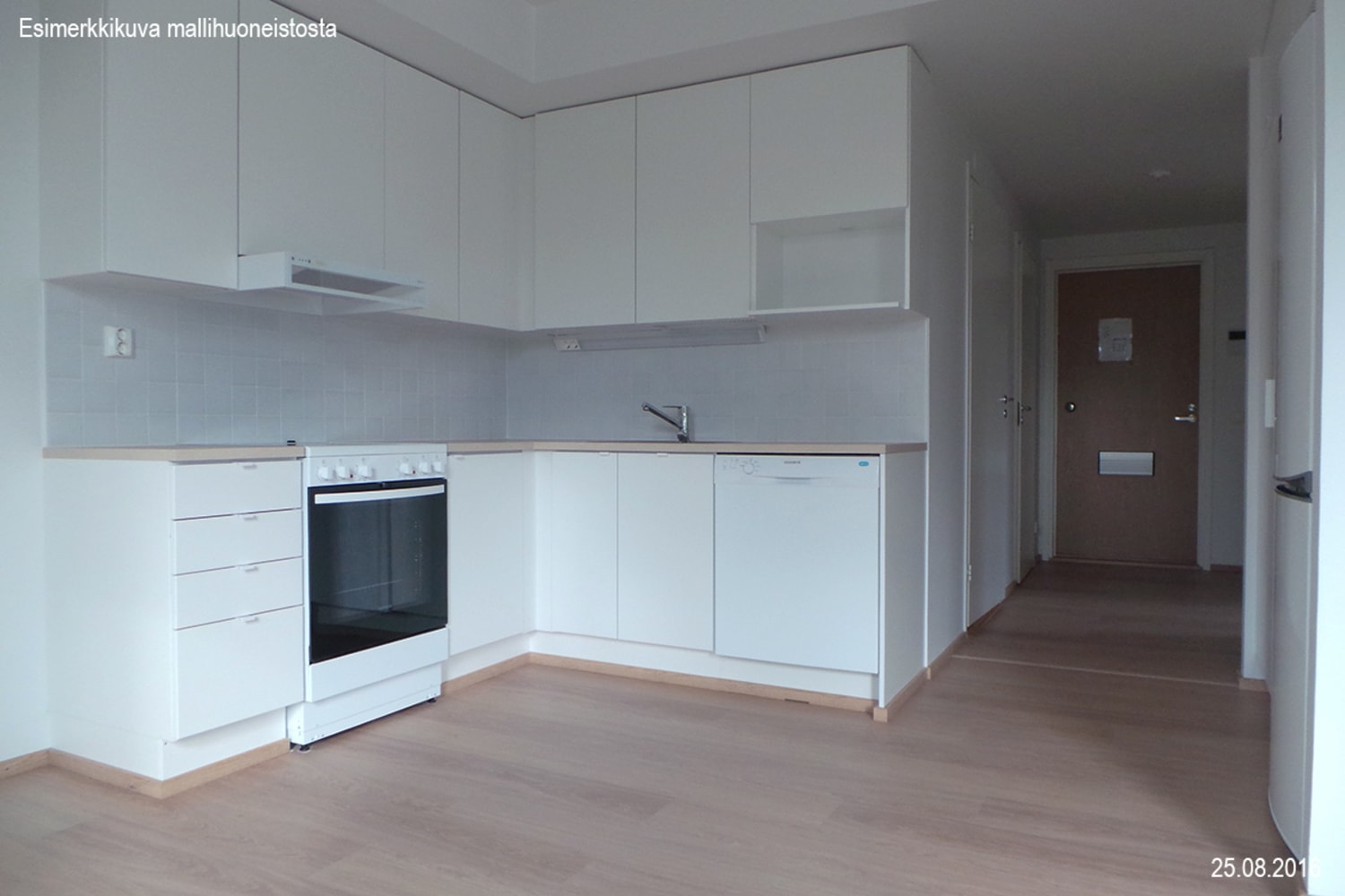 The floors of the living spaces are oak laminate. The kitchen cabinet doors are in fresh white, and the space between the upper and lower cabinets is tiled with white tiles. The worktop matches the floor's shade with its oak-toned laminate. The appliances include a ceramic stove, dishwasher, and refrigeration units. The floors of the fully tiled bathrooms are in calm grey, and the light walls are enlivened by a water-green accent wall. There is space and hookups reserved for a washing machine and a tumble dryer.
