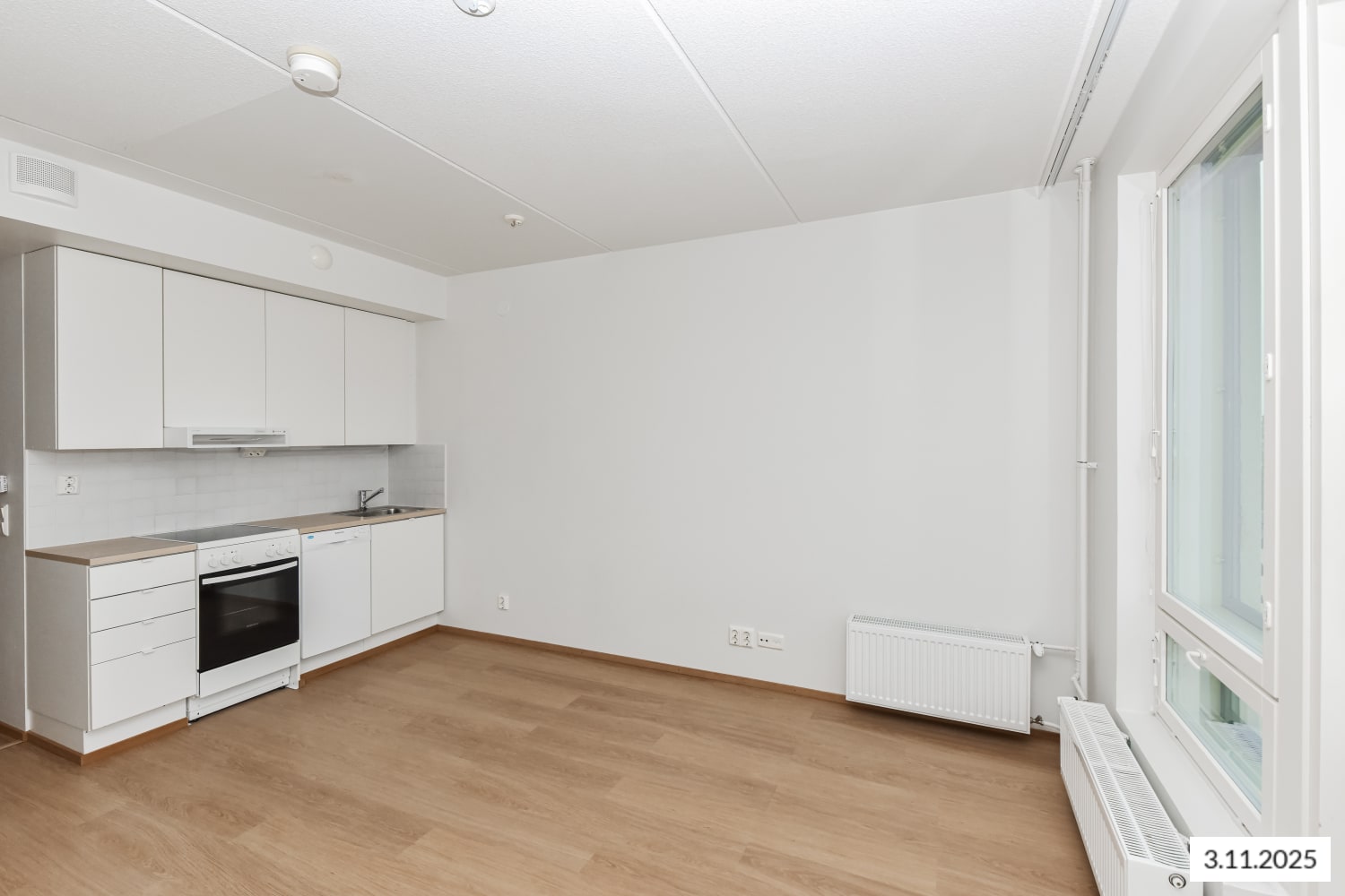 The doors of the kitchen cabinets are in crisp white, and the space between the upper and lower cabinets is tiled with white tiles. The worktop is oak-toned laminate, matching the floor's shade. The equipment includes a ceramic stove, dishwasher, and refrigeration appliances.