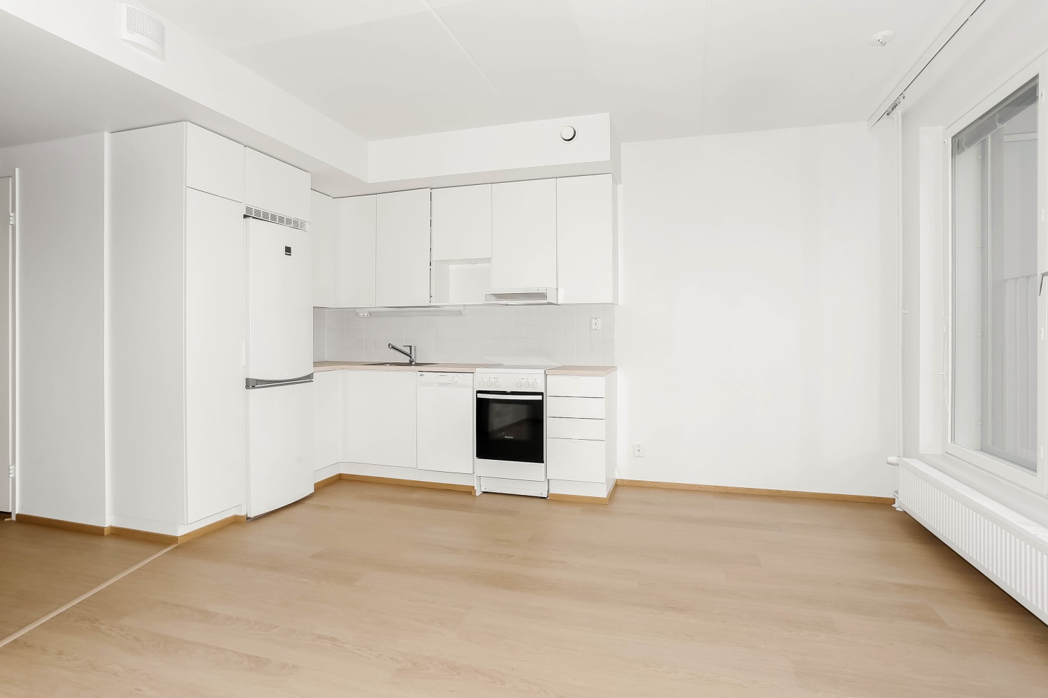 The floors of the living spaces are oak laminate. The kitchen cabinet doors are in fresh white, and the space between the upper and lower cabinets is tiled with white tiles. The worktop matches the floor's shade with its oak-toned laminate. The appliances include a ceramic stove, dishwasher, and refrigeration units. The floors of the fully tiled bathrooms are in calm grey, and the light walls are enlivened by a water-green accent wall. There is space and hookups reserved for a washing machine and a tumble dryer.