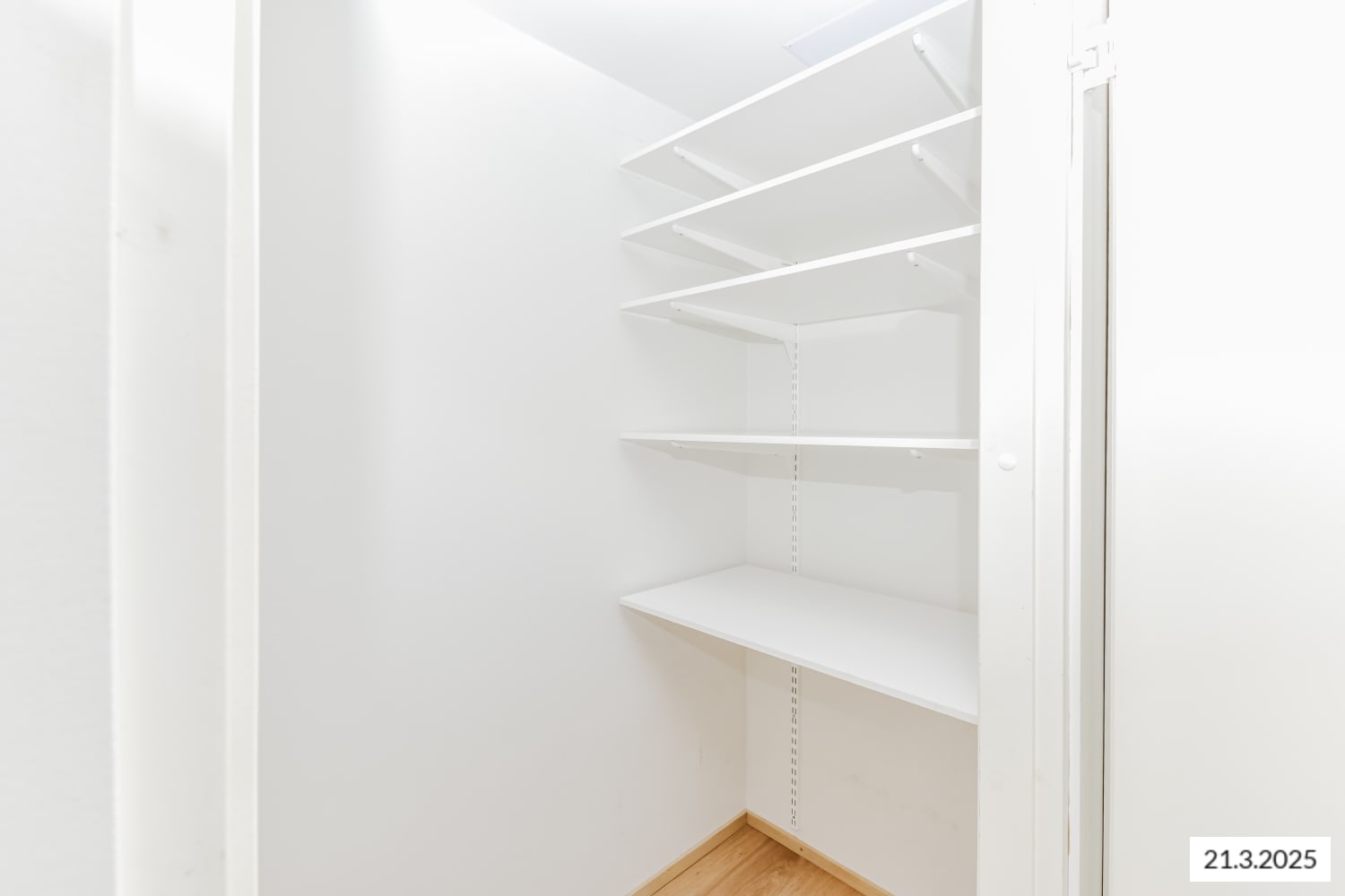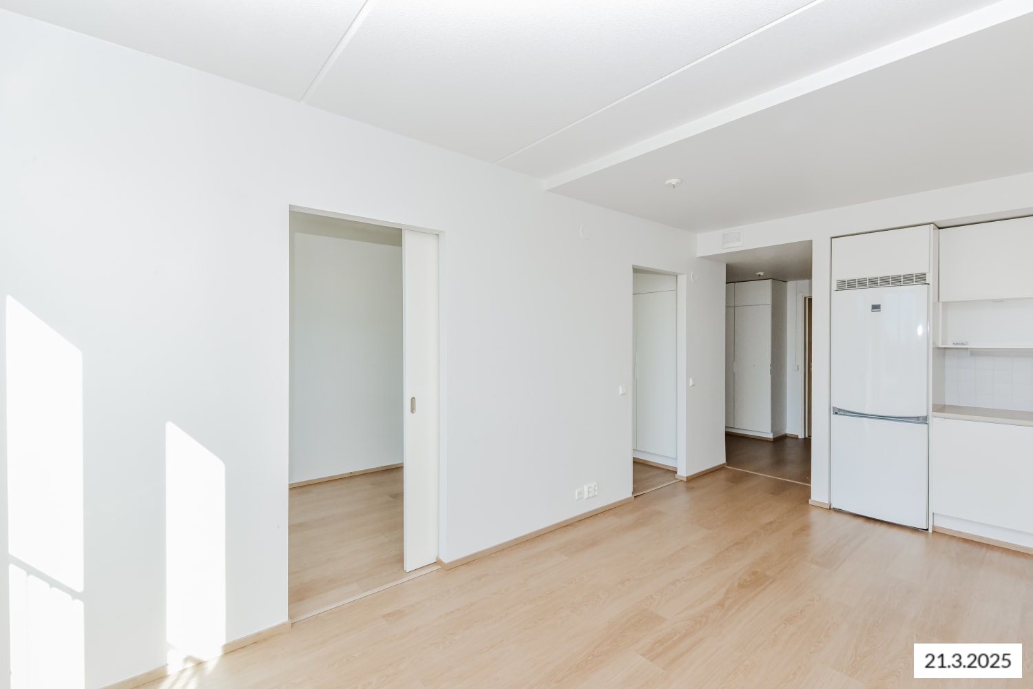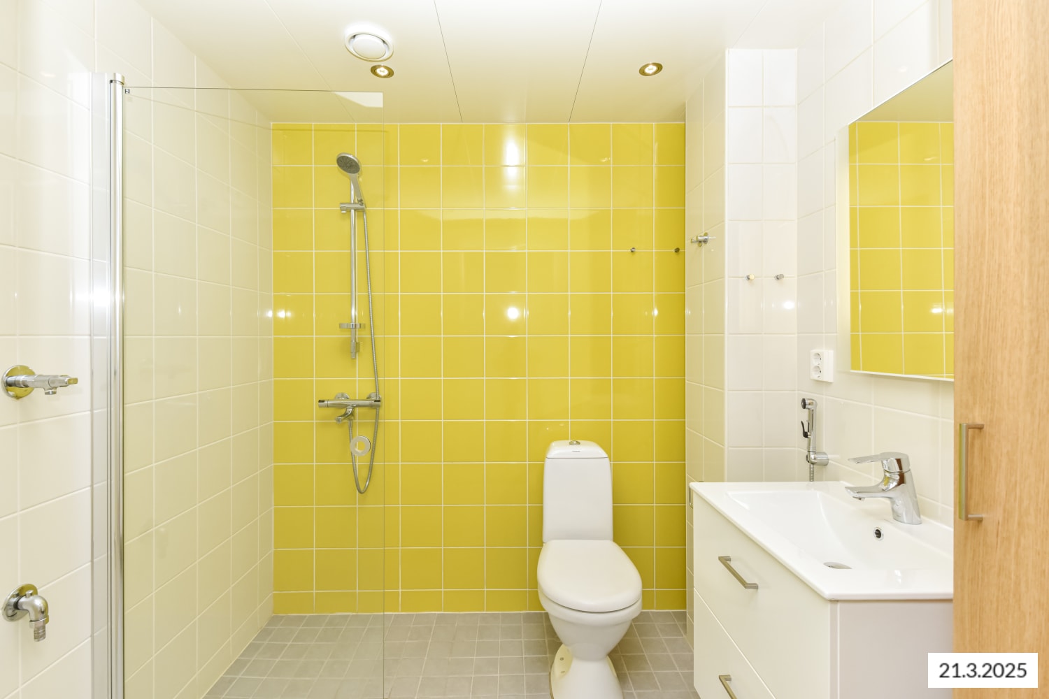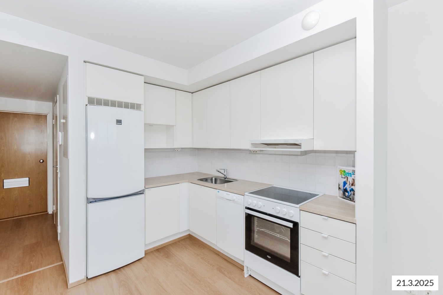 The floors of the living spaces are oak laminate. The doors of the kitchen cabinets are crisp white, and the space between the upper and lower cabinets is tiled with white tiles. The worktop is oak-toned laminate, matching the floor's shade. The equipment includes a ceramic stove, dishwasher, and refrigeration appliances. The floors of the fully tiled bathrooms are calm grey, and light walls are enlivened by a pale yellow accent wall. There is a place for a washing machine and tumble dryer.