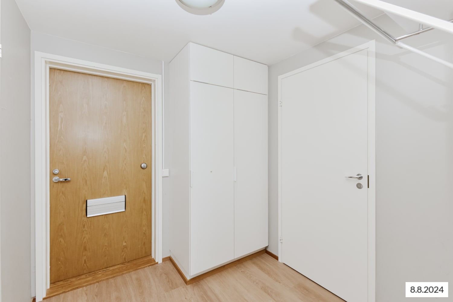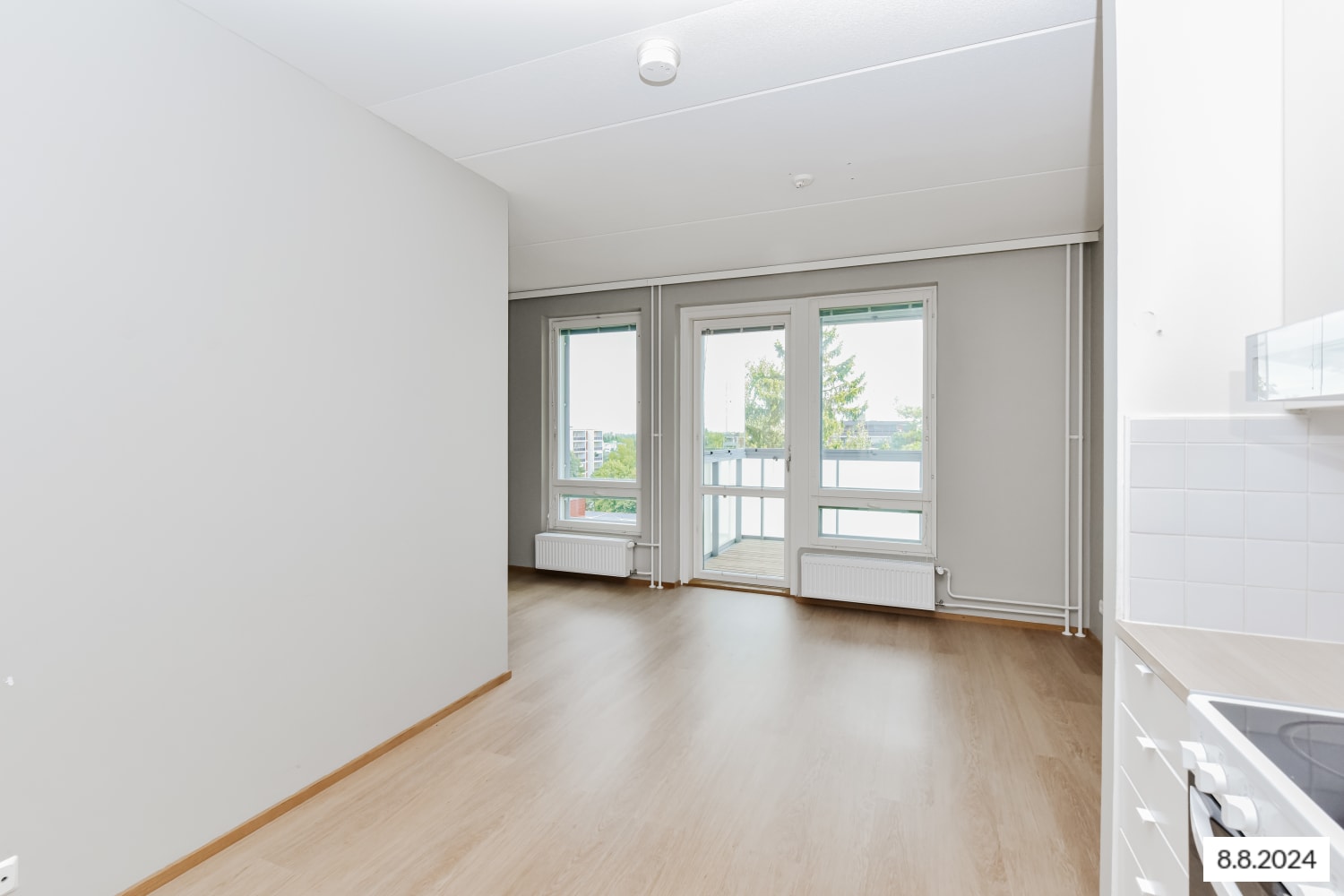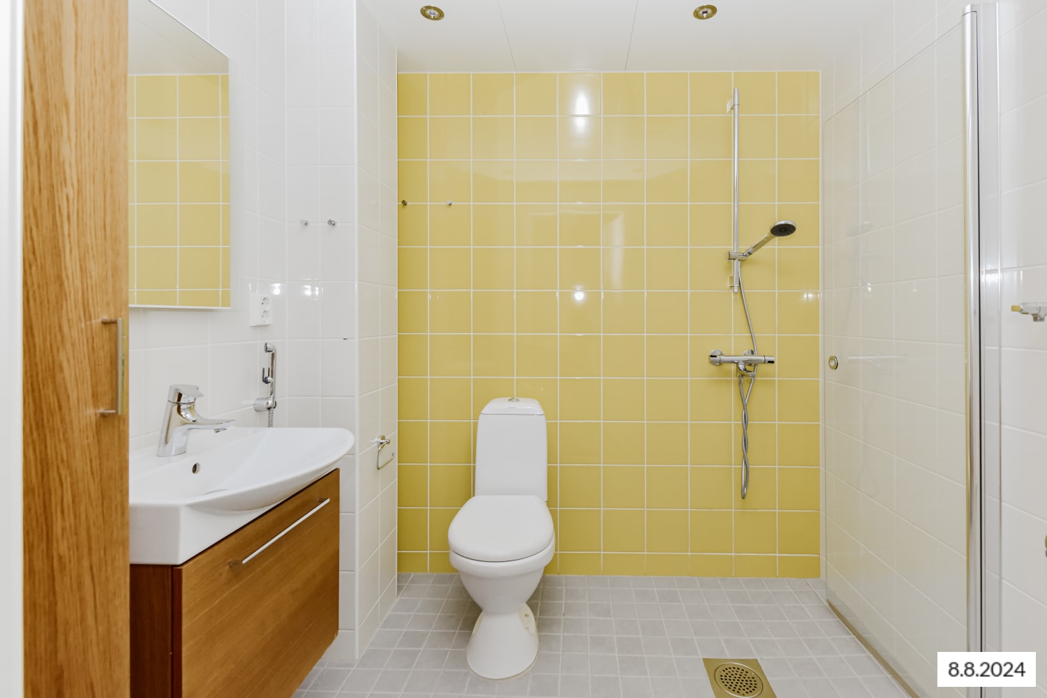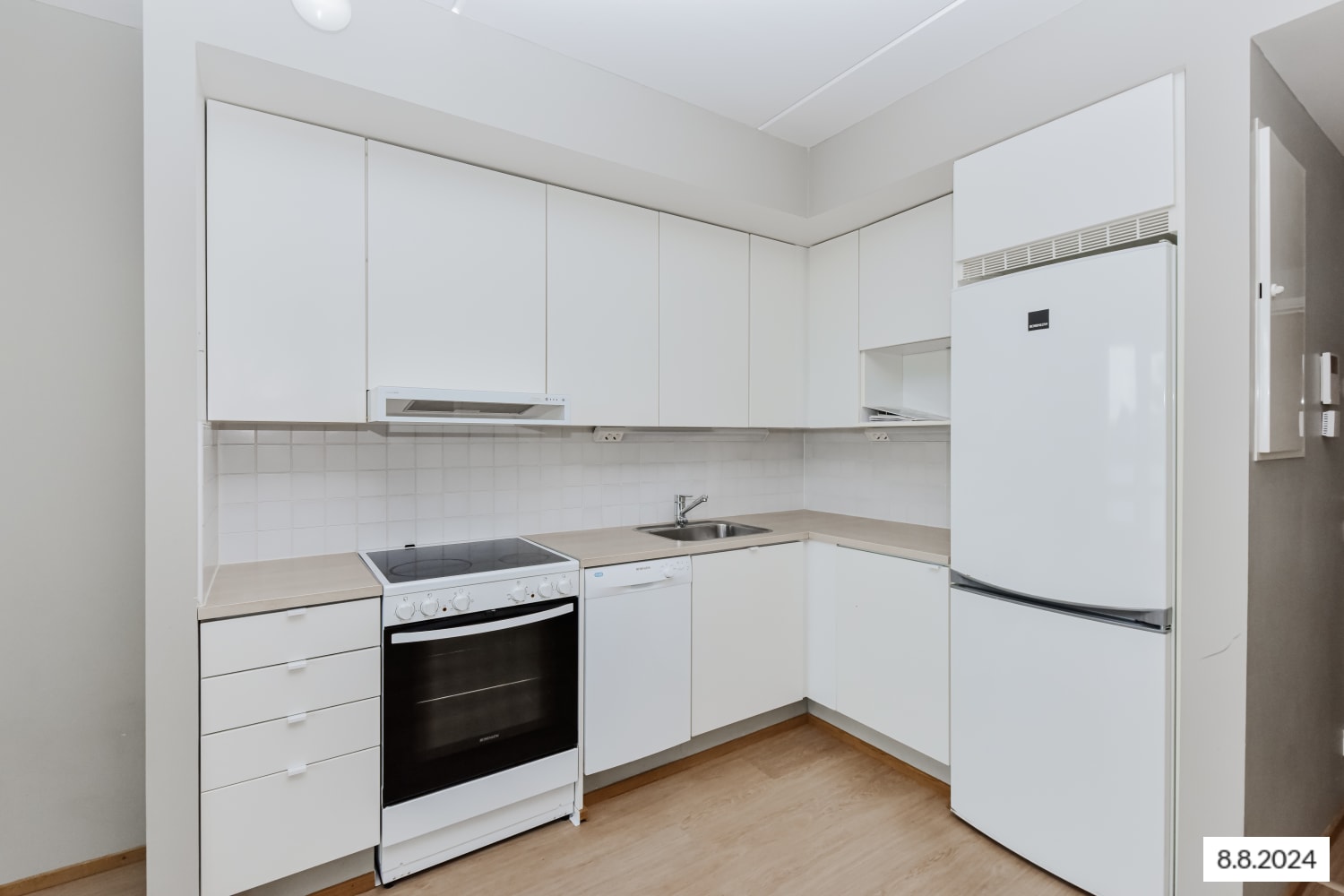 The floors of the living spaces are oak laminate. The kitchen cabinet doors are in fresh white, and the space between the upper and lower cabinets is tiled with white tiles. The worktop matches the floor's shade with its oak-toned laminate. The appliances include a ceramic stove, dishwasher, and refrigeration units. The floors of the fully tiled bathrooms are in calm grey, and the light walls are enlivened by a pale yellow accent wall. There is space and hookups reserved for a washing machine and a tumble dryer.