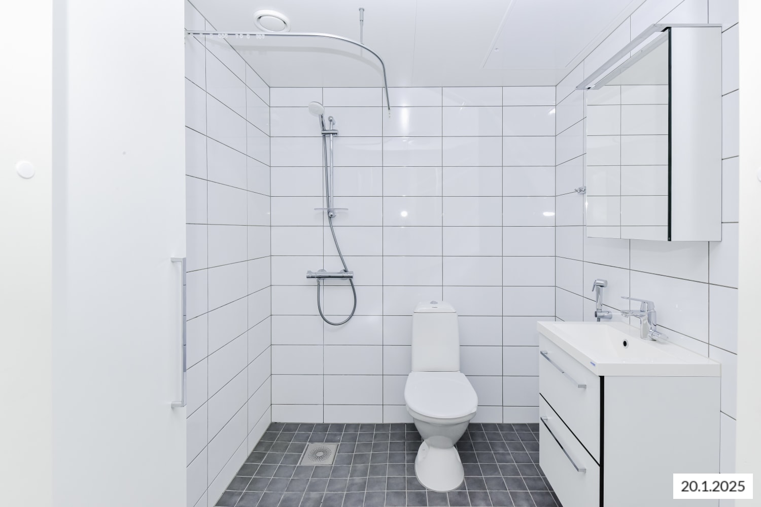 Completed in autumn 2021, the studio apartment is clean and timelessly beautiful. The kitchen and living room are combined into an open-plan living area, with large, opening windows for airiness and natural light. The home is finished in light-coloured finishes to suit all tastes. The flooring is light oak laminate and the walls are painted white. The open-plan kitchen has white, wood-panelled cabinets. The space between the upper and lower cupboards and the worktop are grey laminate. Fittings include a ceramic hob, cooker hood, fridge-freezer and dishwasher. The appliances are white. The bathroom is fitted with white SATO Kide furniture and space for a washing machine. The walls are white tiles and the floor is grey.