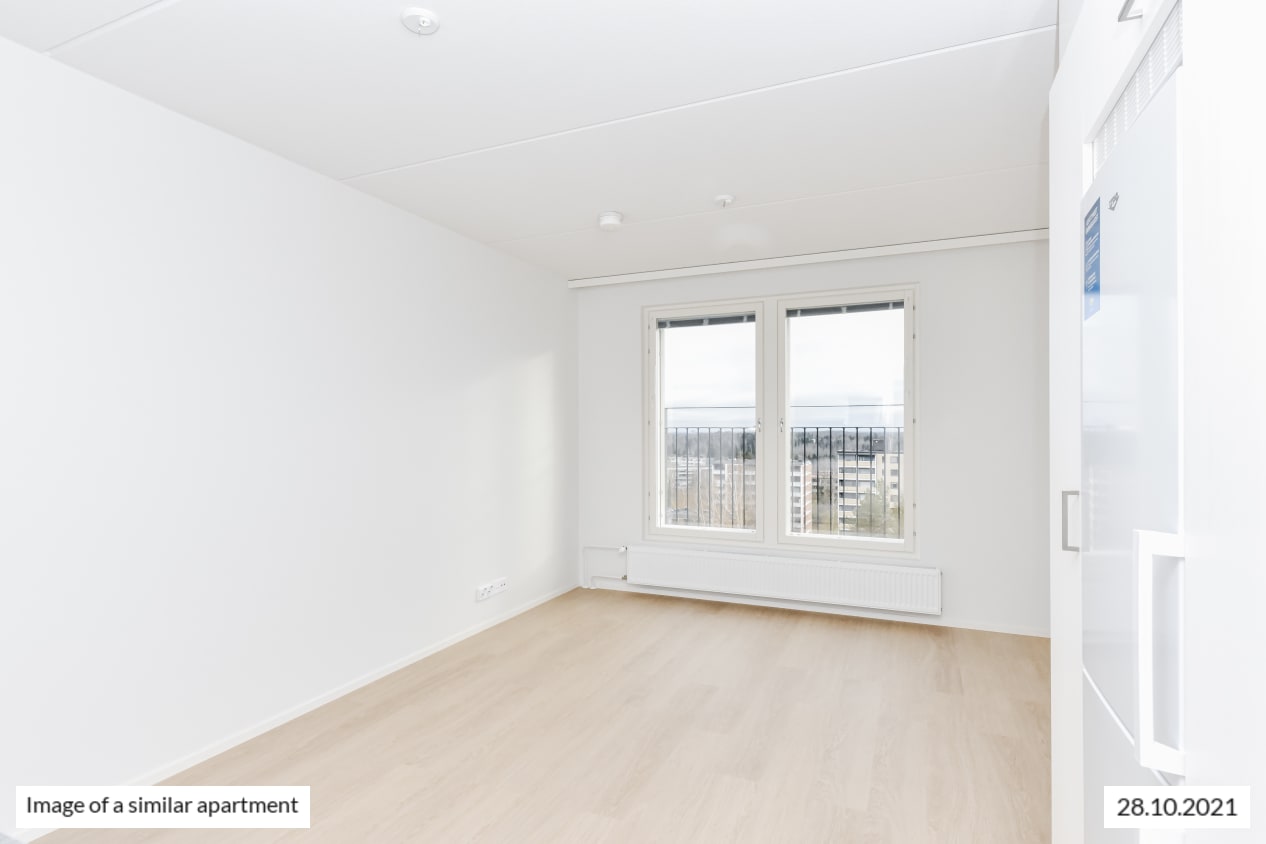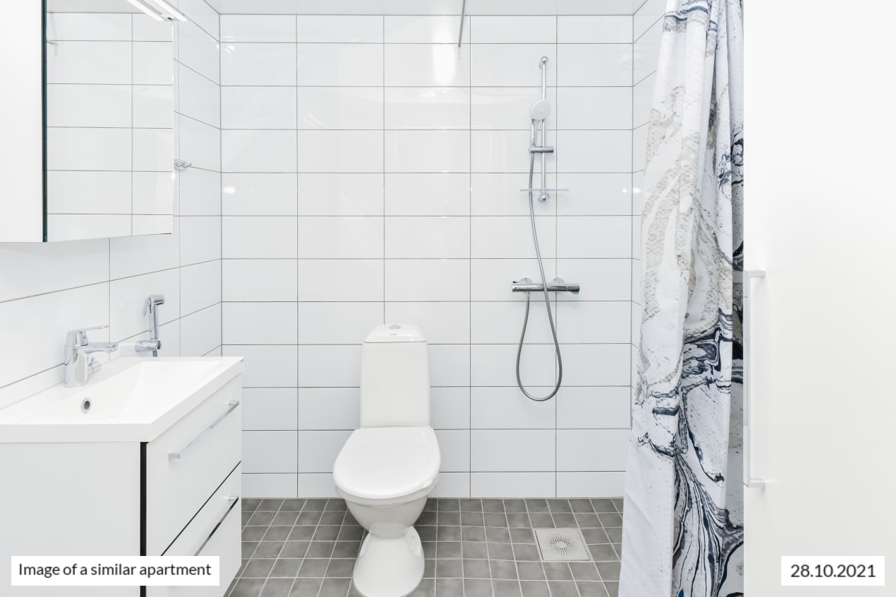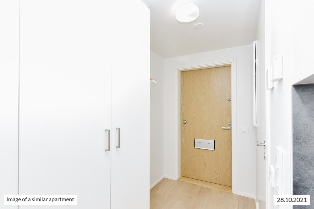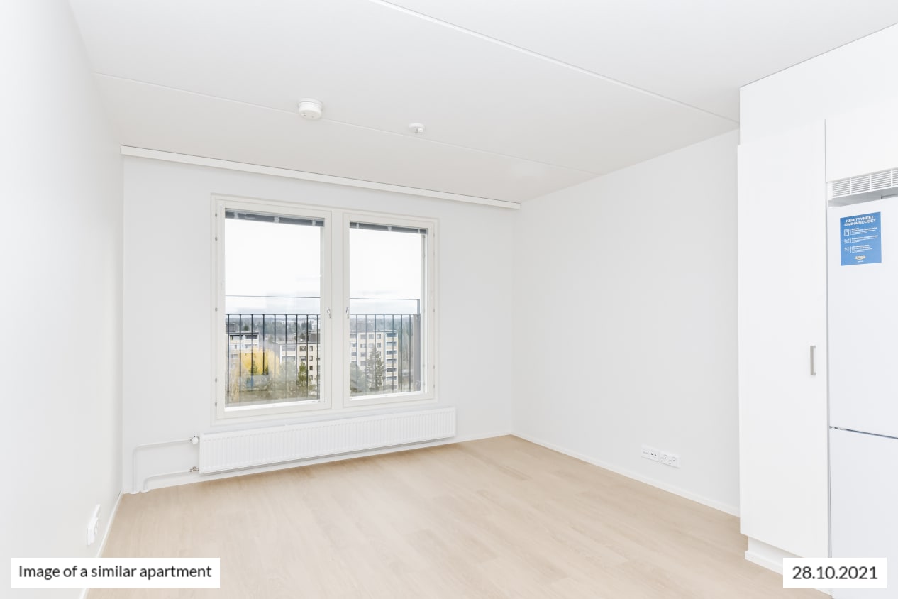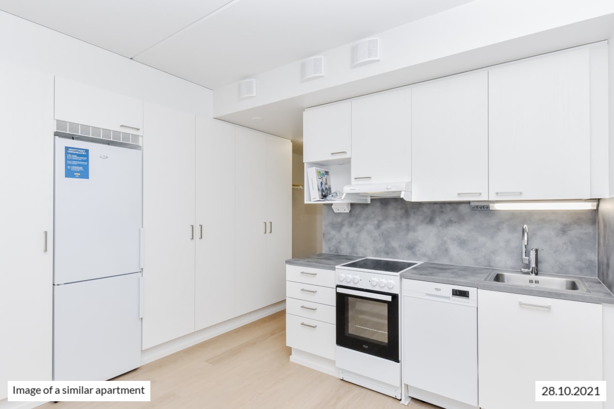 Completed in autumn 2021, this studio apartment is clean and timelessly beautiful. The kitchen and living room are combined into an open-plan living area, with large, opening windows for airiness and natural light. The home is finished in light-coloured finishes to suit all tastes. The flooring is light oak laminate and the walls are painted white. The open-plan kitchen has white, wood-panelled cabinets. The space between the upper and lower cupboards and the worktop are grey laminate. Fittings include a ceramic hob, cooker hood, fridge-freezer and dishwasher. The appliances are white. The bathroom is fitted with white SATO Kide furniture and space for a washing machine. The walls are white tiles and the floor is grey.